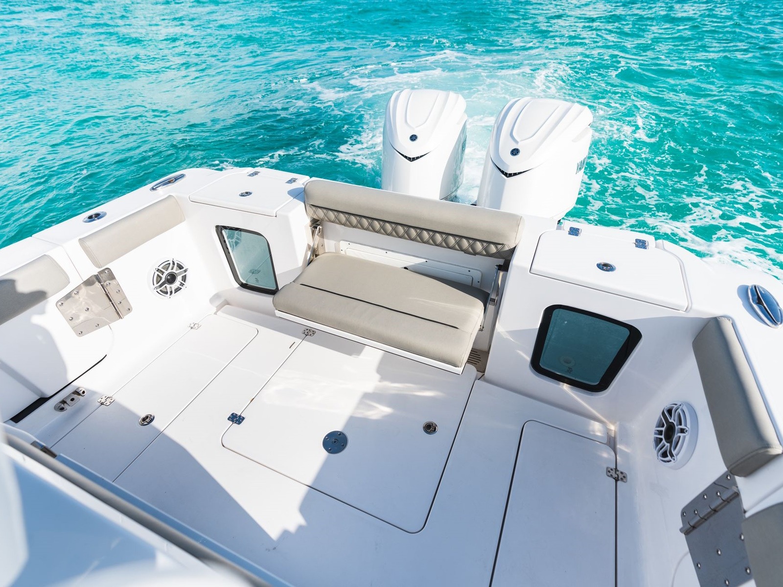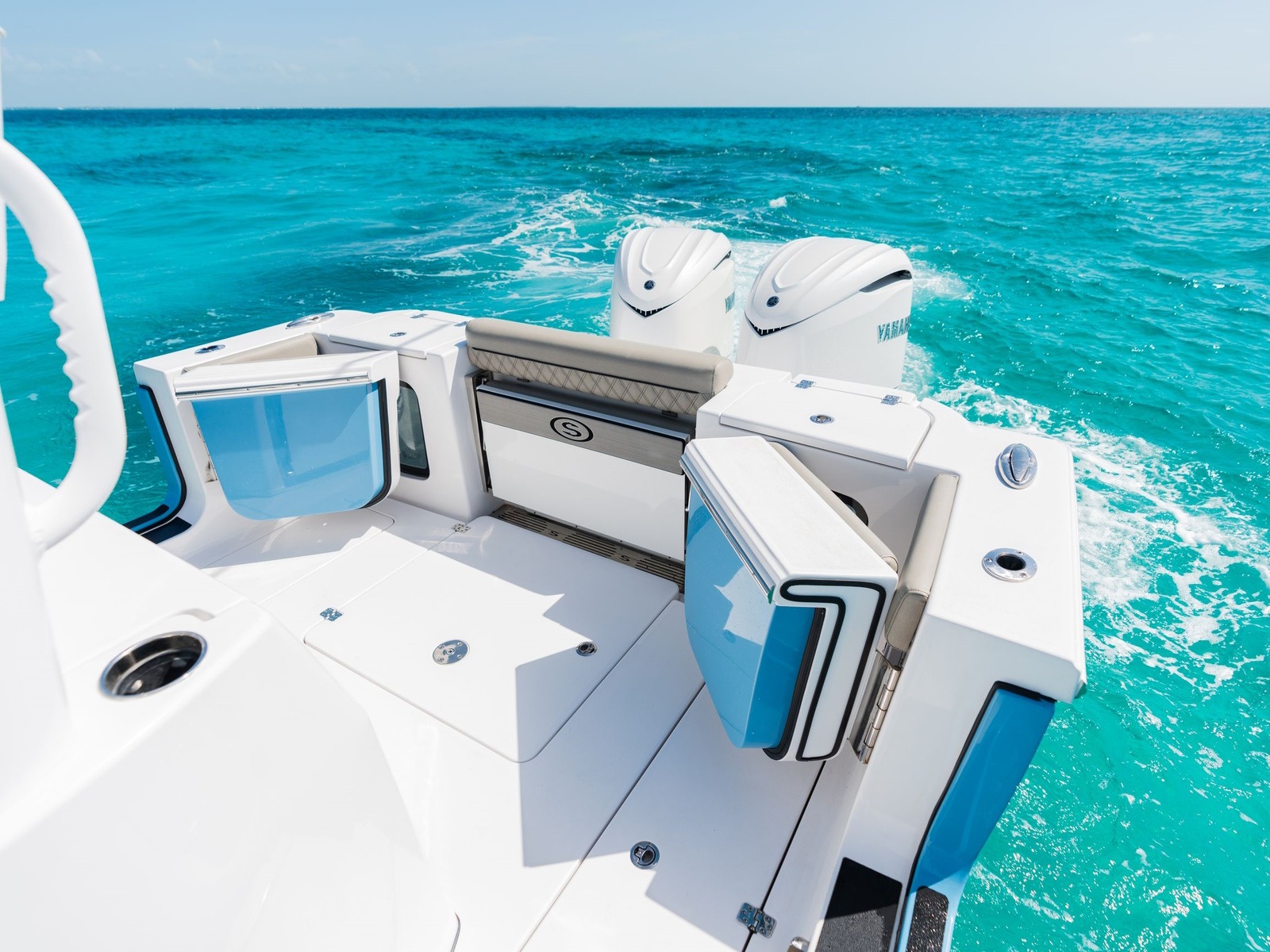 - On either side of the leaning post, you will find a pair of 225-quart insulated and macerated in-deck fish boxes.