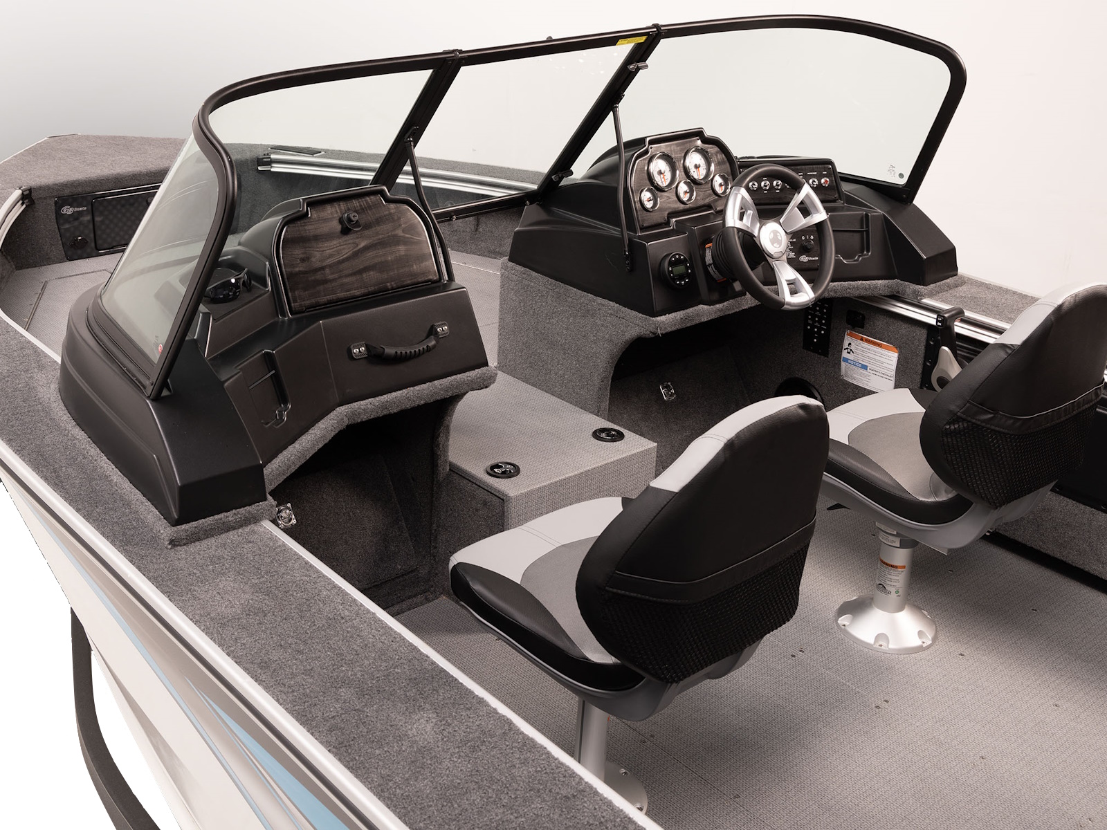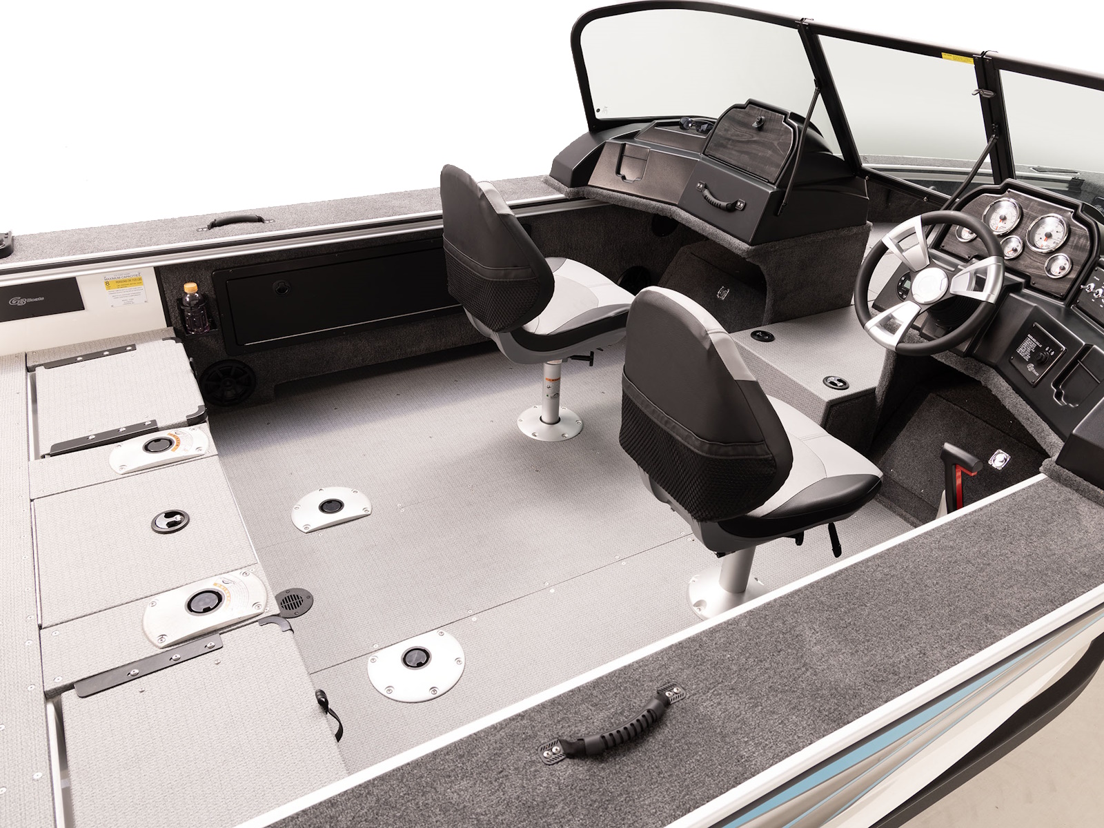 Cockpit gives the captain and passenger plenty of leg room and storage. Fishing seats can be moved to bow or stern pedestal locations.