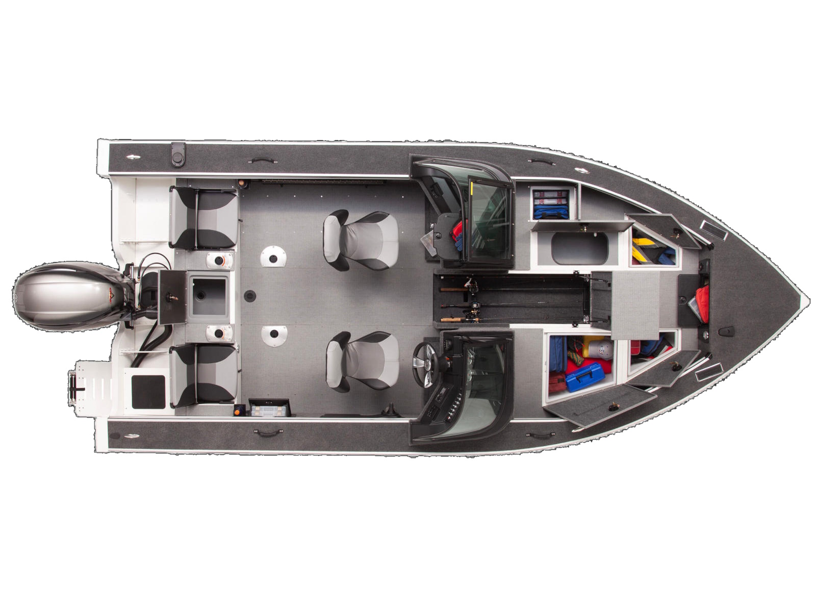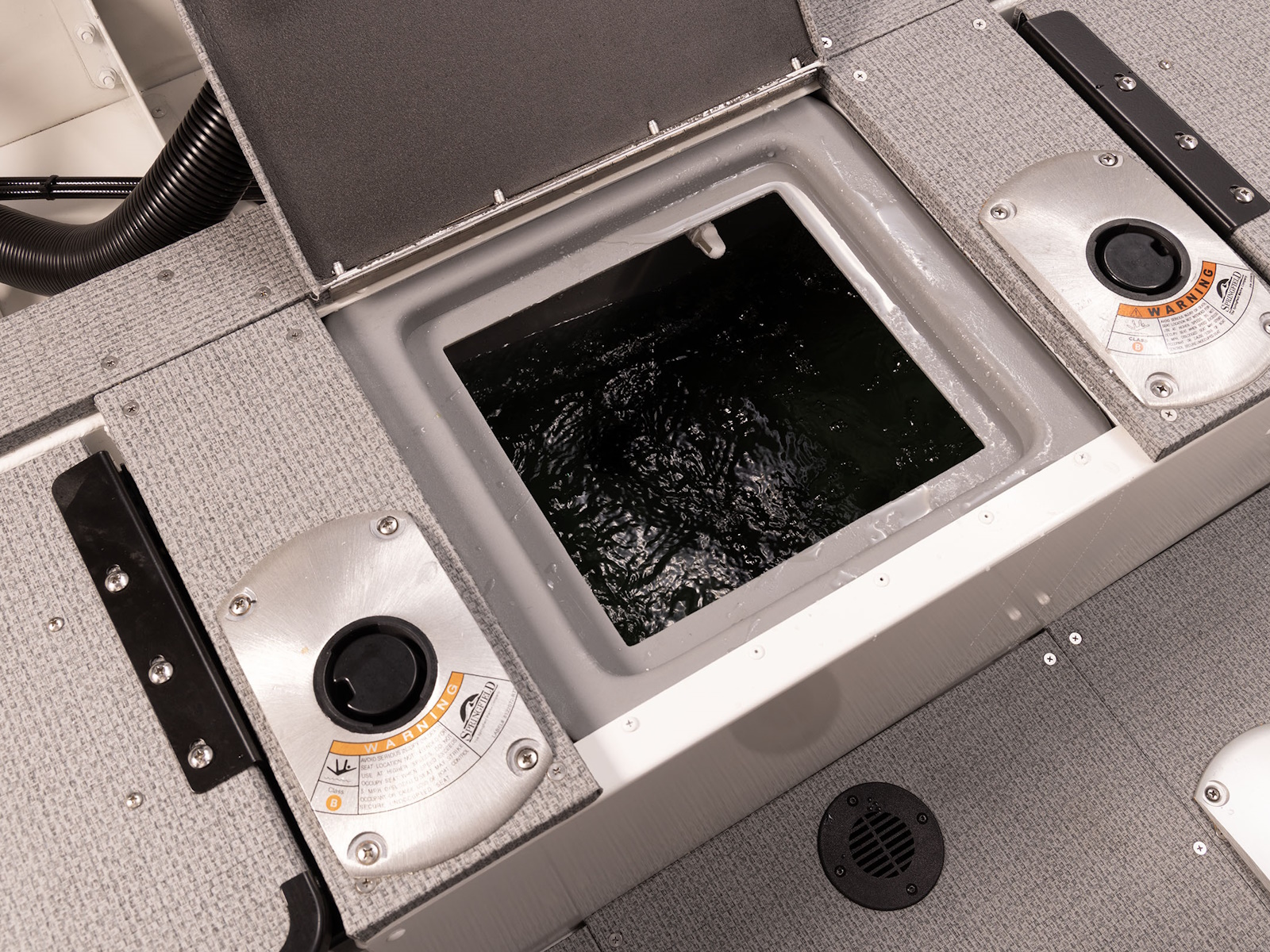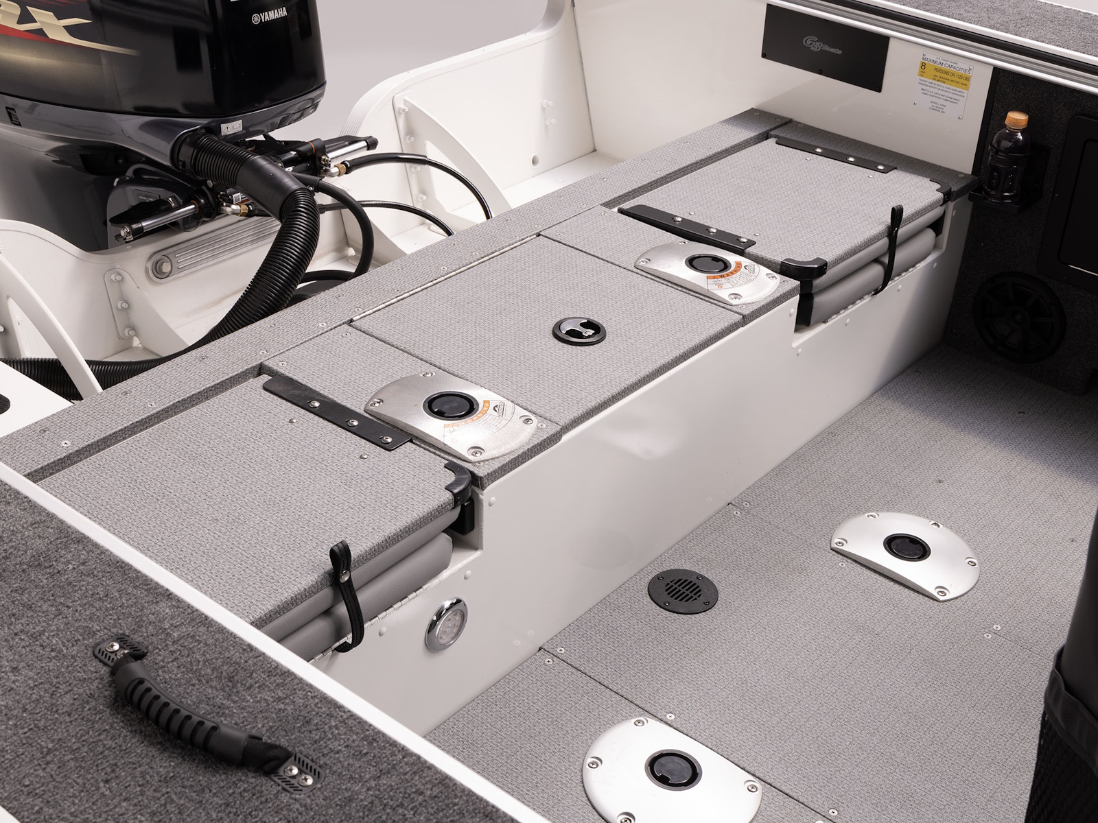 Stern layout provides two jump seats for extra passengers and a livewell. When in the down position it allows for a casting deck with two chair positions for the angler.