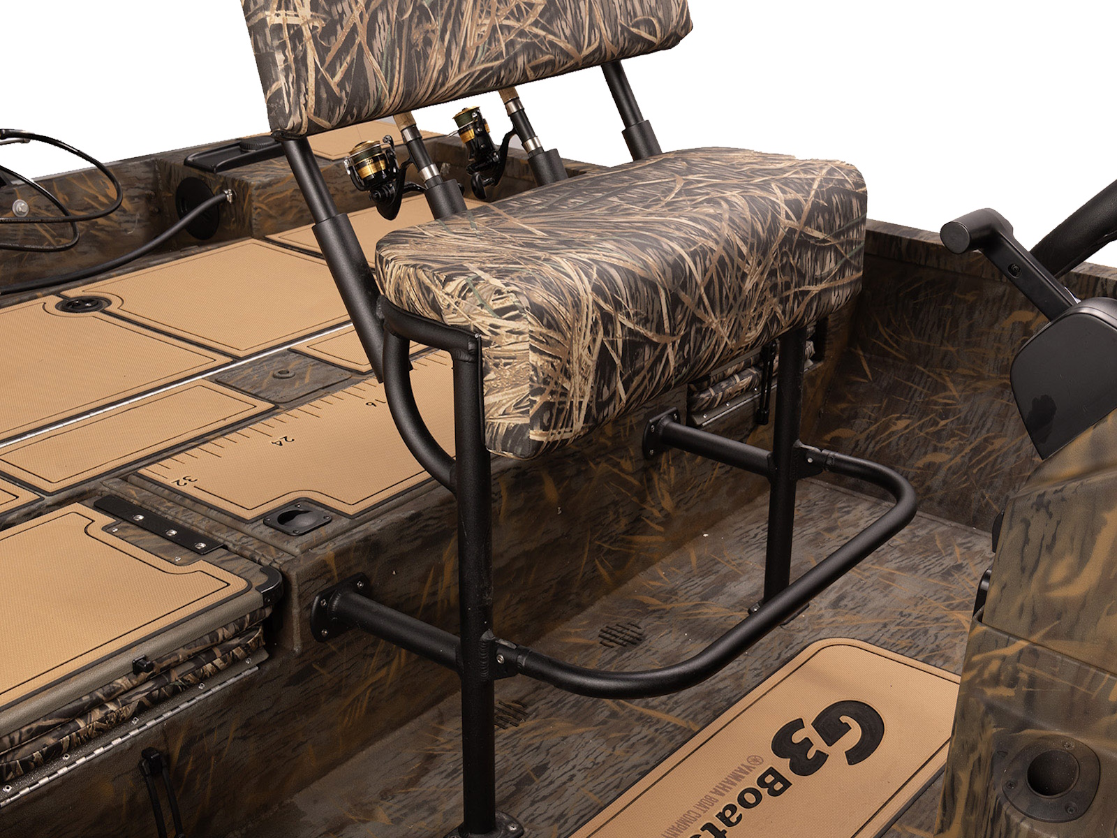 The lean post is shown with the standard back rest. The addition of two rod holders gives the angler plenty of fishability. Shown here with optional SeaDek®. A 45 quart cooler fits behind the foot rest.