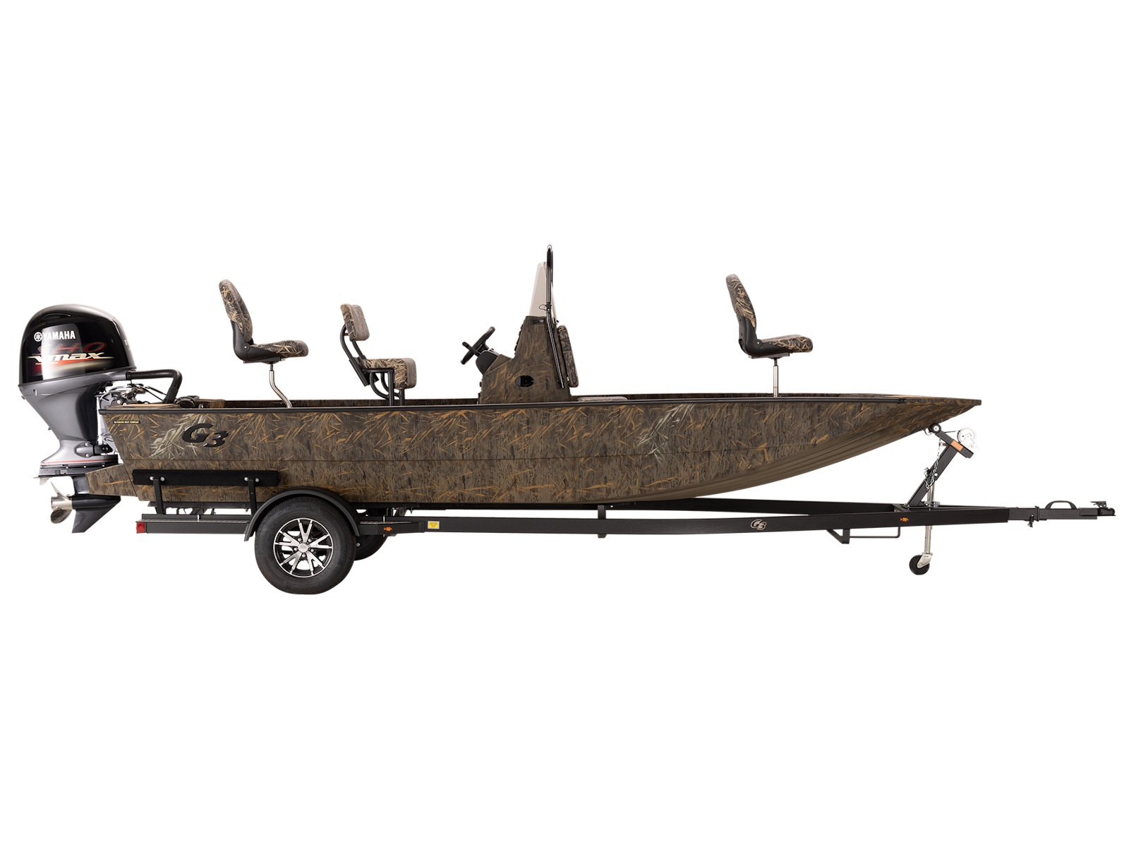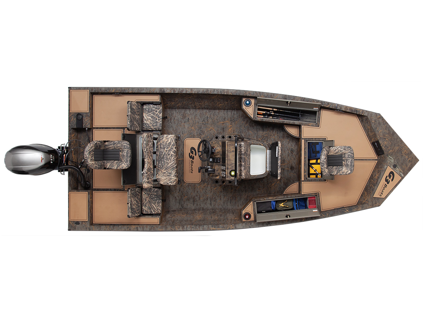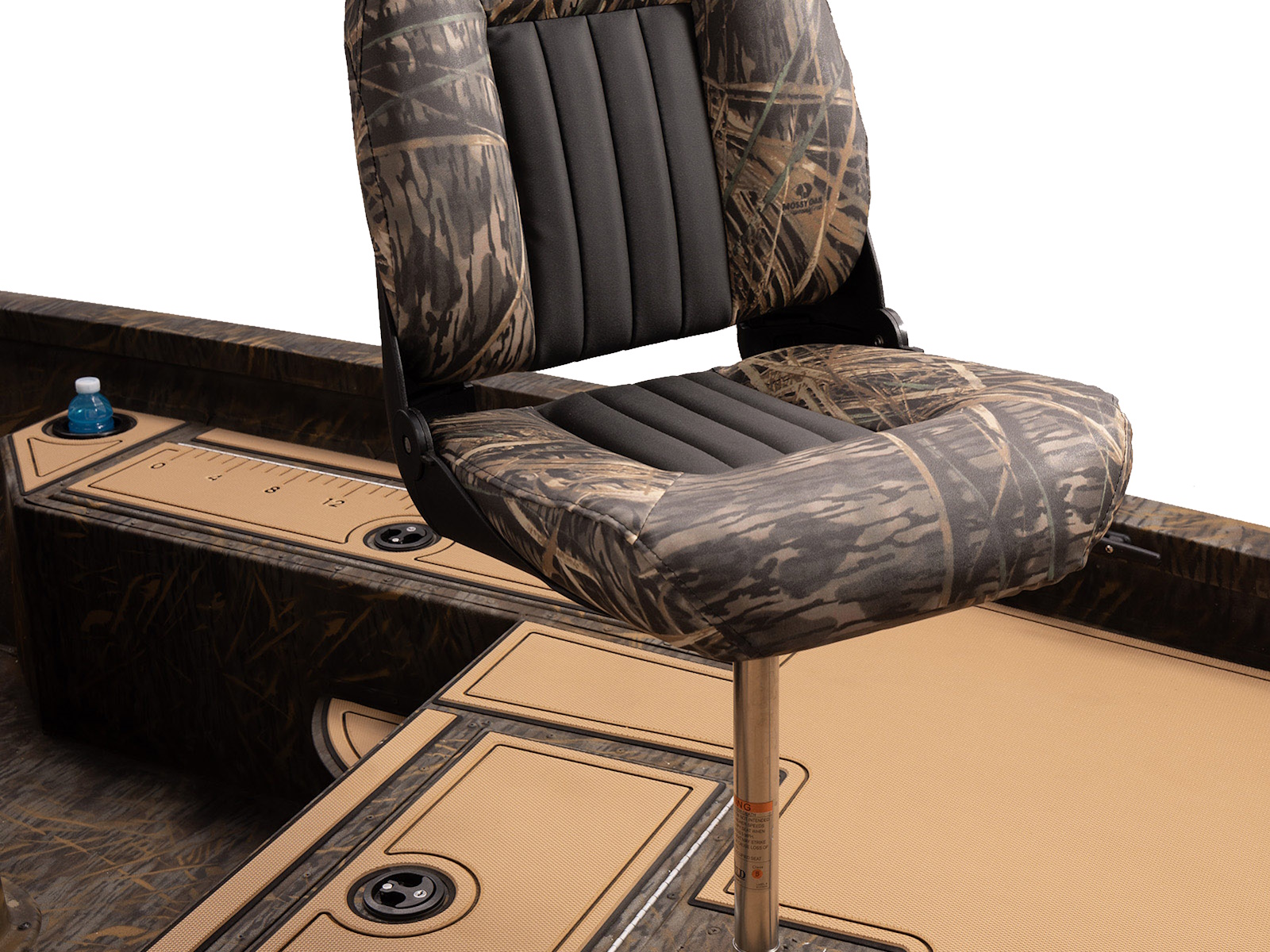 Two fishing seats are included in this boat package along with two seat pedestals to accommodate opening the stern livewell and a straight one for the bow seat. Shown with optional SeaDek®.