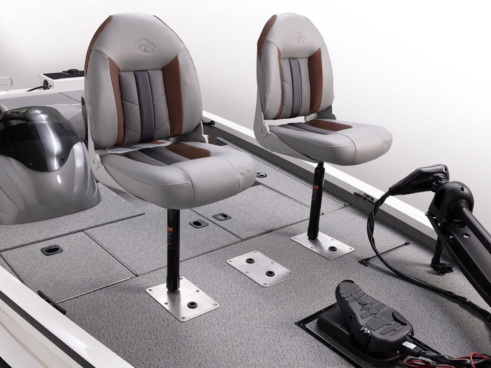 Comfortable high-back fishing chair has a two position deck plate, assisting with trolling motor operation.