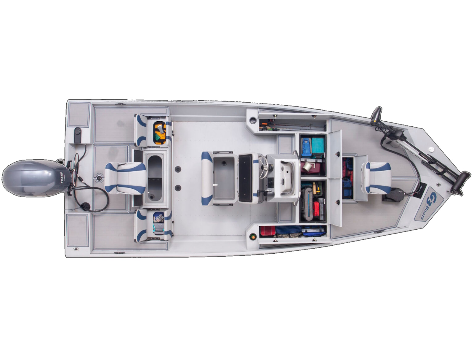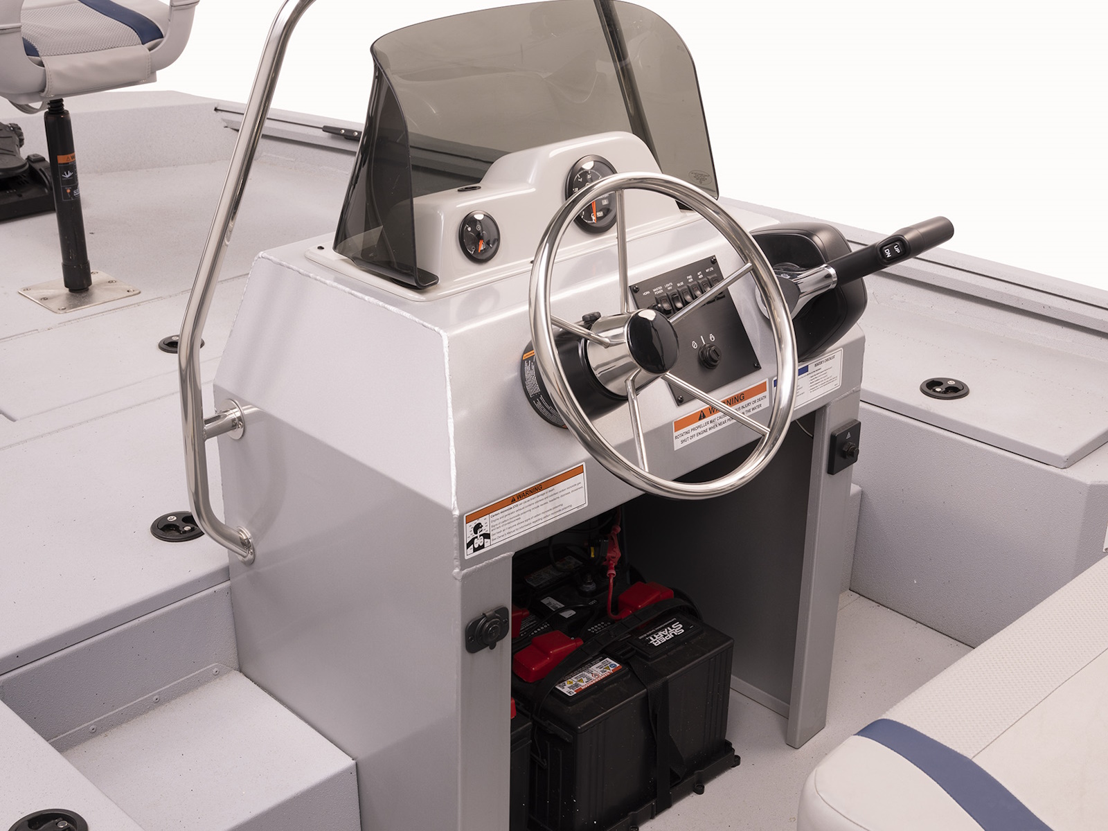 Console has Yamaha gauges and controls and a space for optional electroncis. Double wide helm seat has an easy access 26″ x 13″ 17 gallon livewell.