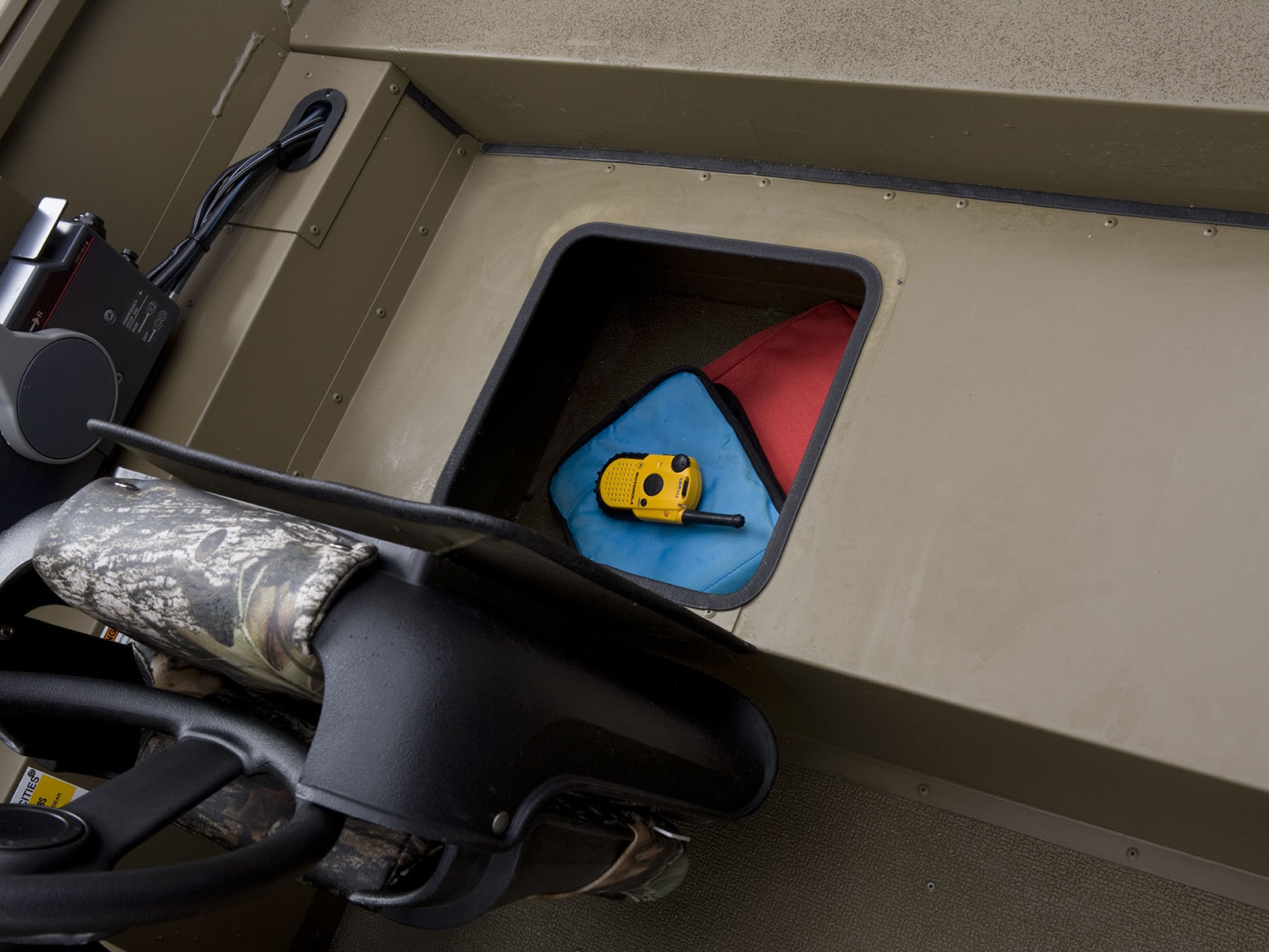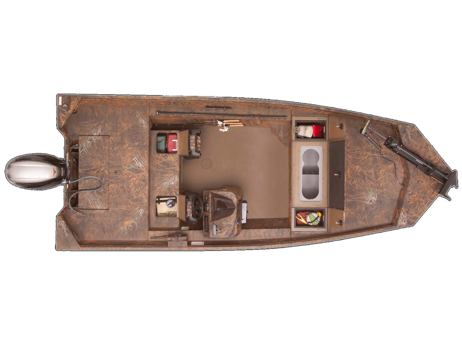 Front side of console houses tackle trays for quick access and easy organization. Tackle trays included.