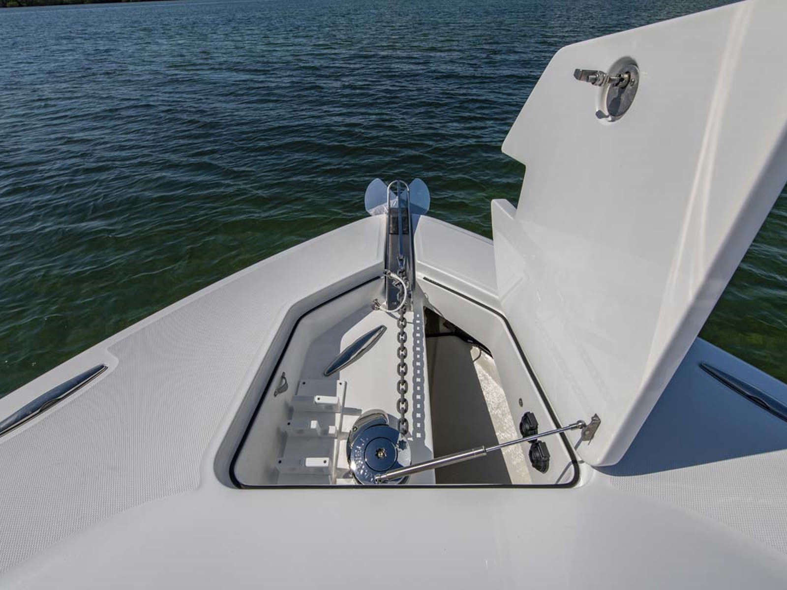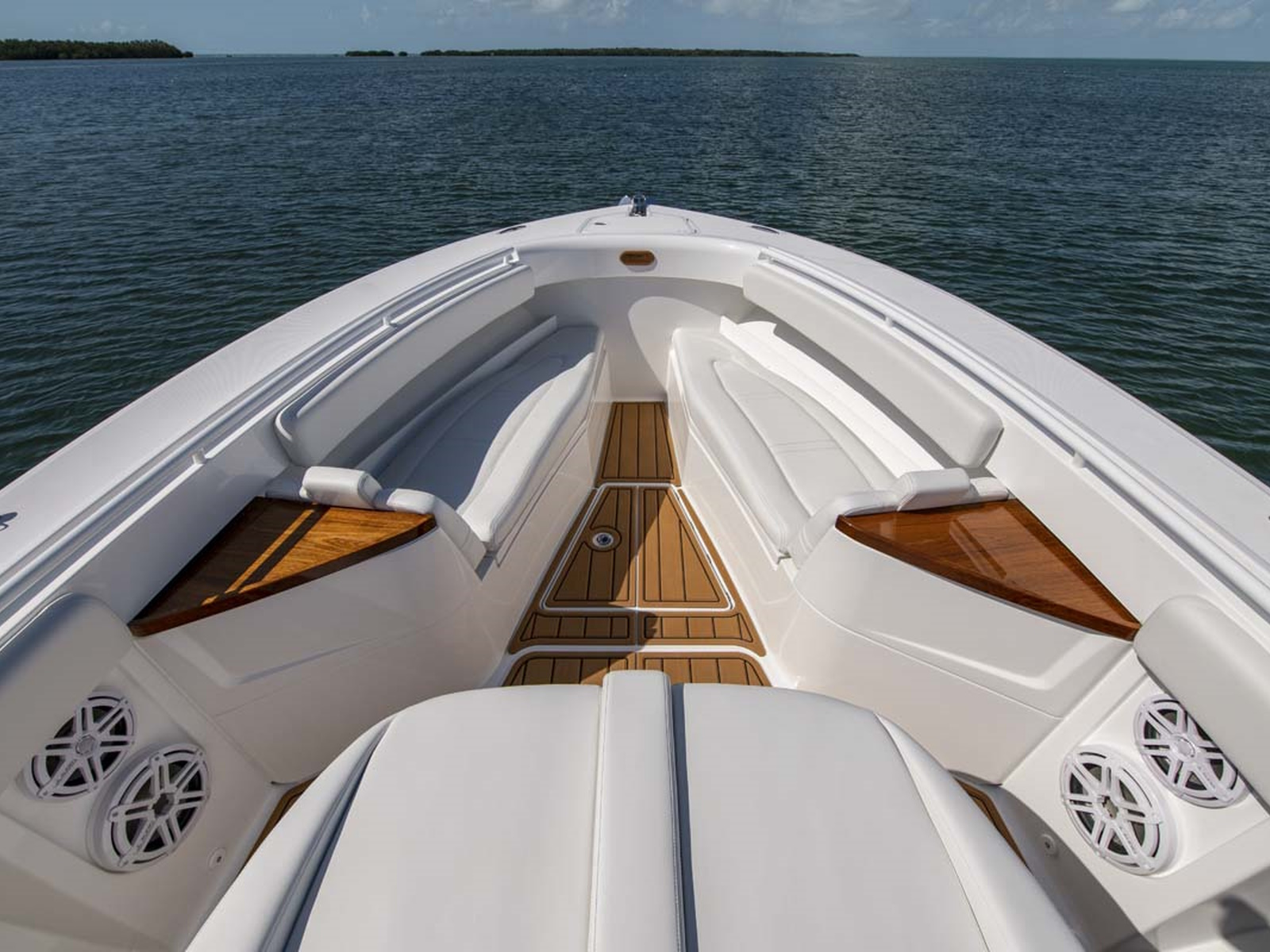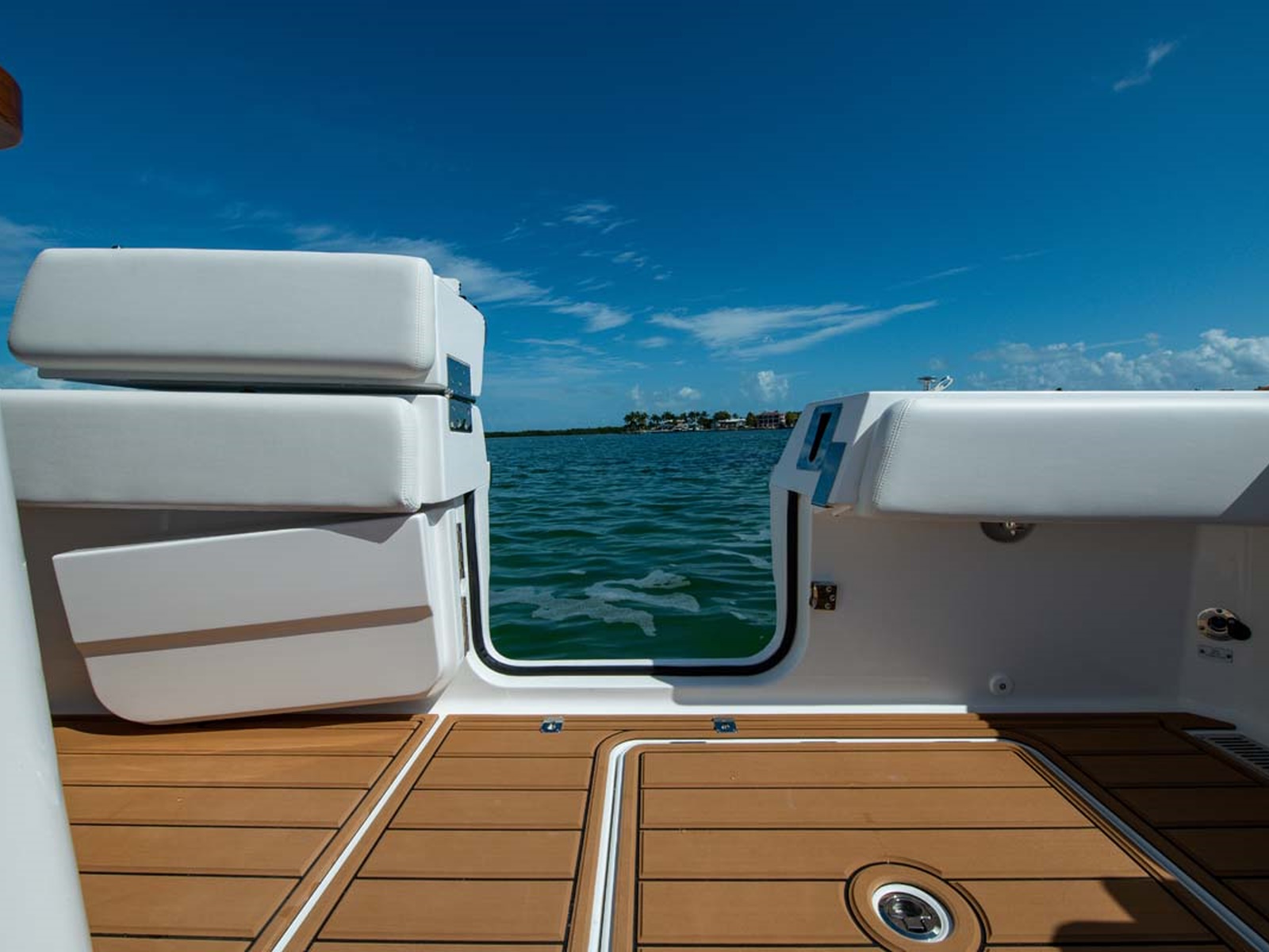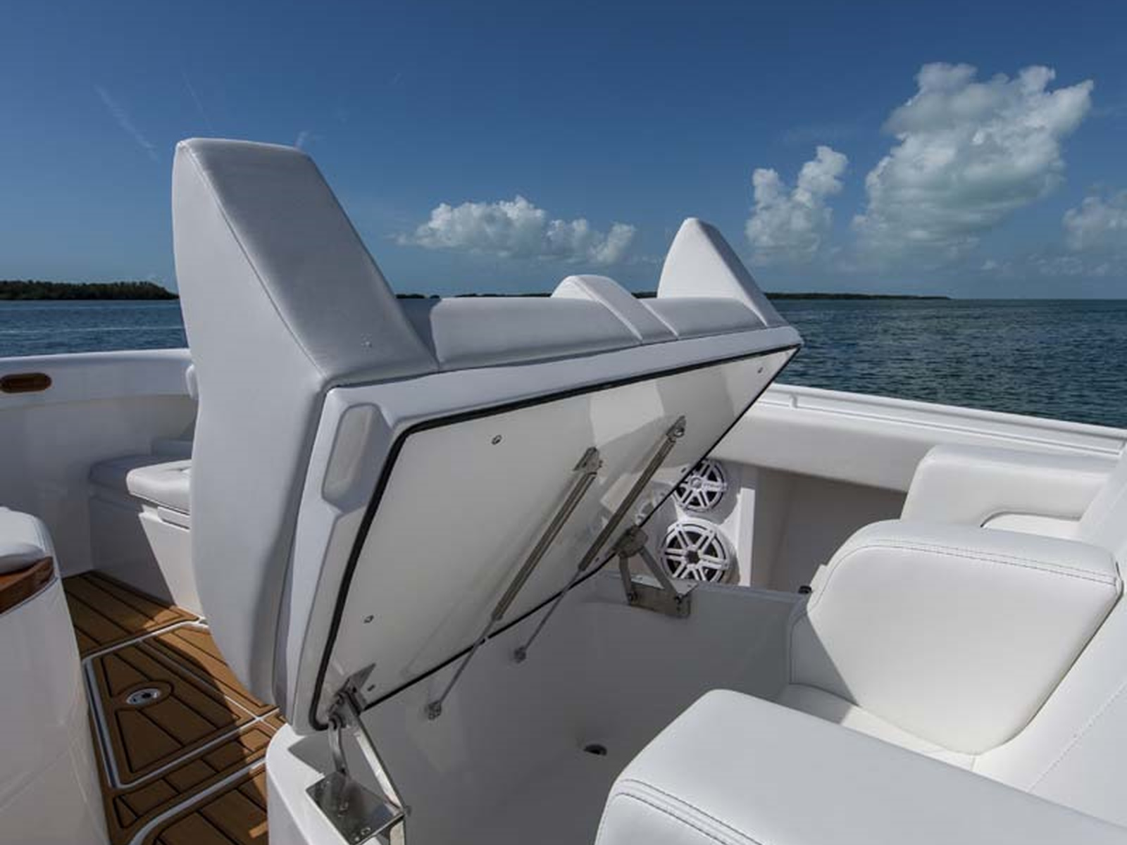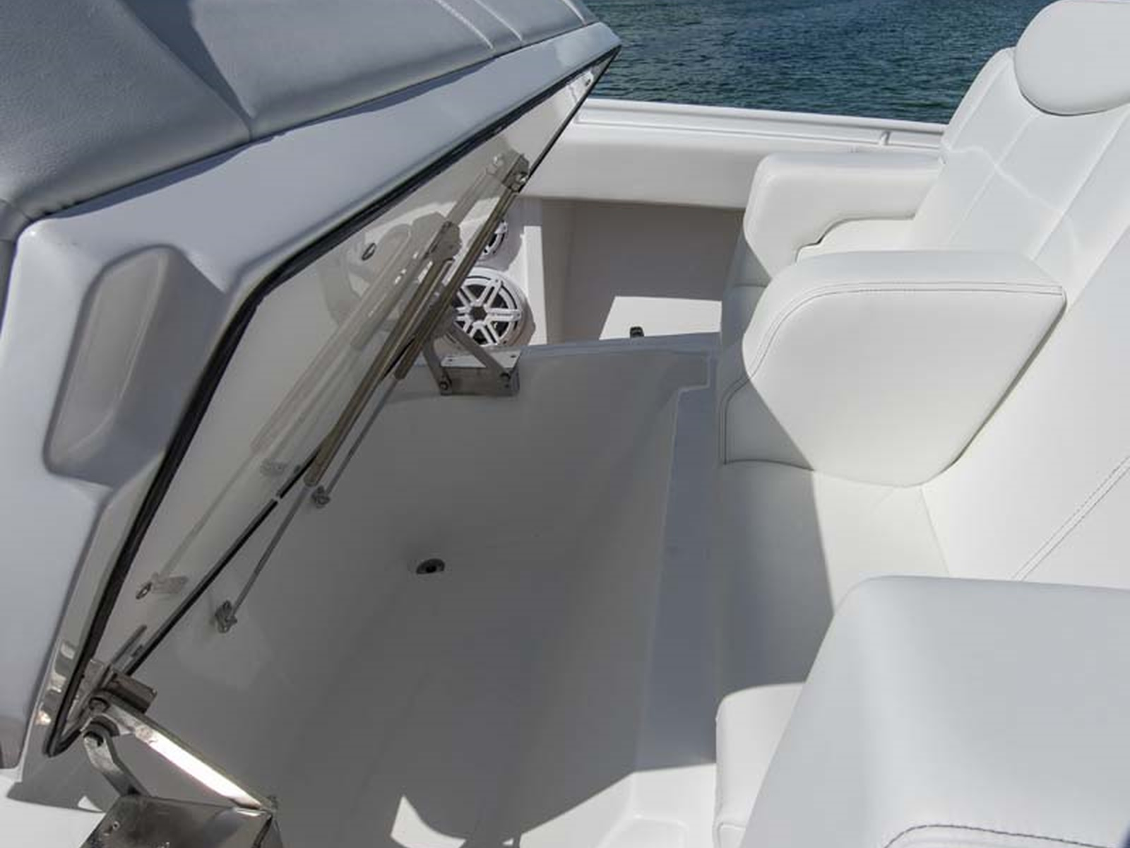 Stepping aboard you will immediately notice the spacious aft layout and rear facing lounge seat that easily converts to a tackle station by simply folding down the seat back. The unintimidating helm, like all of the Speciale’s big sisters, boasts a terrific panoramic view with the cross-curved™ non-glaring glass, clean automotive inspired helm station, 3 of the largest displays in it’s class, and three comfortable helm seats.