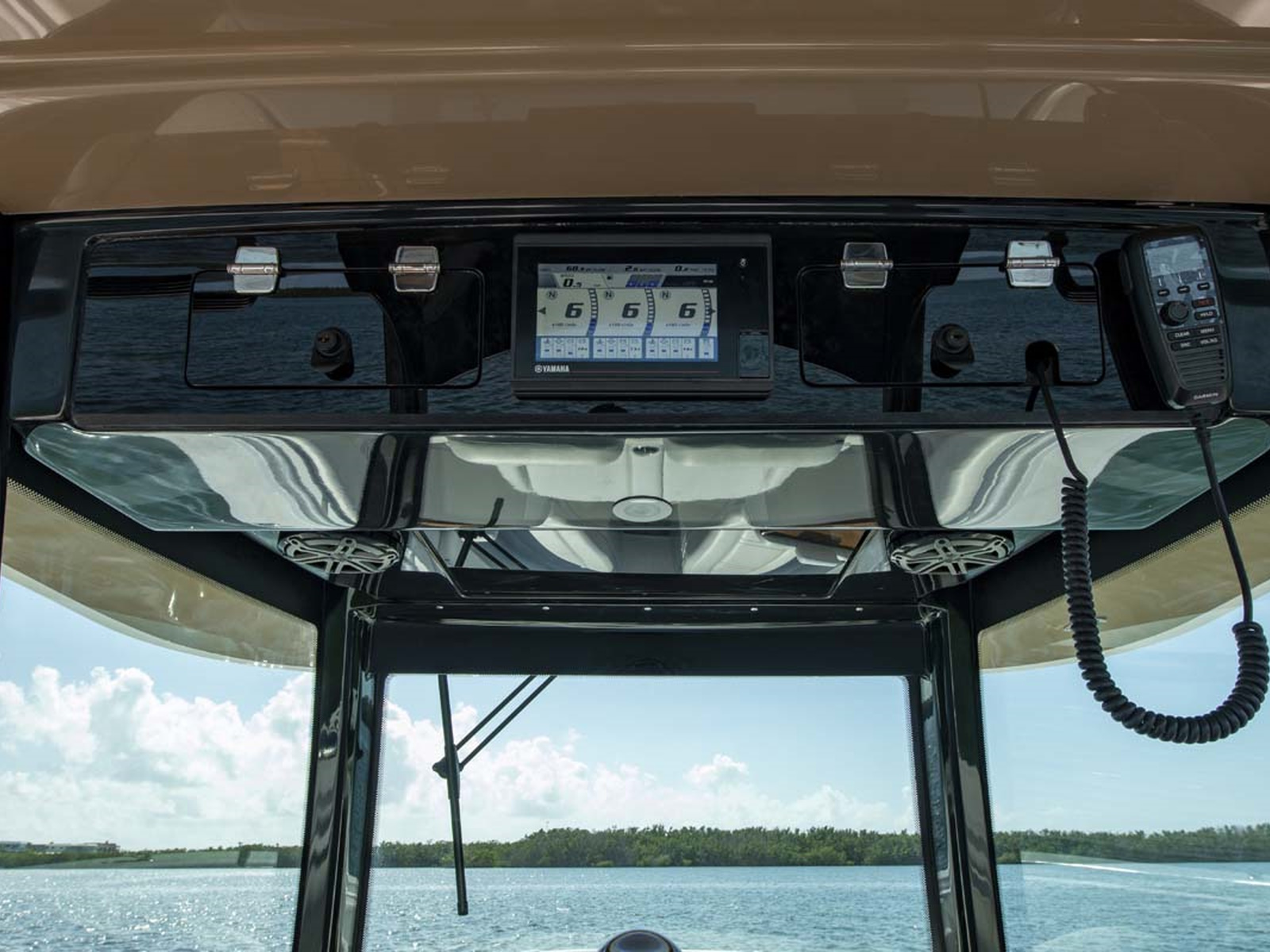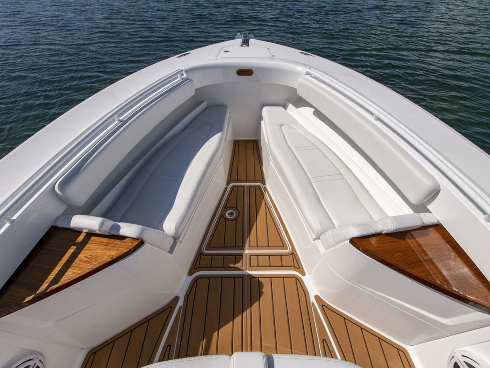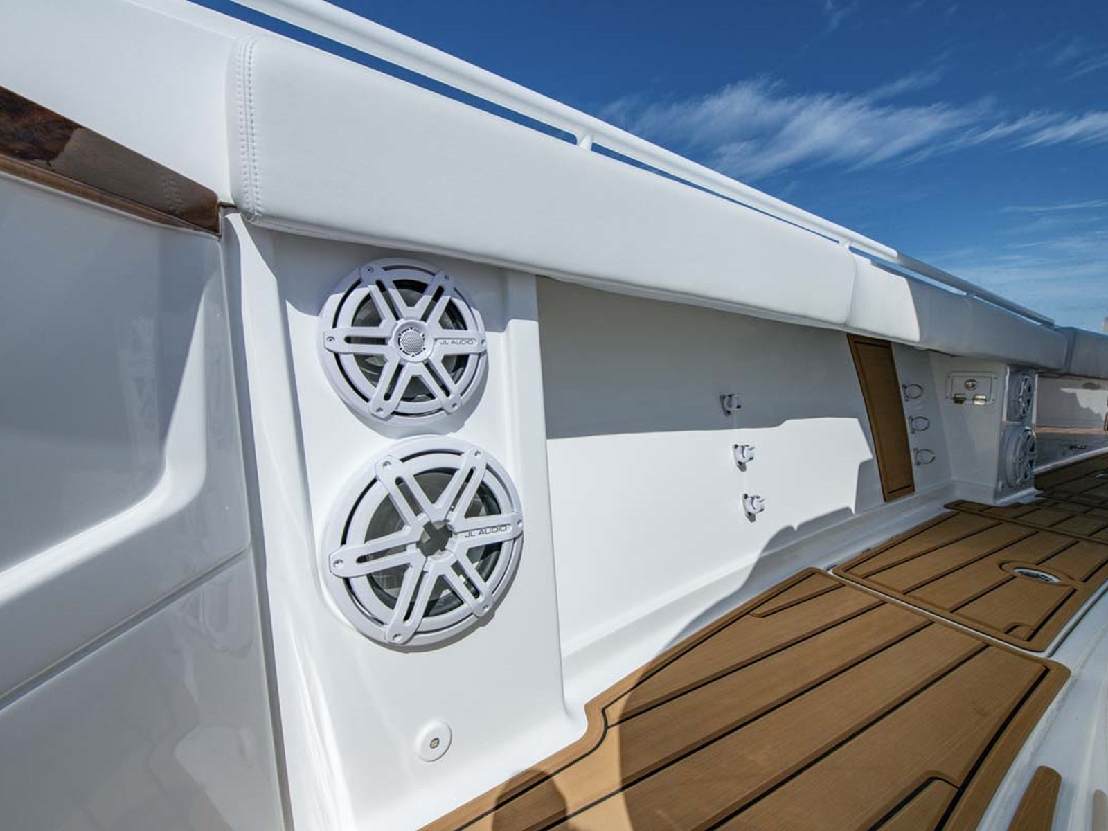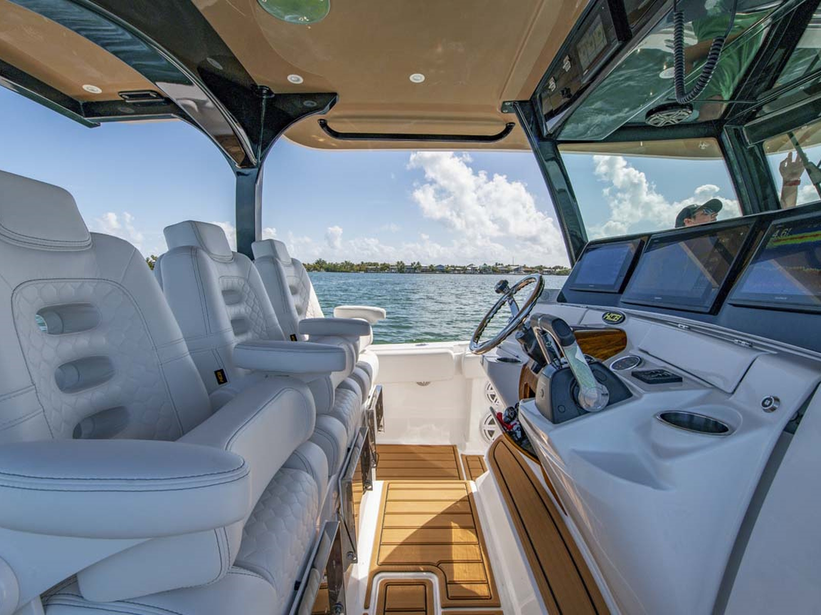 Stepping aboard you will immediately notice the spacious aft layout and rear facing lounge seat that easily converts to a tackle station by simply folding down the seat back. The unintimidating helm, like all of the Speciale’s big sisters, boasts a terrific panoramic view with the cross-curved™ non-glaring glass, clean automotive inspired helm station, 3 of the largest displays in it’s class, and three comfortable helm seats.