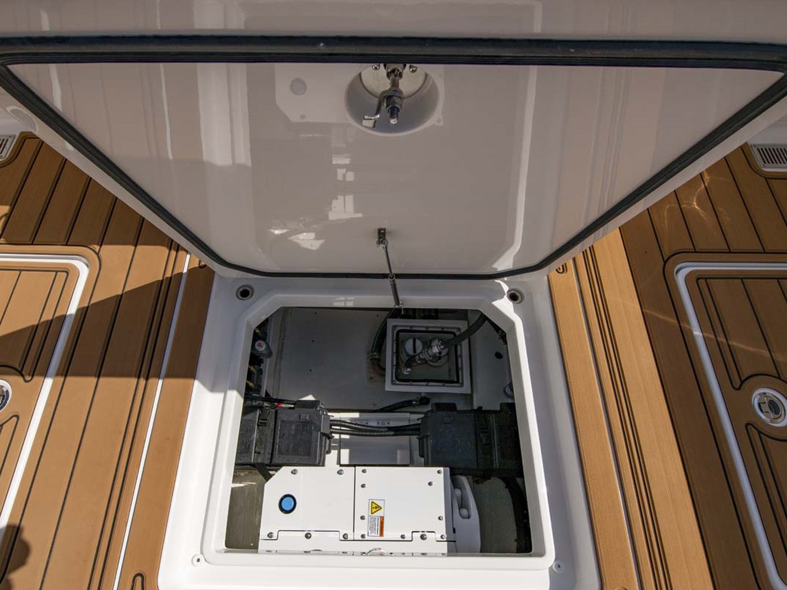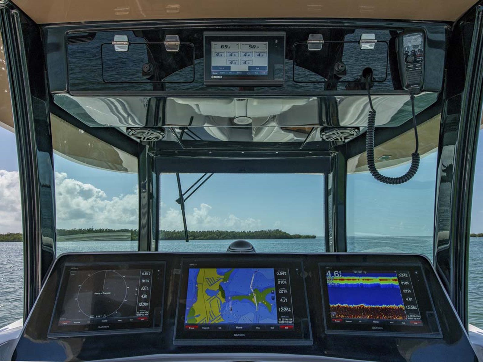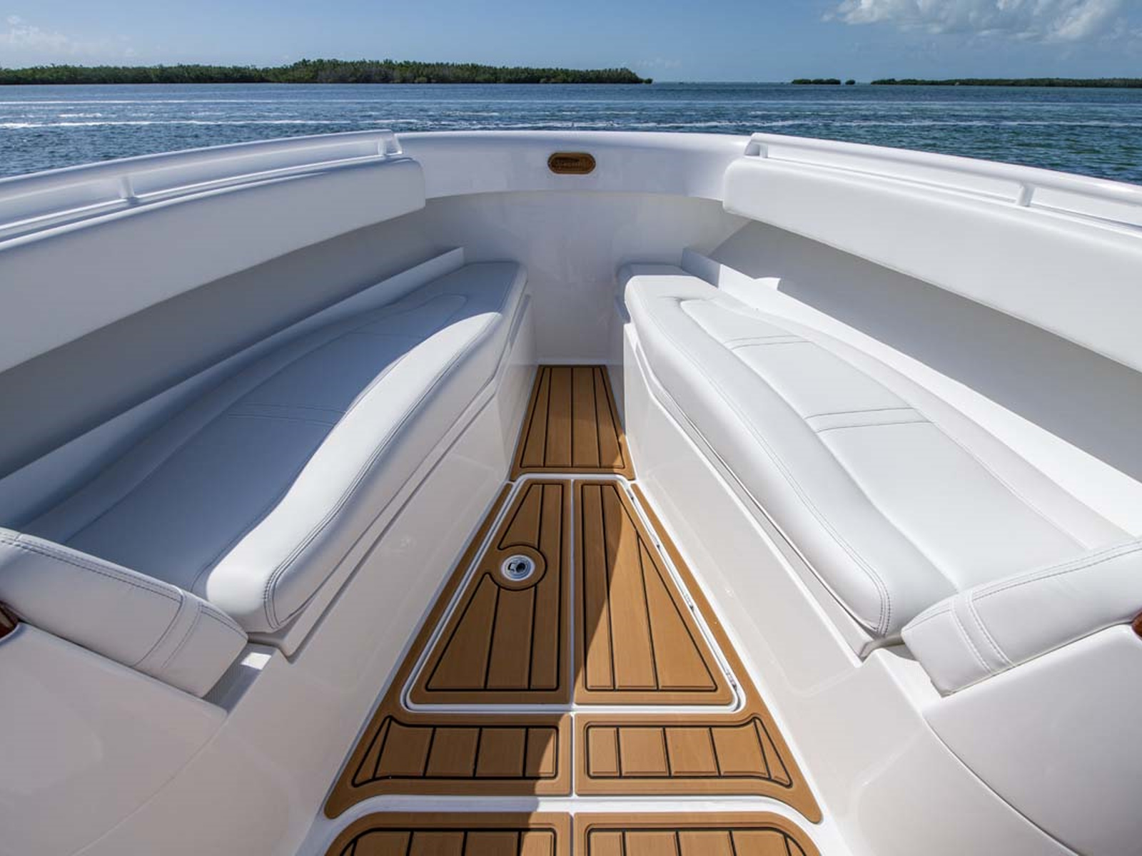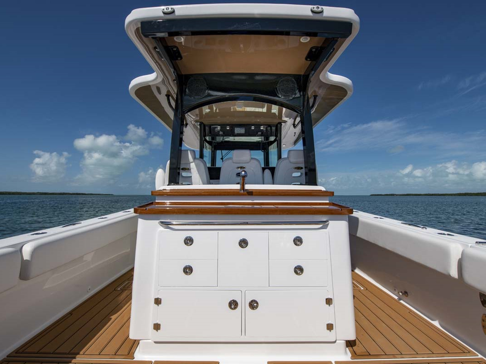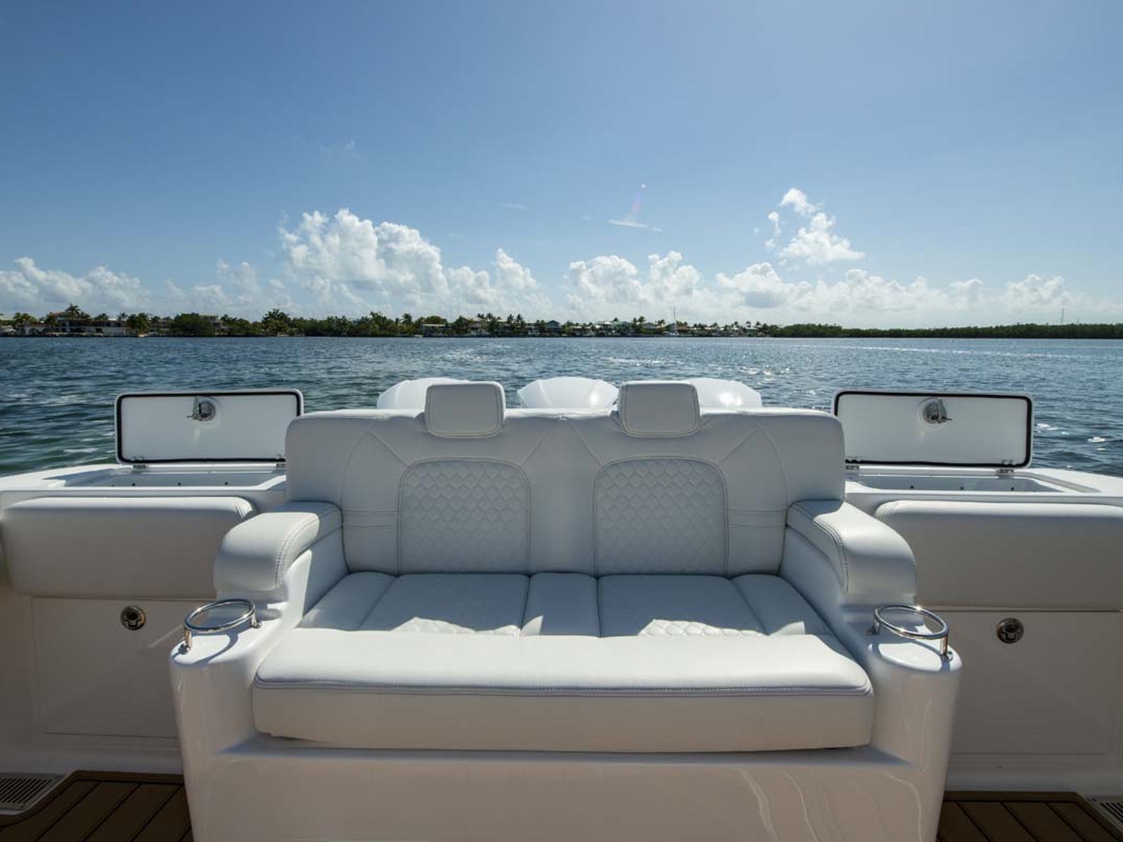 Stepping aboard you will immediately notice the spacious aft layout and rear facing lounge seat that easily converts to a tackle station by simply folding down the seat back. The unintimidating helm, like all of the Speciale’s big sisters, boasts a terrific panoramic view with the cross-curved™ non-glaring glass, clean automotive inspired helm station, 3 of the largest displays in it’s class, and three comfortable helm seats.