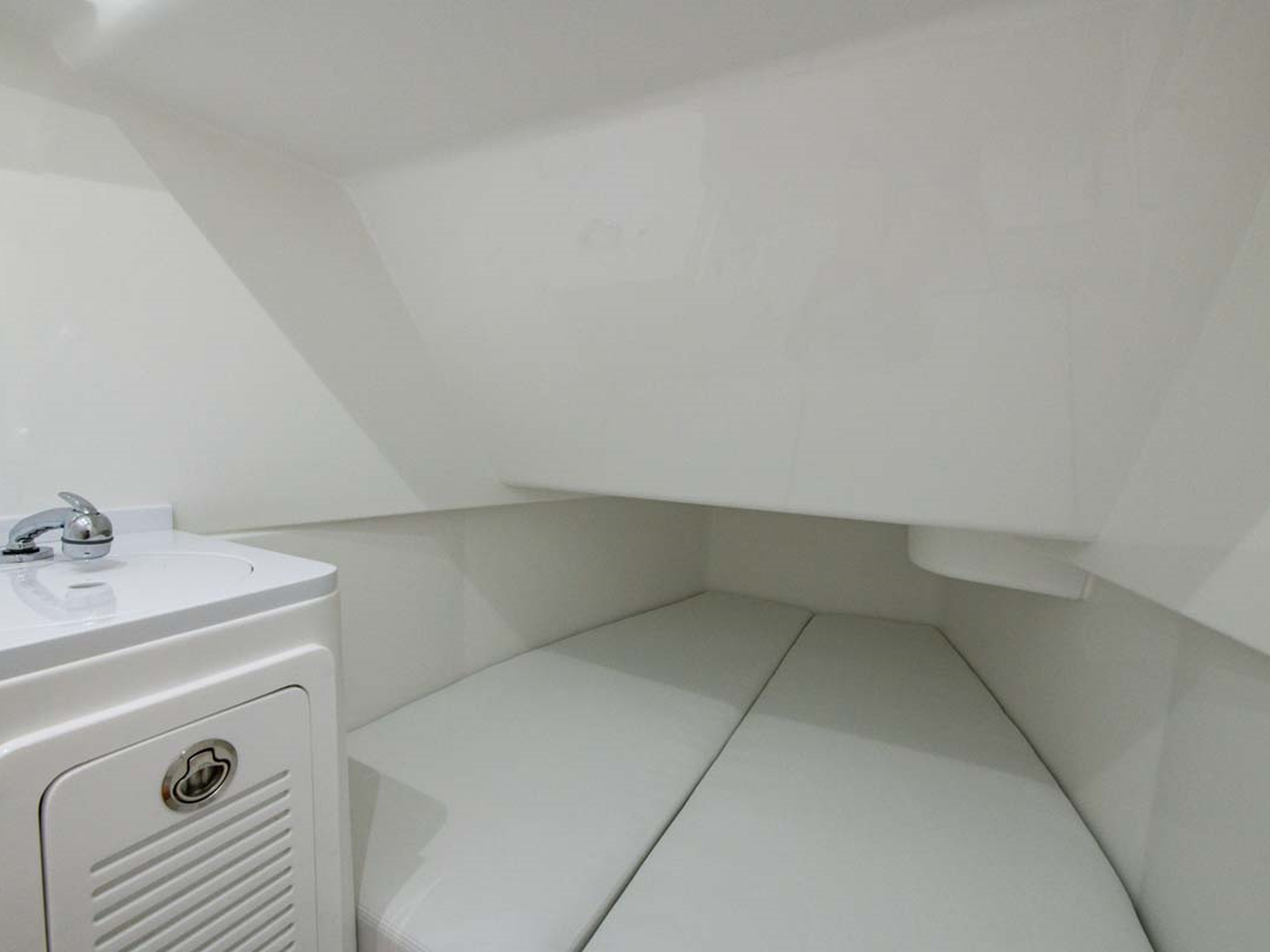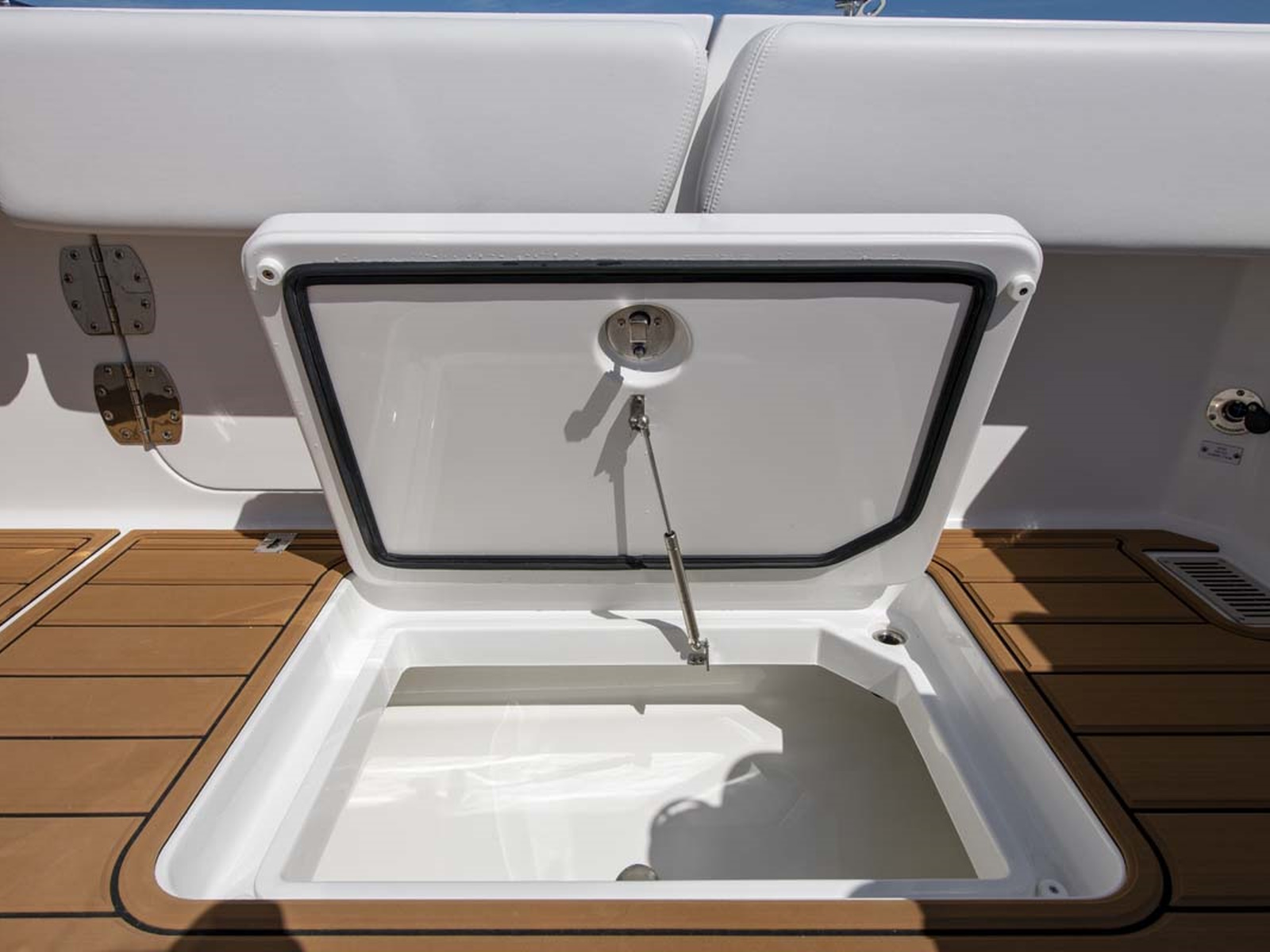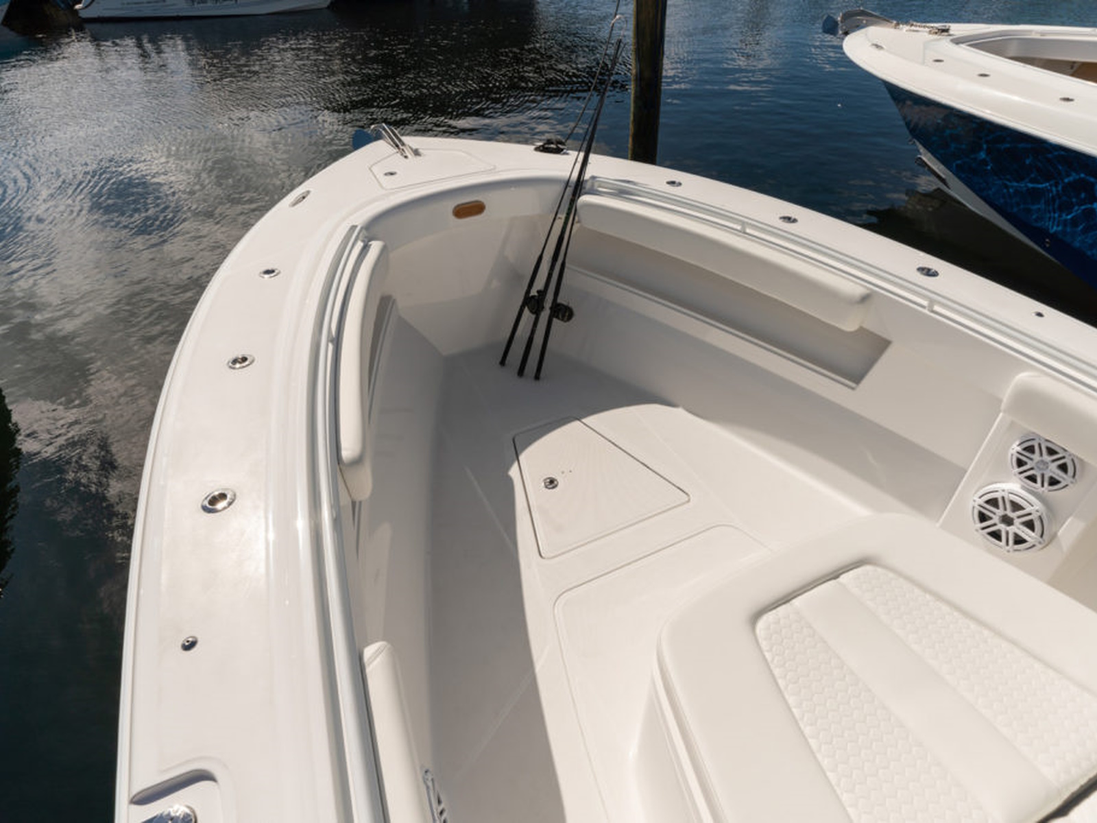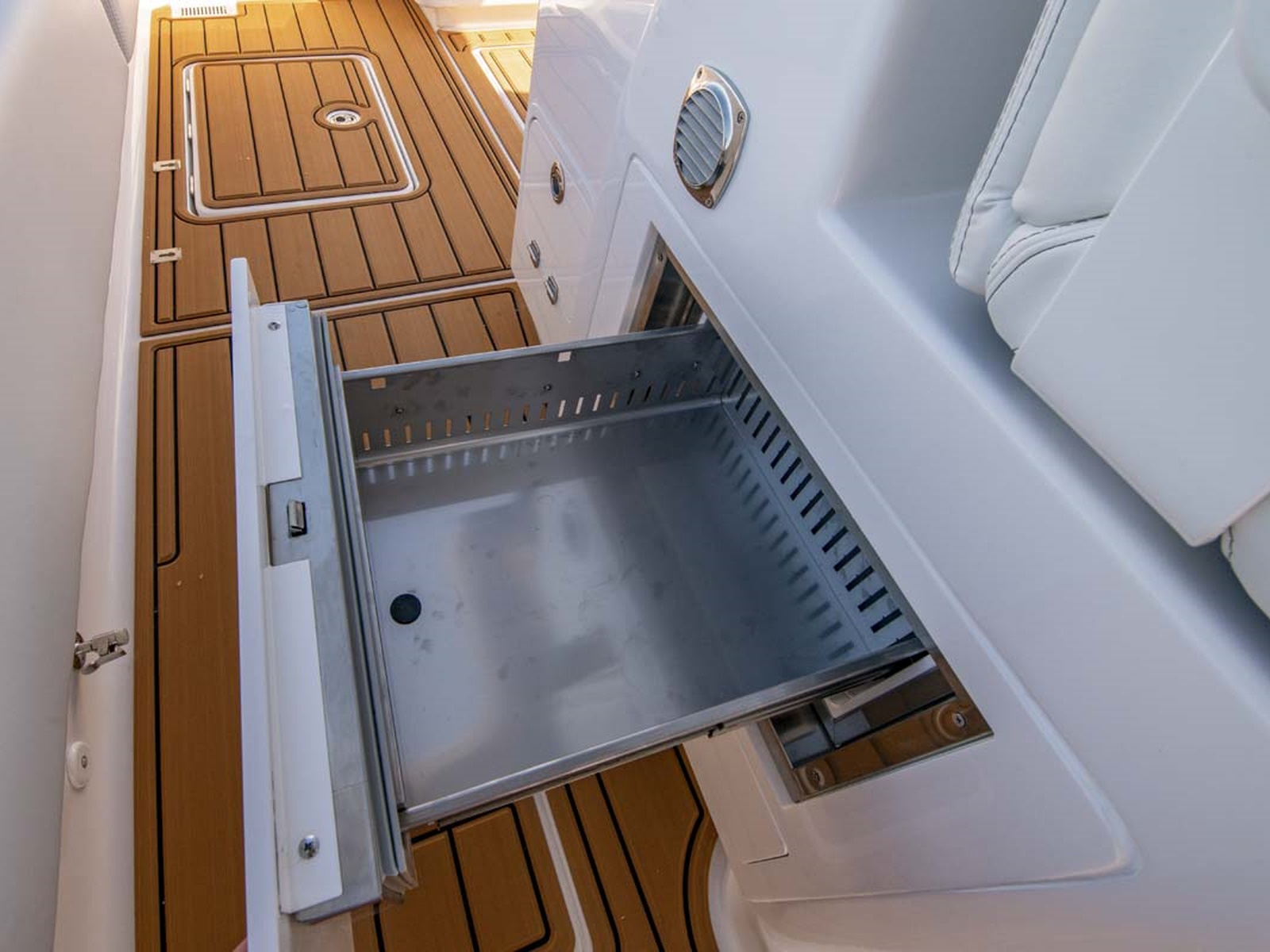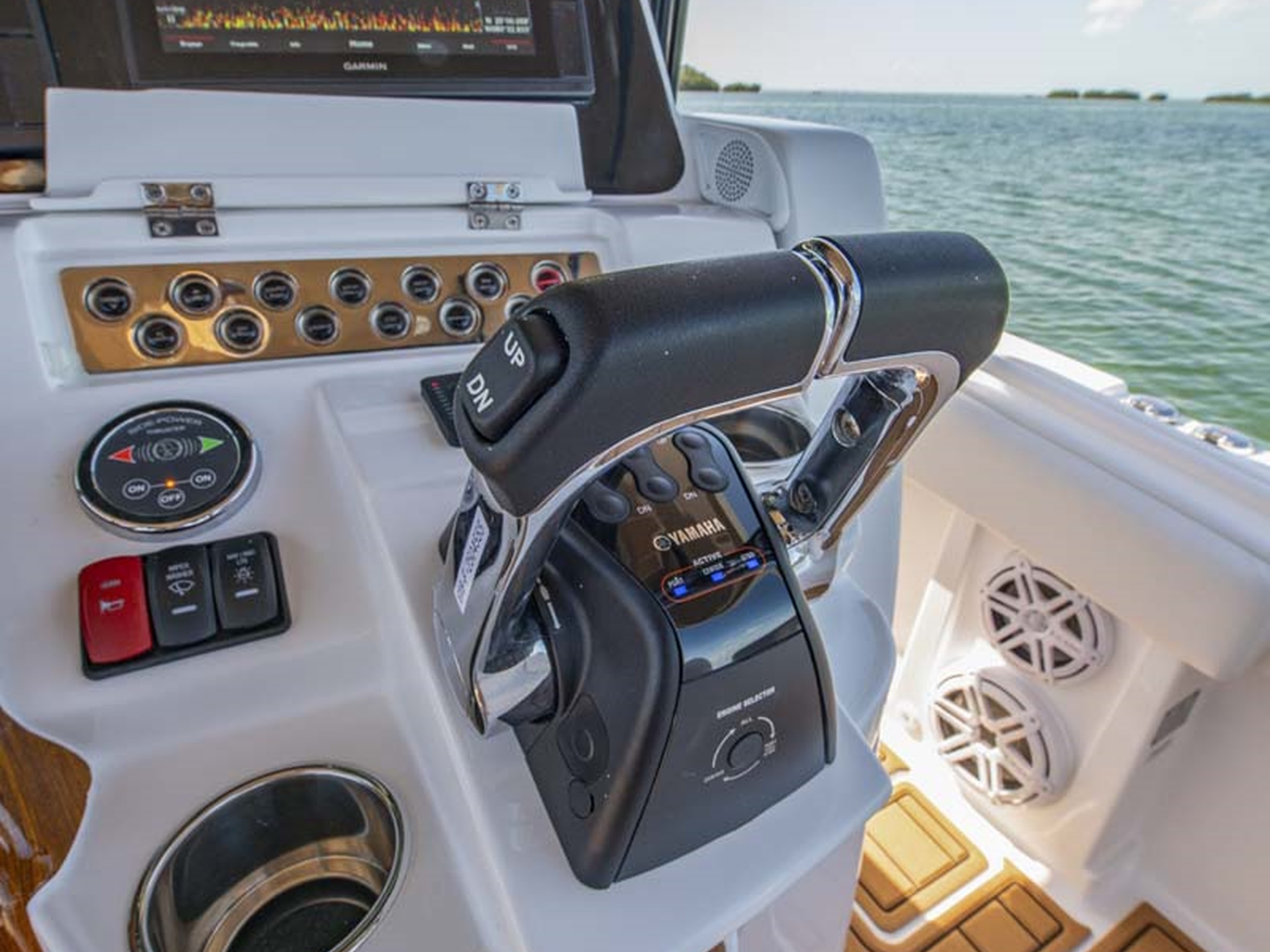 Stepping aboard you will immediately notice the spacious aft layout and rear facing lounge seat that easily converts to a tackle station by simply folding down the seat back. The unintimidating helm, like all of the Speciale’s big sisters, boasts a terrific panoramic view with the cross-curved™ non-glaring glass, clean automotive inspired helm station, 3 of the largest displays in it’s class, and three comfortable helm seats.