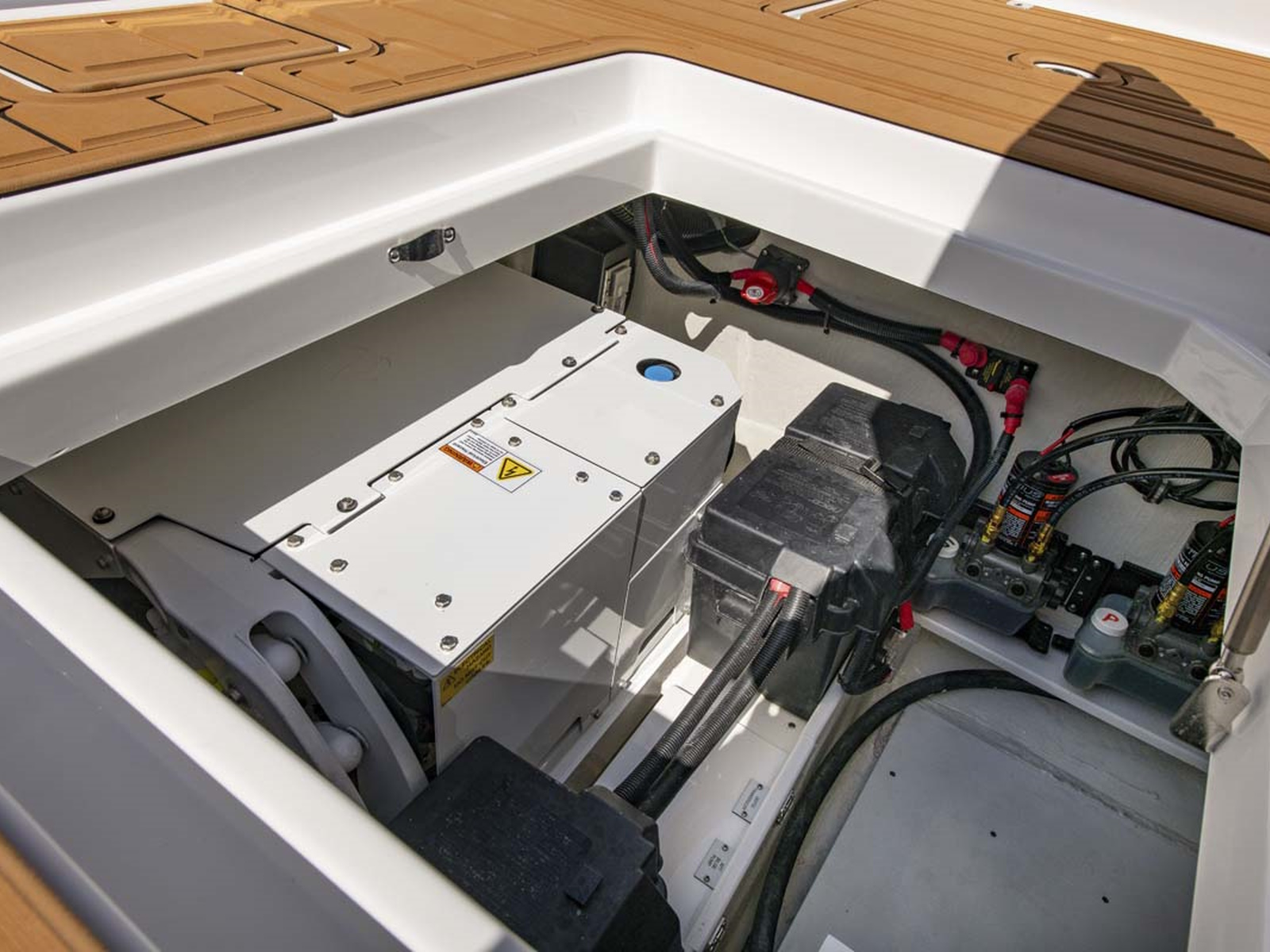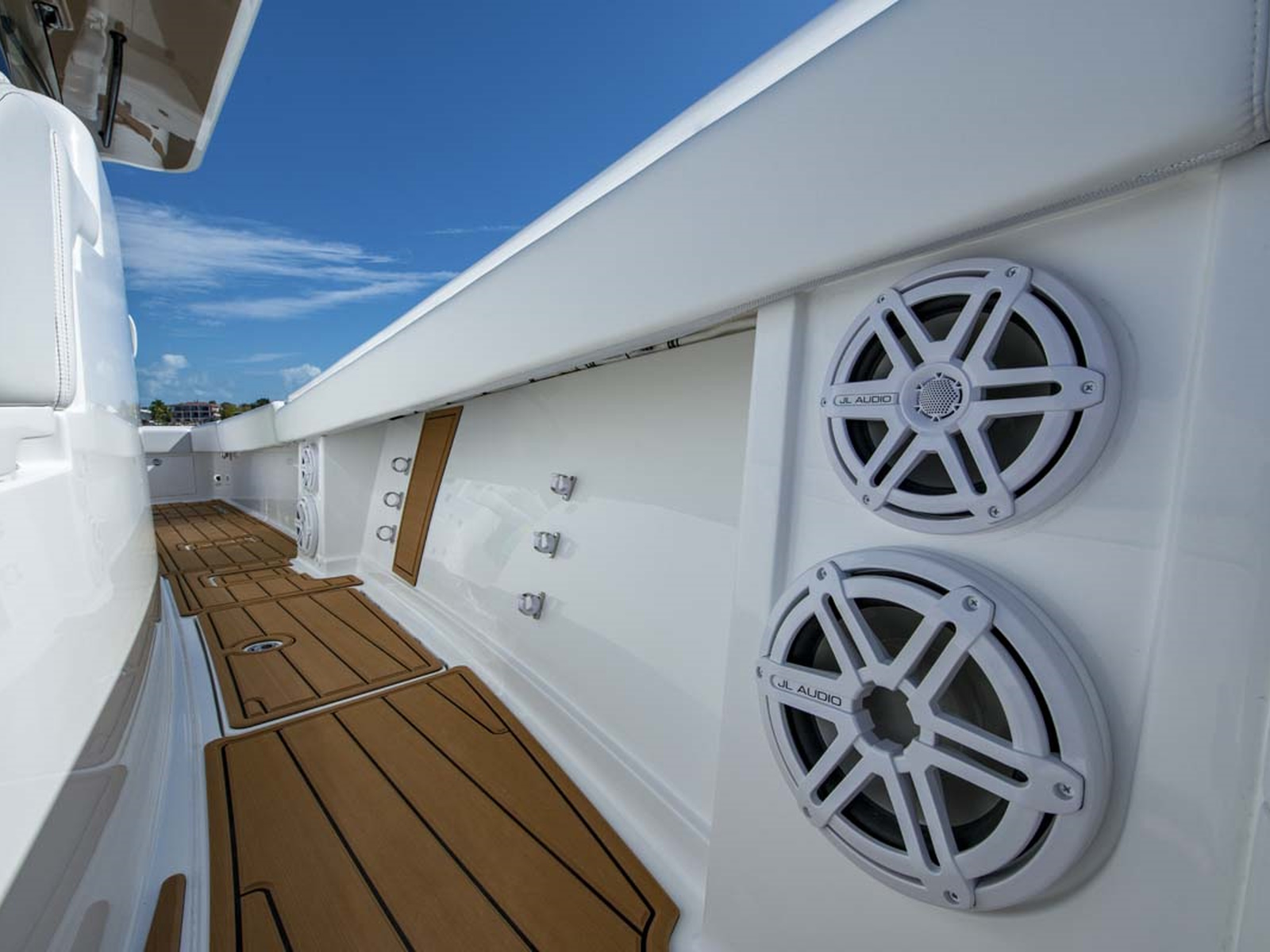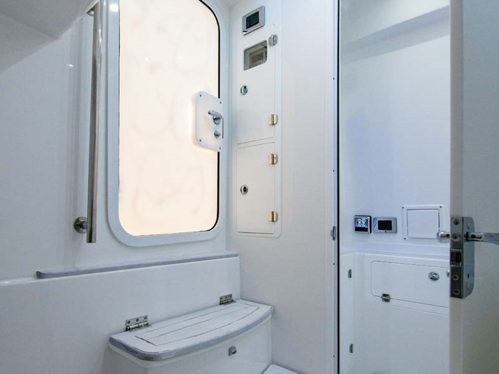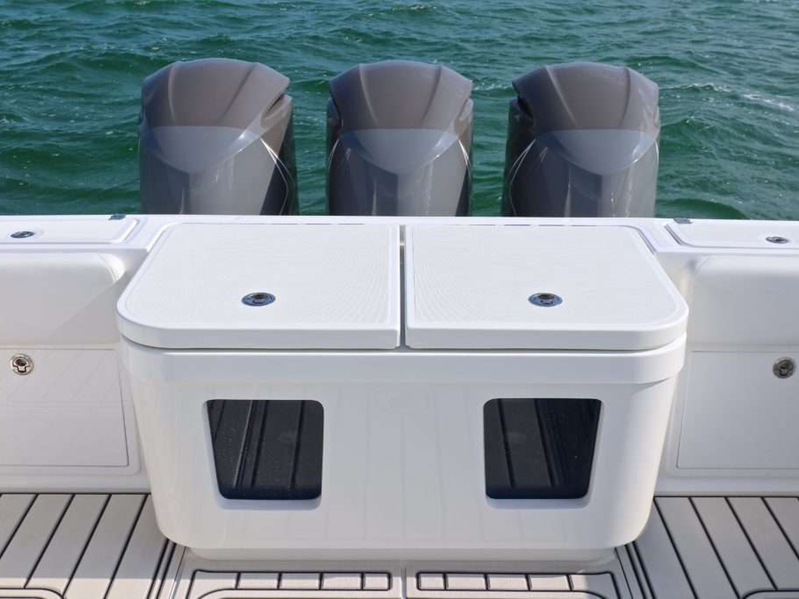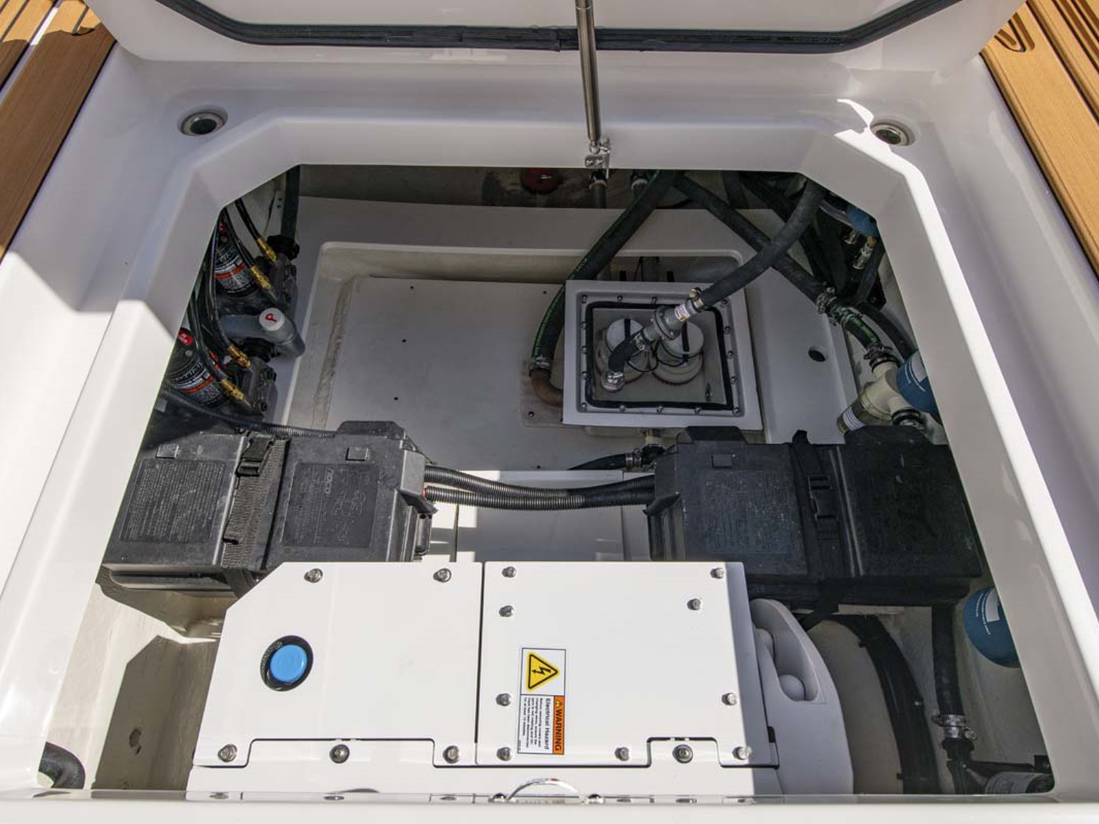 Stepping aboard you will immediately notice the spacious aft layout and rear facing lounge seat that easily converts to a tackle station by simply folding down the seat back. The unintimidating helm, like all of the Speciale’s big sisters, boasts a terrific panoramic view with the cross-curved™ non-glaring glass, clean automotive inspired helm station, 3 of the largest displays in it’s class, and three comfortable helm seats.