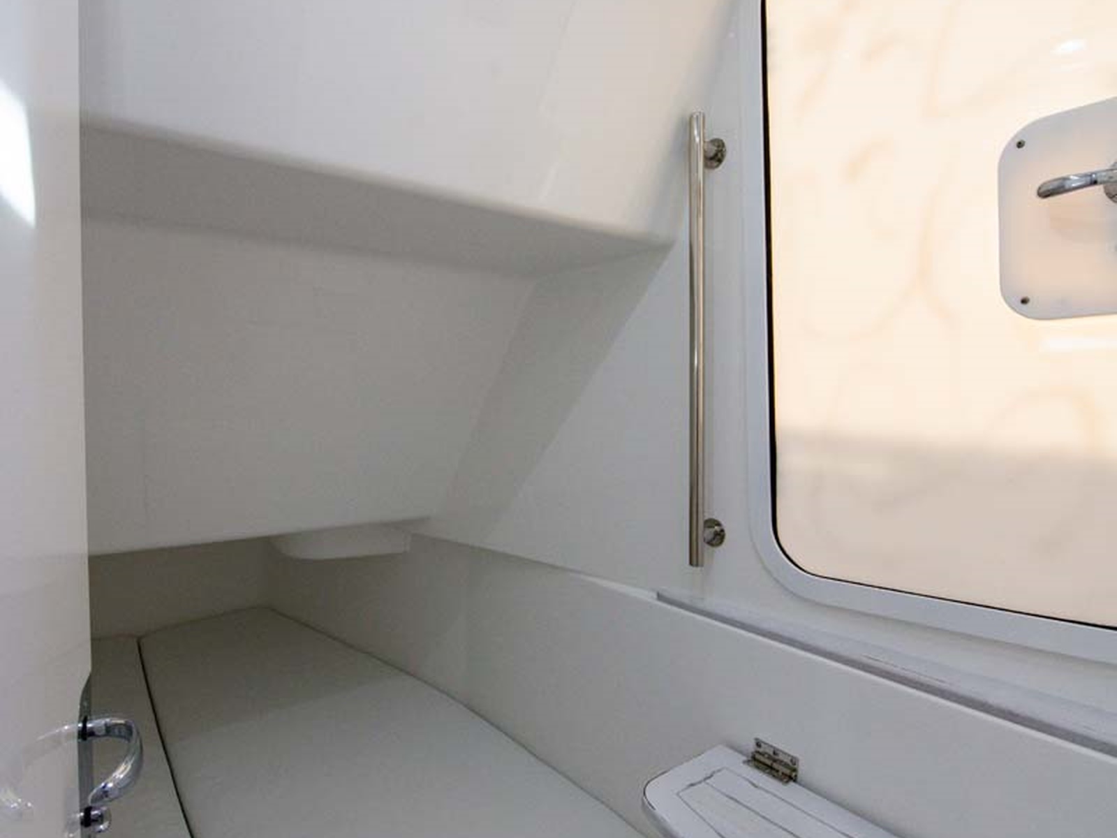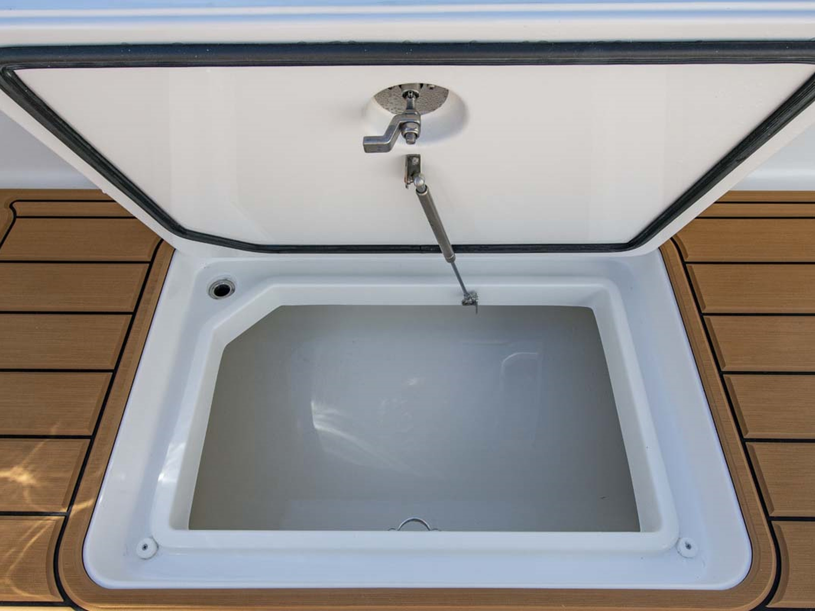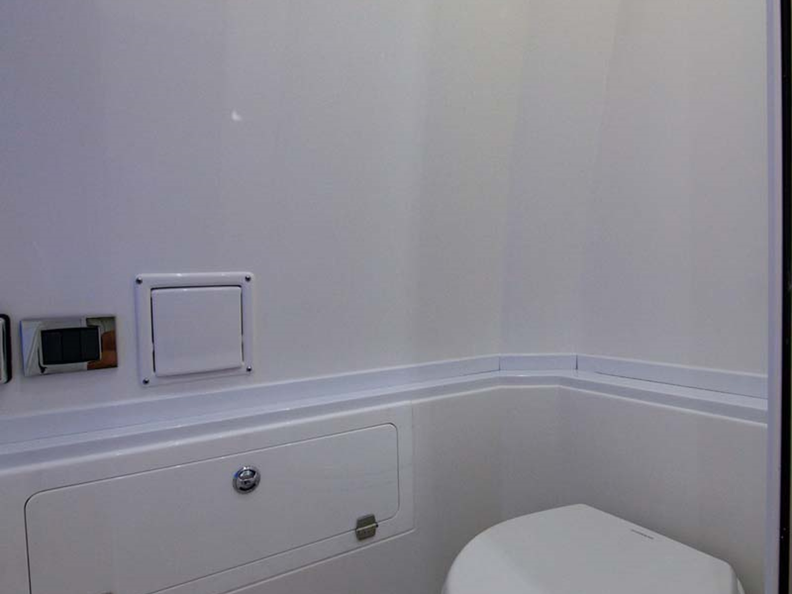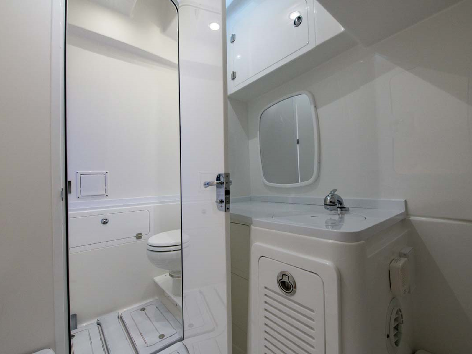 Stepping aboard you will immediately notice the spacious aft layout and rear facing lounge seat that easily converts to a tackle station by simply folding down the seat back. The unintimidating helm, like all of the Speciale’s big sisters, boasts a terrific panoramic view with the cross-curved™ non-glaring glass, clean automotive inspired helm station, 3 of the largest displays in it’s class, and three comfortable helm seats.