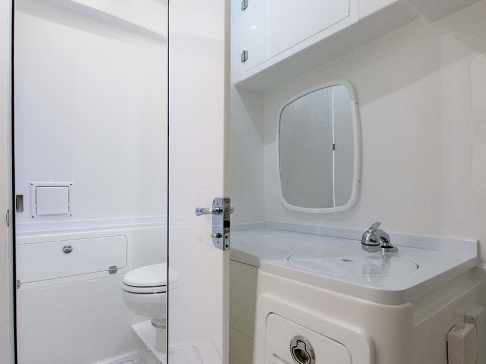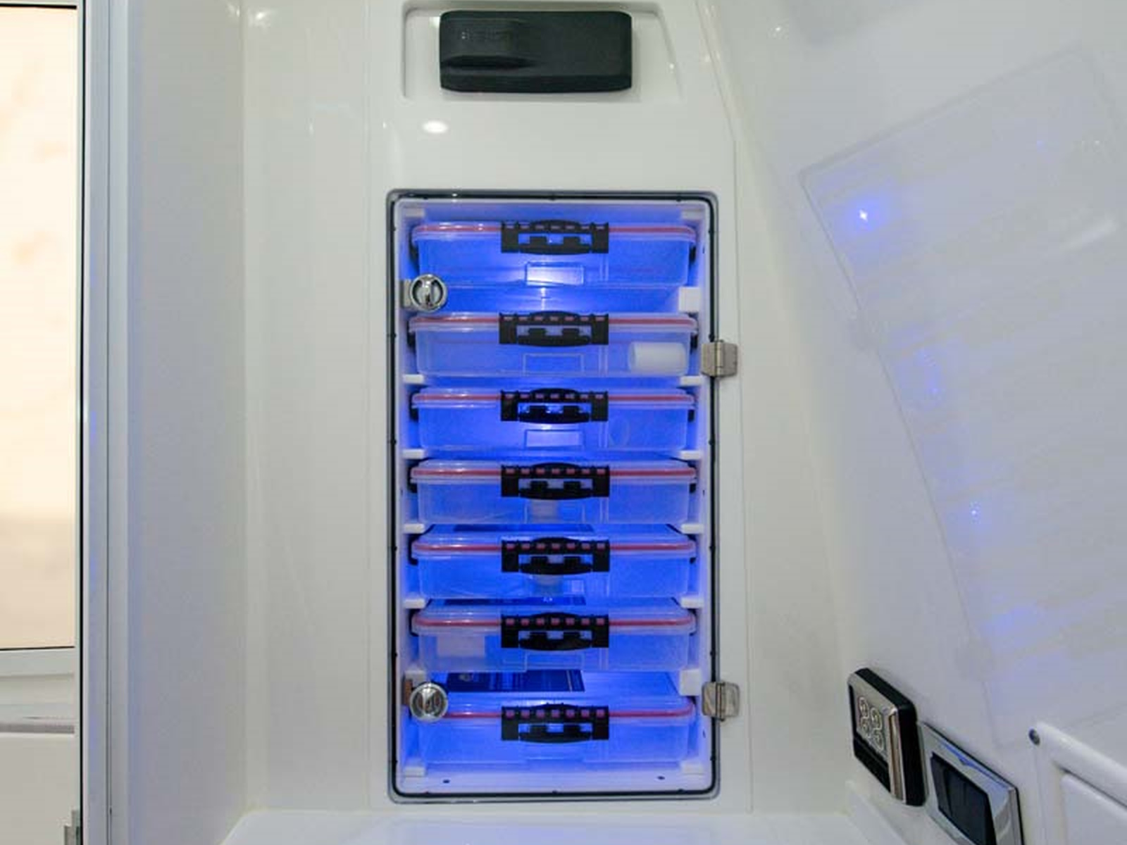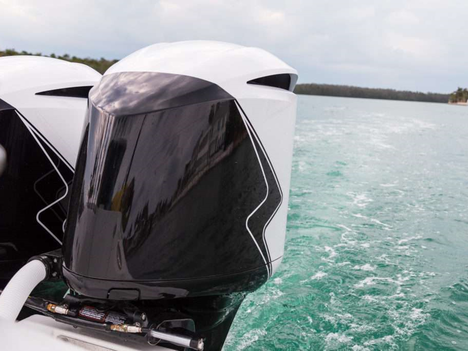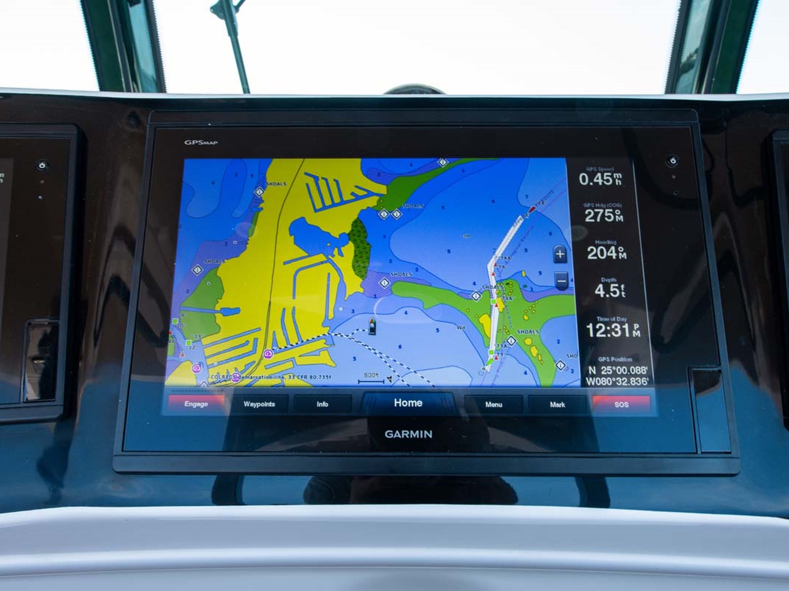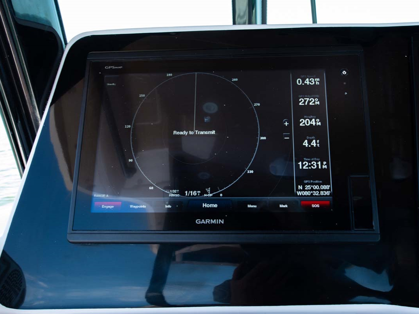 Stepping aboard you will immediately notice the spacious aft layout and rear facing lounge seat that easily converts to a tackle station by simply folding down the seat back. The unintimidating helm, like all of the Speciale’s big sisters, boasts a terrific panoramic view with the cross-curved™ non-glaring glass, clean automotive inspired helm station, 3 of the largest displays in it’s class, and three comfortable helm seats.