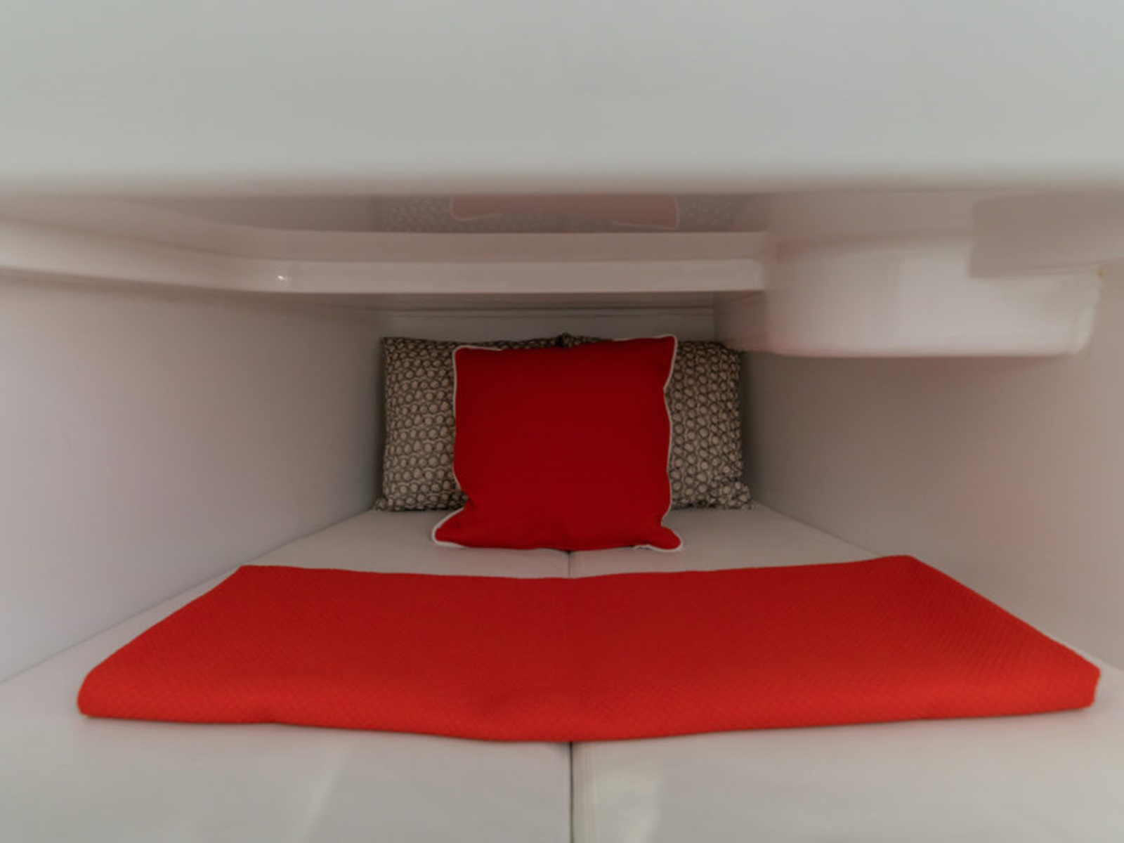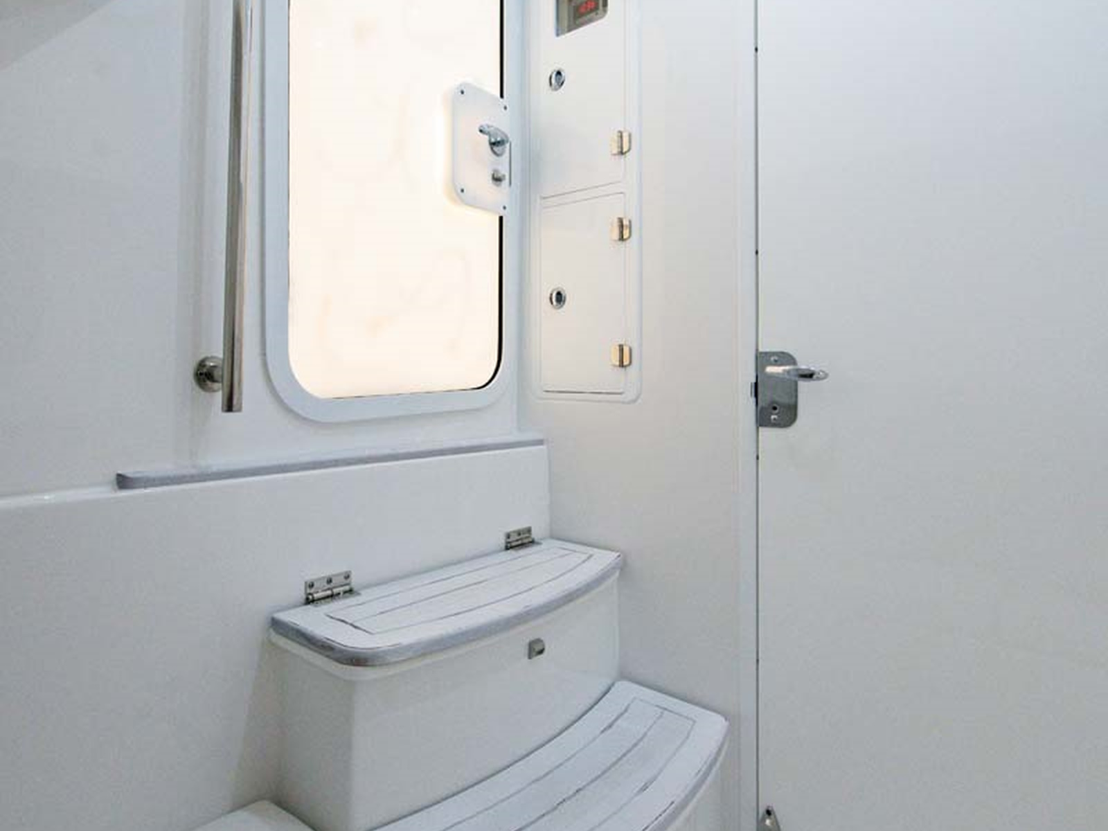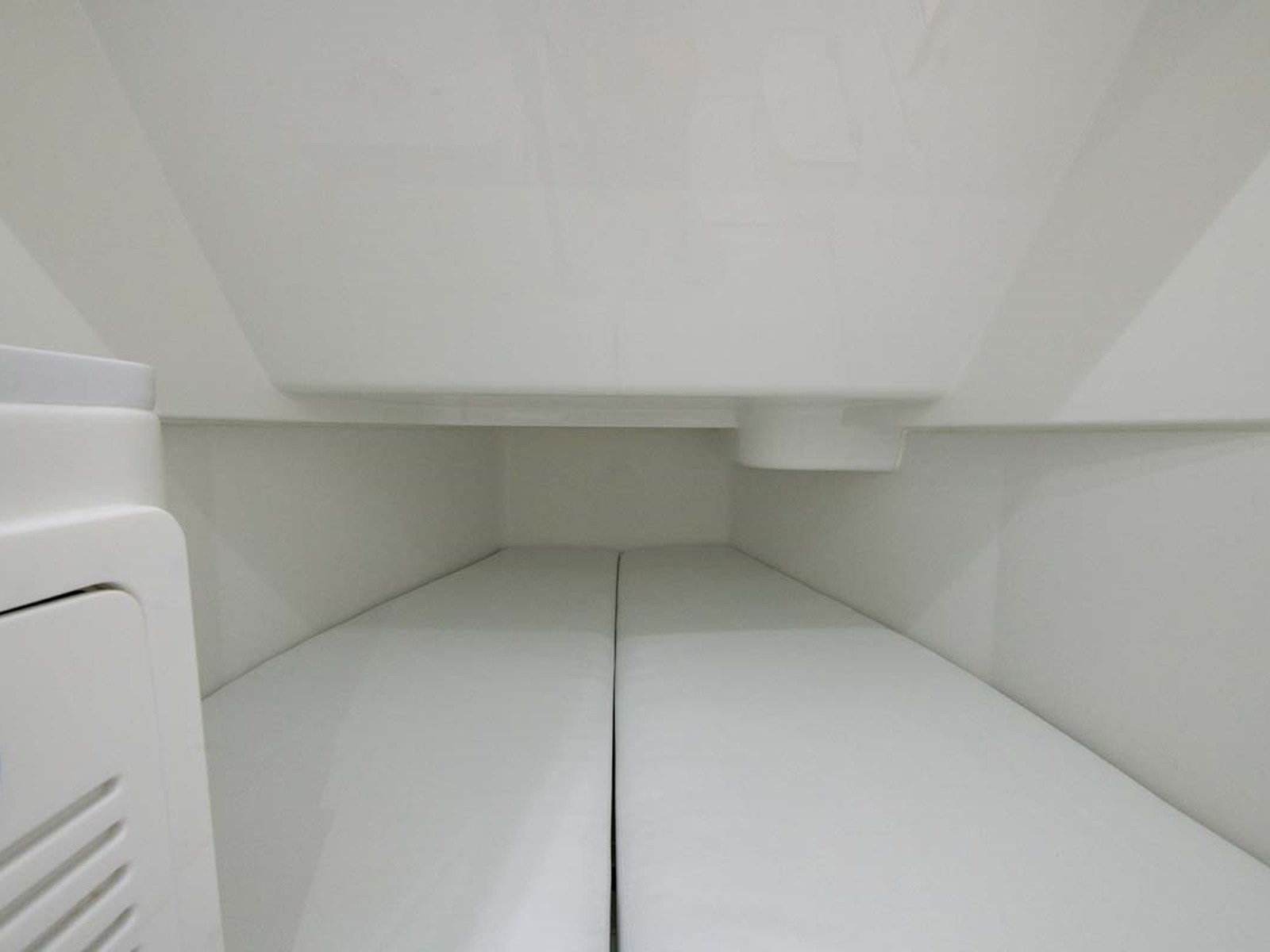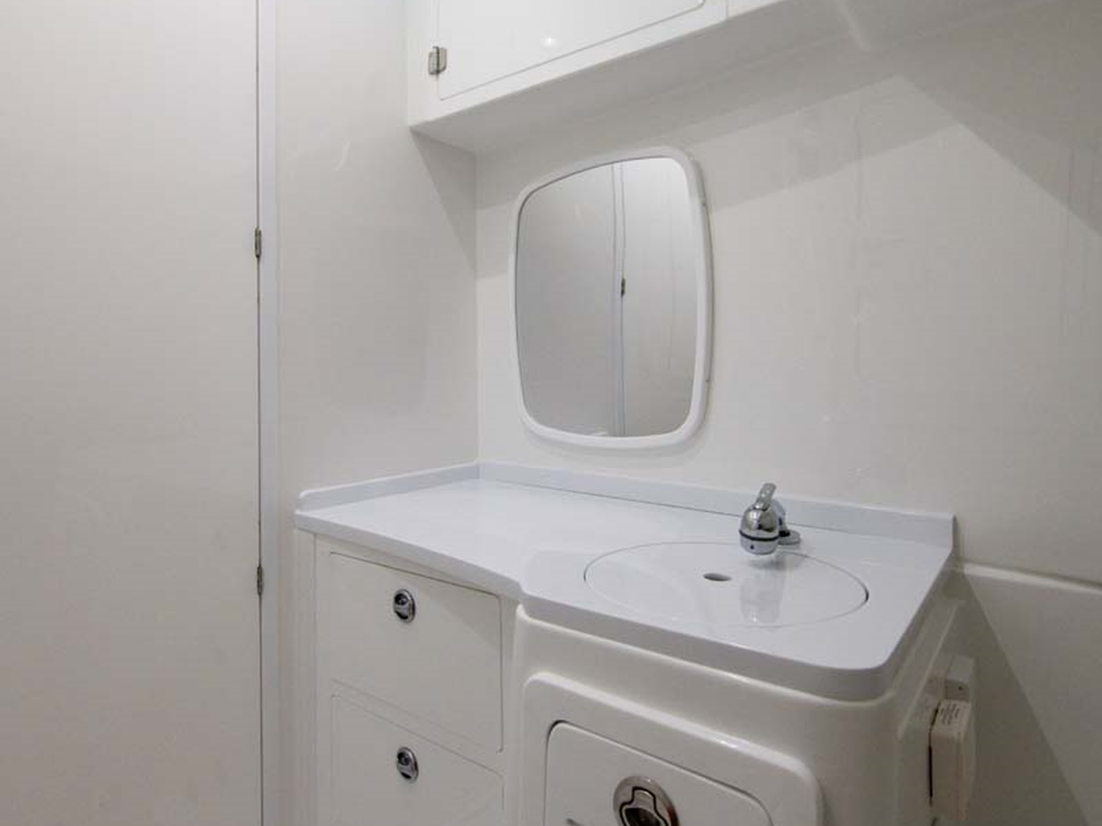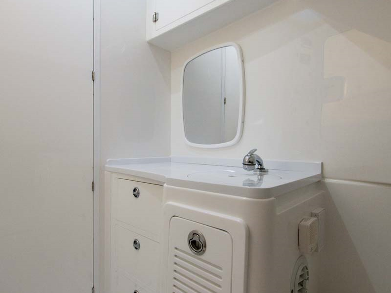 Stepping aboard you will immediately notice the spacious aft layout and rear facing lounge seat that easily converts to a tackle station by simply folding down the seat back. The unintimidating helm, like all of the Speciale’s big sisters, boasts a terrific panoramic view with the cross-curved™ non-glaring glass, clean automotive inspired helm station, 3 of the largest displays in it’s class, and three comfortable helm seats.