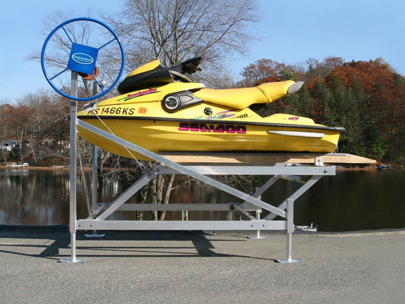 Question: How many guys does it take to keep your PWC clean and dry? Answer: None. Just put it on a PWC Lift from Shore Side Docks. Our PWC Lift offers the best of both worlds; light and easy to get in and out of the water, and rugged. Available in two different widths and lifting heights. We even make it in a double, just in case your PWC finds a mate.