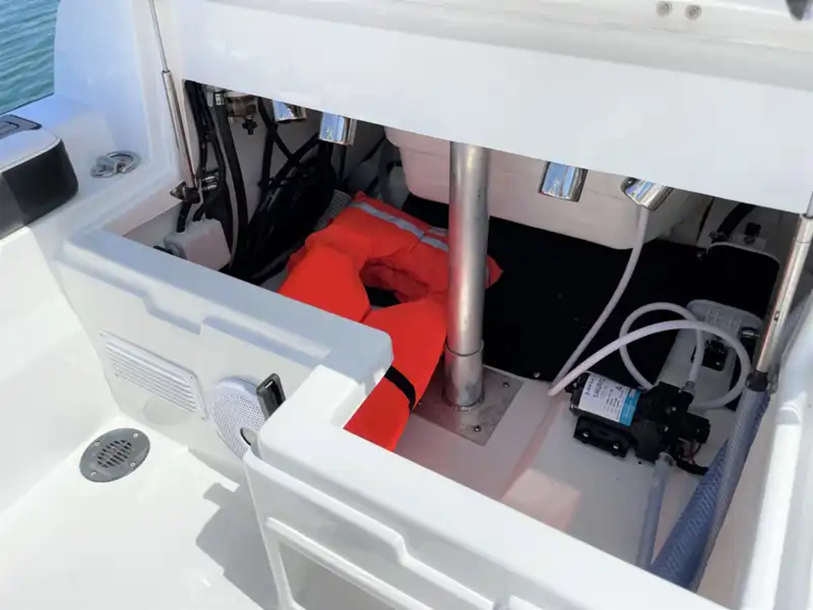 - Console dash accommodates a 9″ chartplotter, gauges, stereo and handheld VHF.