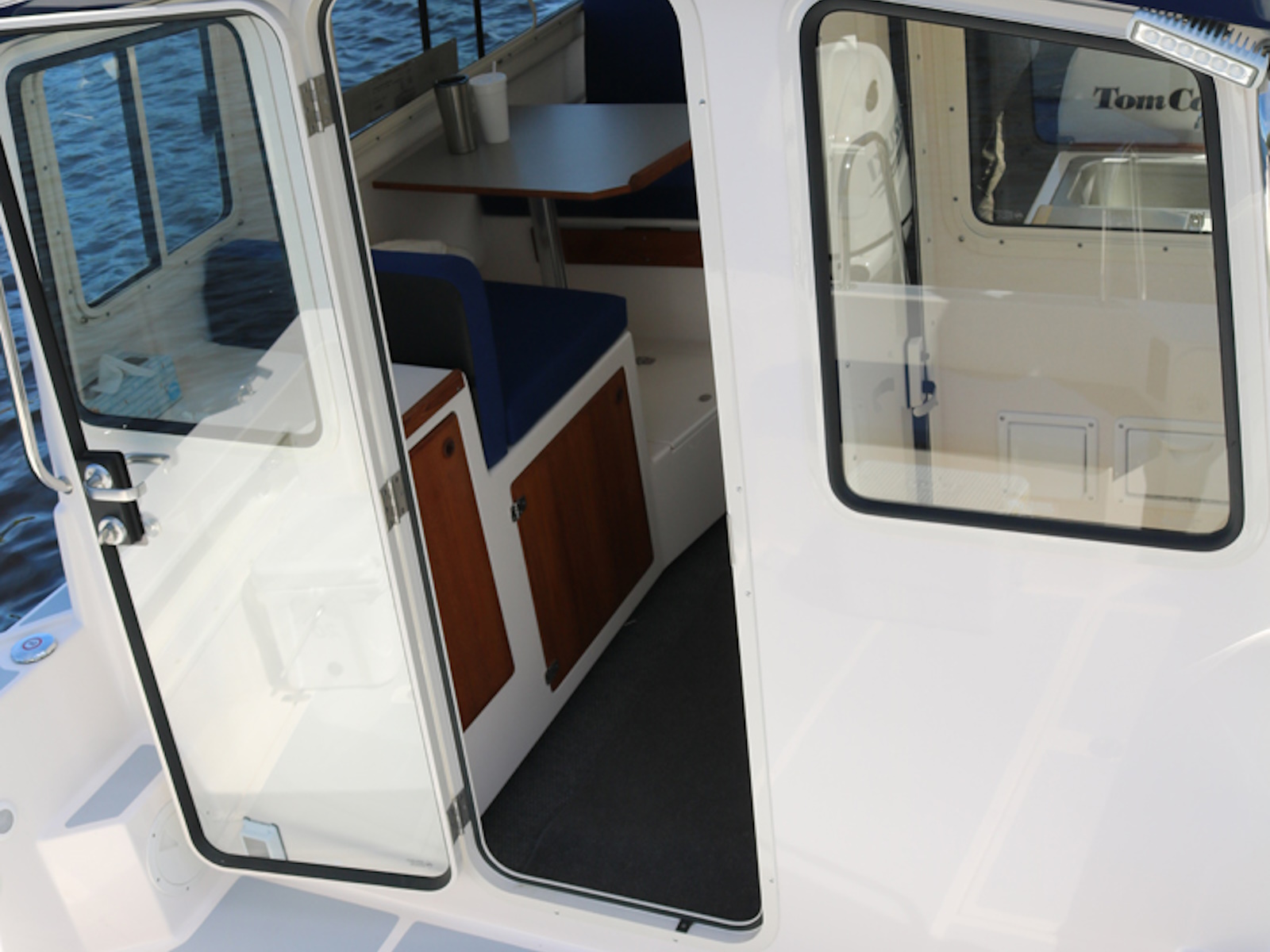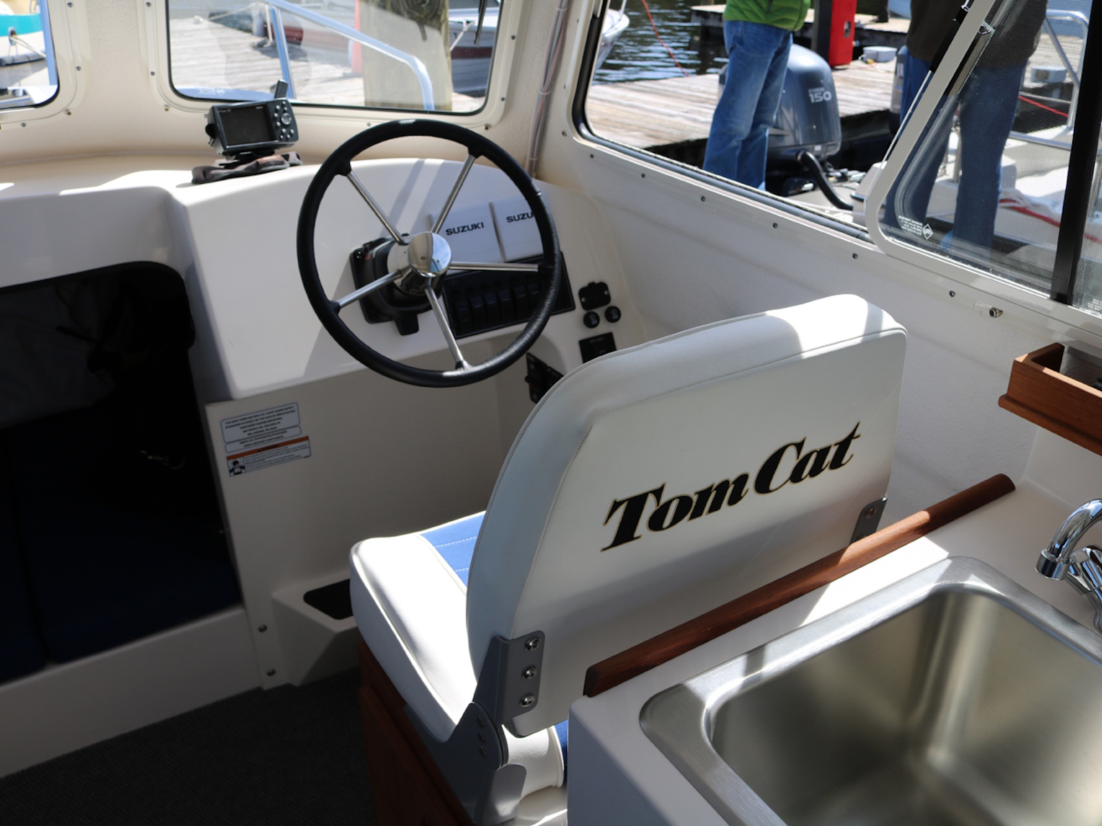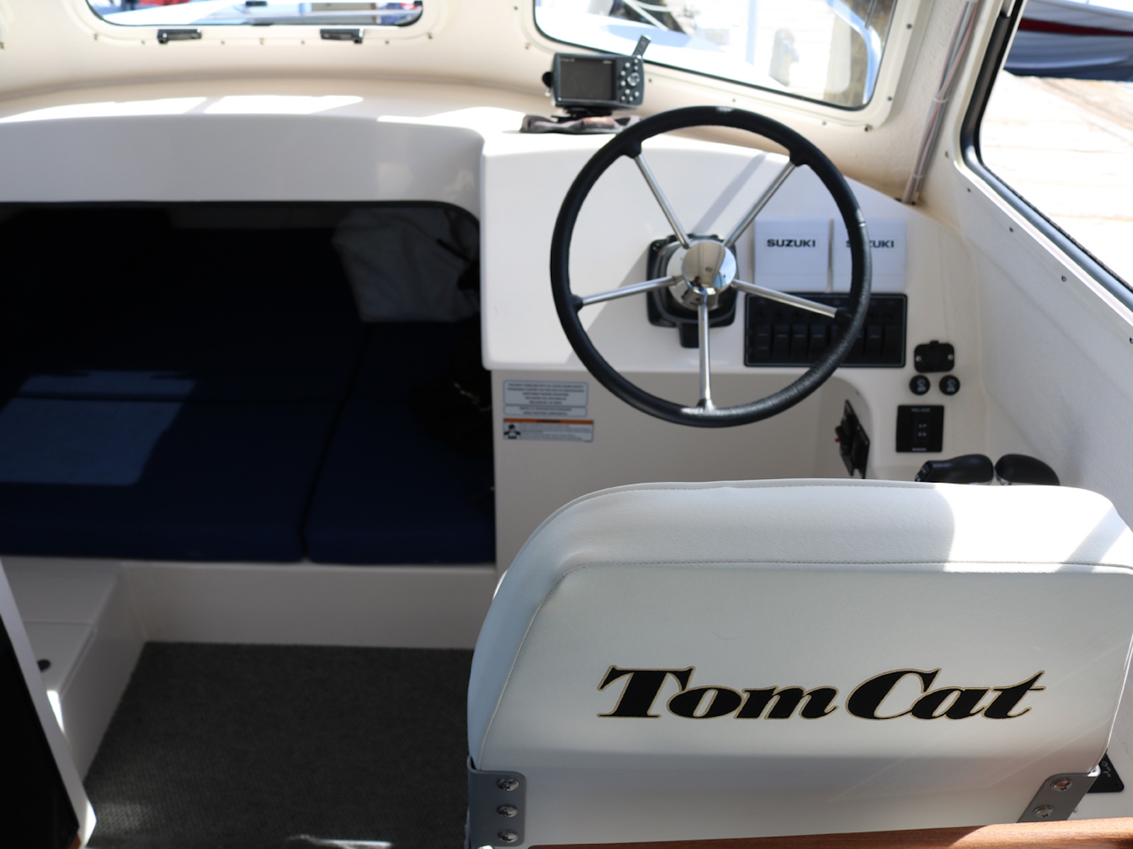 The Tomcat 255 rides and corners smoothly without any roll. It tracks straight at all speeds and runs flat and dry. The railings are all made of the highest grade 316 stainless steel and are oversized for extra strength and safety! Four foot insulated fish boxes with macerators provide plenty of room for the days catch. They also serve well as additional cockpit storage. The Tomcat 255 rides and corners smoothly without any roll. It tracks straight at all speeds and runs flat and dry. Twin engines provide maneuverability around the dock and peace of mind when out on the water. A spacious all weather pilothouse with an enclosed head and shower, make the Tomcat 255 a very smart trailer able vessel.