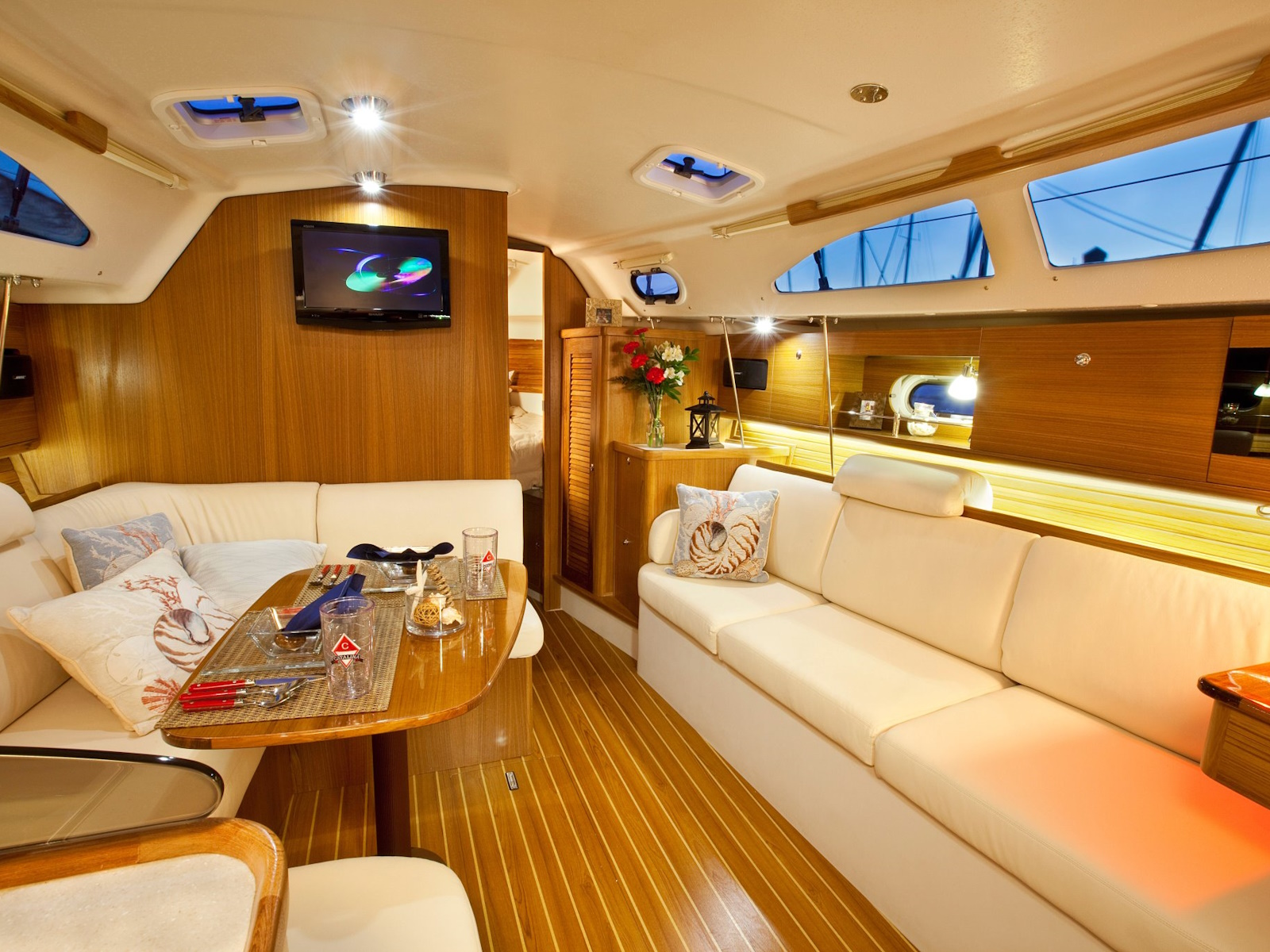 Main Cabin Cabinets Port & Starboard w/matched Grain Doors and Privacy Screens over Hull Ports
