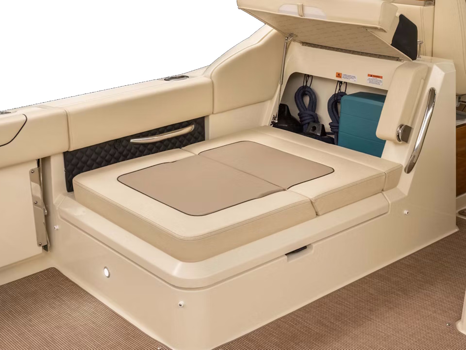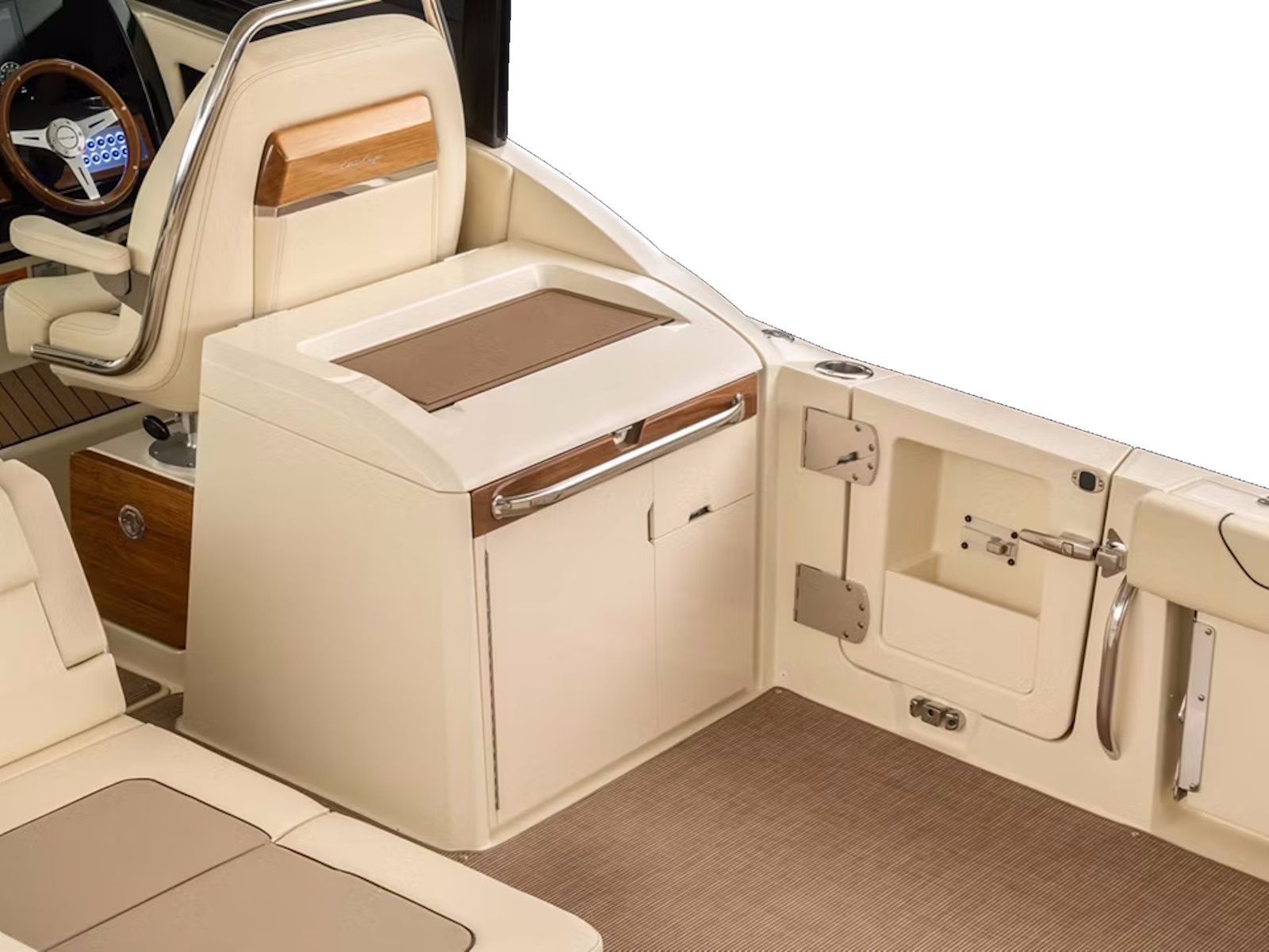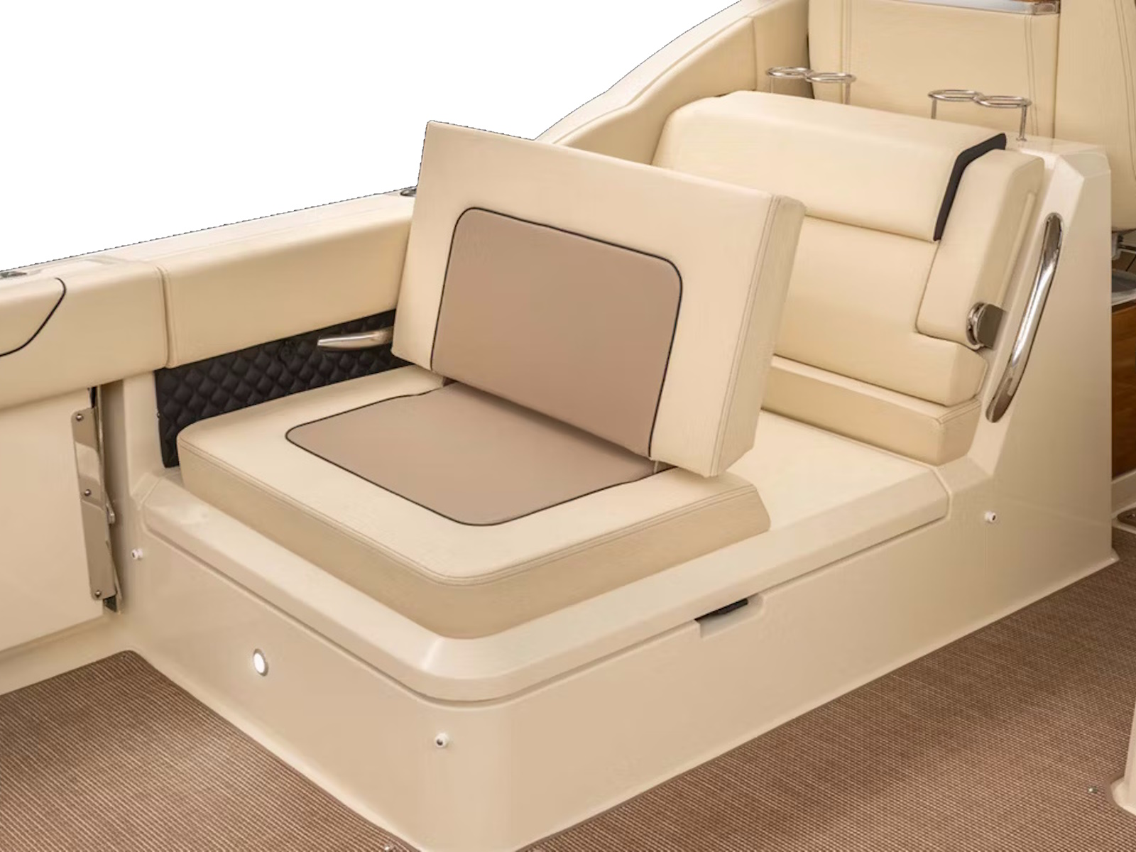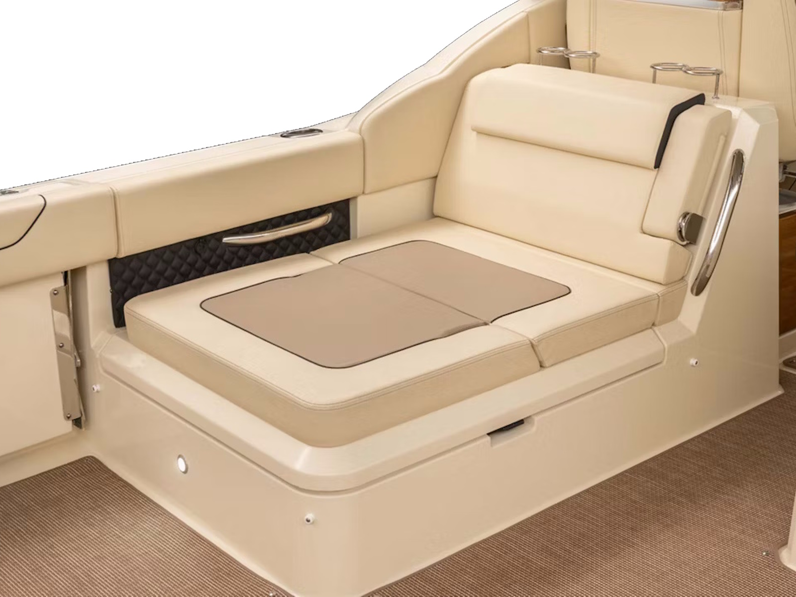 The portside aft-facing lounger includes a flip-up armrest and integrated headrest, as well as two hidden storage areas. For ease of dining at the optional teak cockpit table, a portion of the seat cushion can also be positioned to create an aft-facing seat.