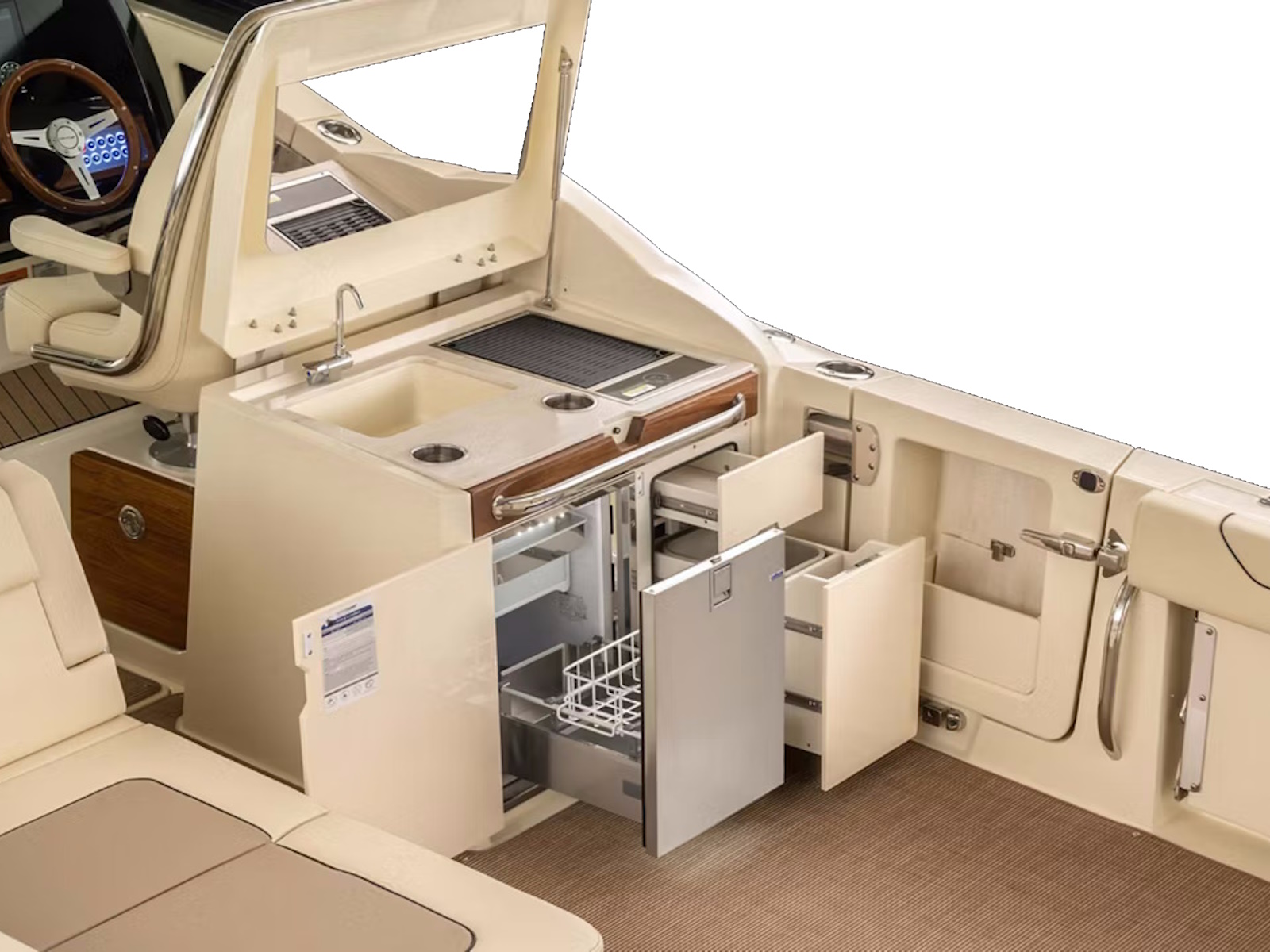 The pleasure of hosting on the water can only be enhanced by the convenience of a well-equipped galley. A stainless steel refrigerator, solid-surface countertop, sink, and plenty of storage, as well as an optional grill, are all at your disposal.