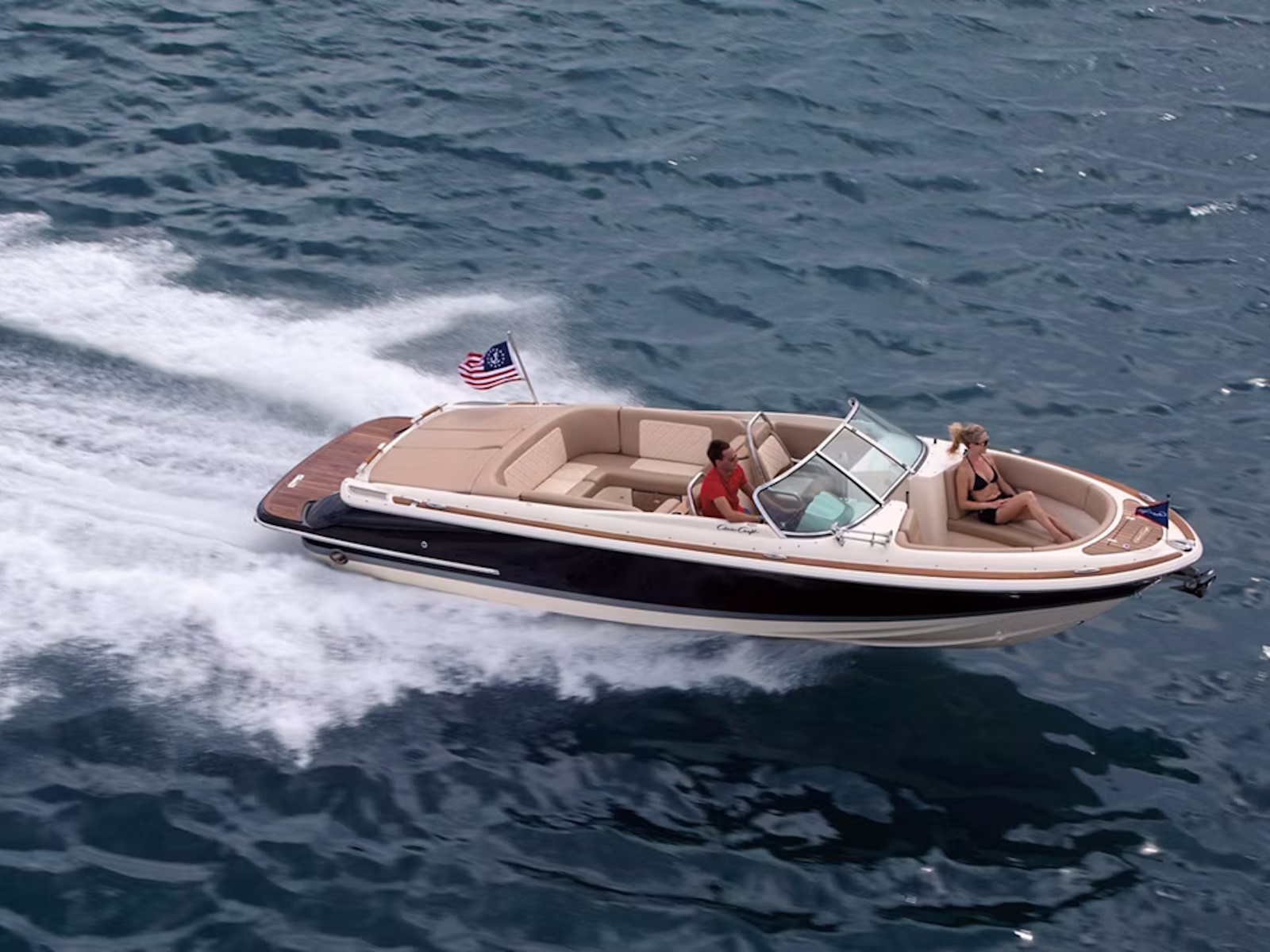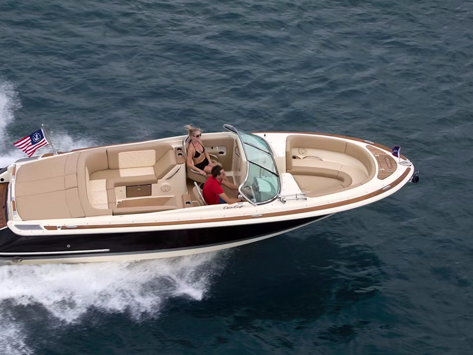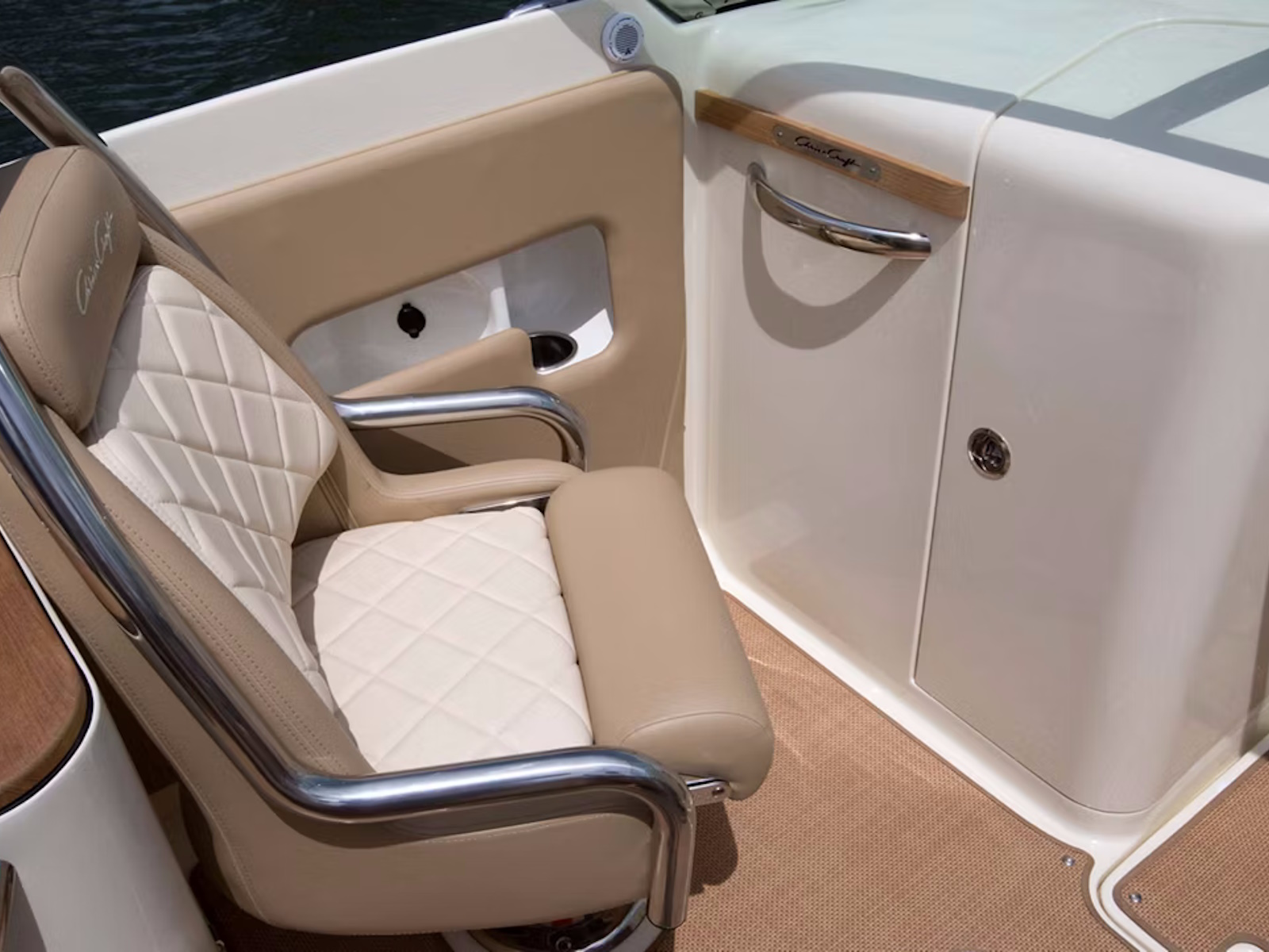 Enjoy plenty of storage, including areas specially designed to stow your fenders, anchor, and cooler. Integrated cupholders, flush-mounted stainless steel deck plates, teak grab rails, sleek pop-up cleats, and the classic dual trumpet horns all exemplify its Chris-Craft heritage.