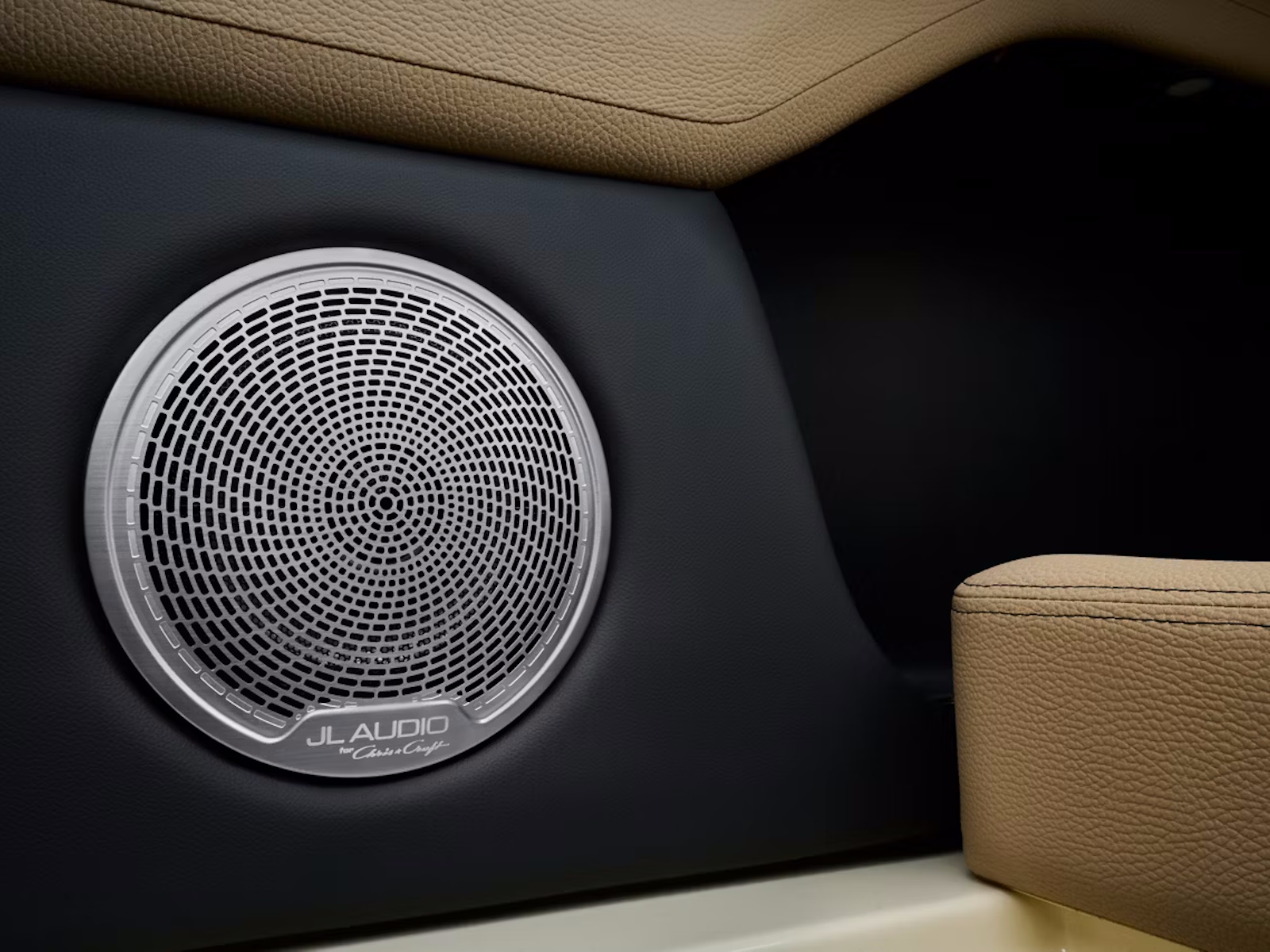 Enhancing your onboard experience, the Sportster 25 options include a premium audio system with 6 JL Audio Speakers and a 10" subwoofer, all elegantly finished with custom Chris-Craft stainless steel speaker grills, delivering superior sound quality and an unmatched level of sophistication.