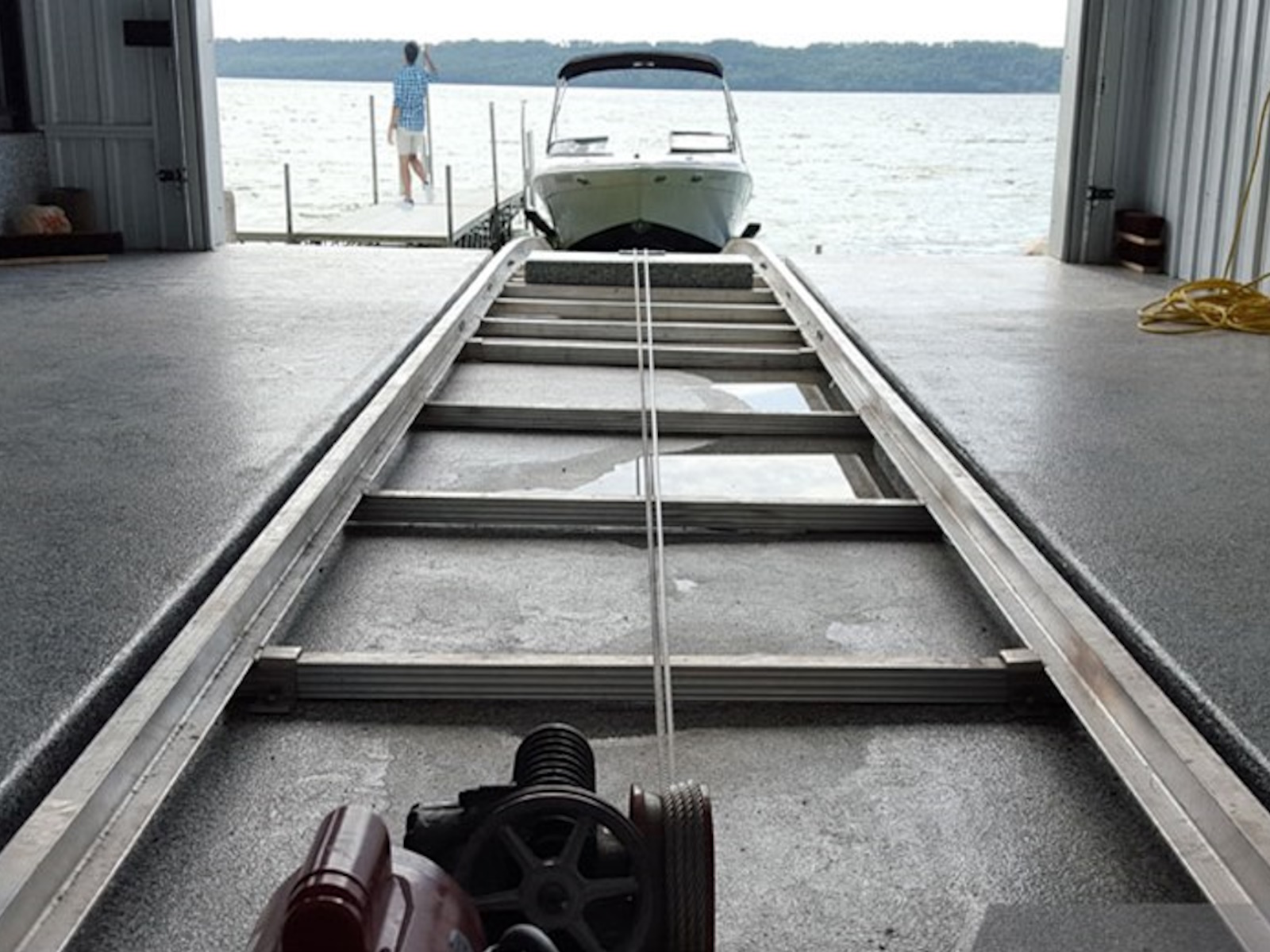 Hewitt's pontoon and boat rail system, called the roll-a-rail, is a convenient way to fully protect boats, pontoons and even float planes from water and weather damage. The boat rail system makes it easy to move your boat or pontoon to and from the water. With the trolley and track system, you can inspect and perform periodic maintenance or repairs with ease for both residential & marine rail system applications. Roll-A-Rail is built to Hewitt’s exacting standards and constructed from corrosion-resistant structural aluminum. Available in a 4500 lb model or a 6500 lb model that features heavier gauge stainless steel cable and an extra heavy-duty trolley. Electric motor brake for steep inclines comes standard on 6500 lb model.