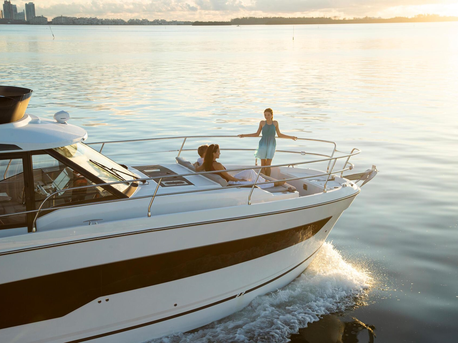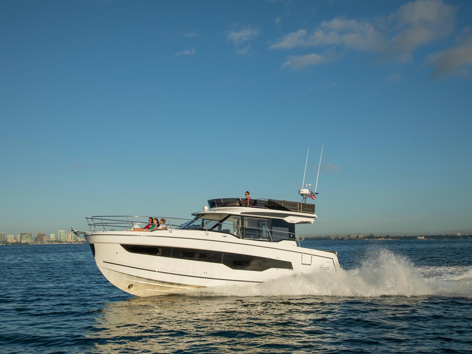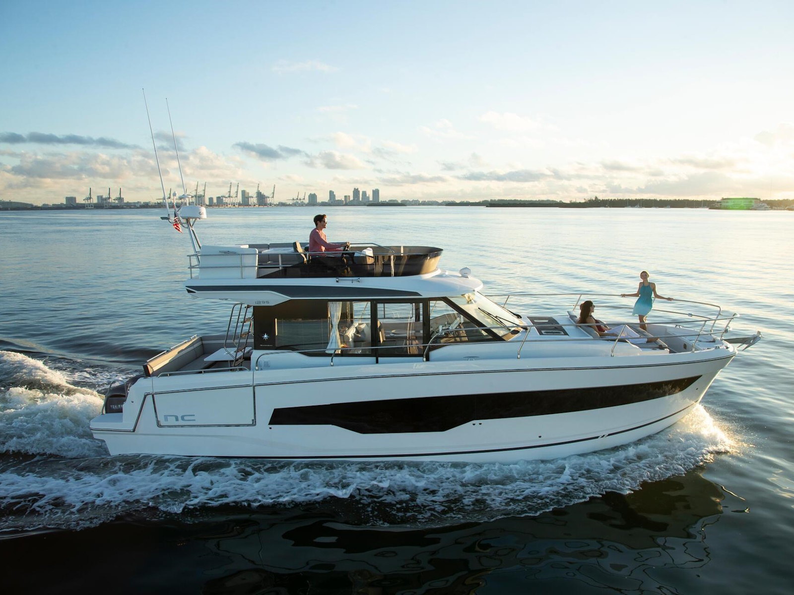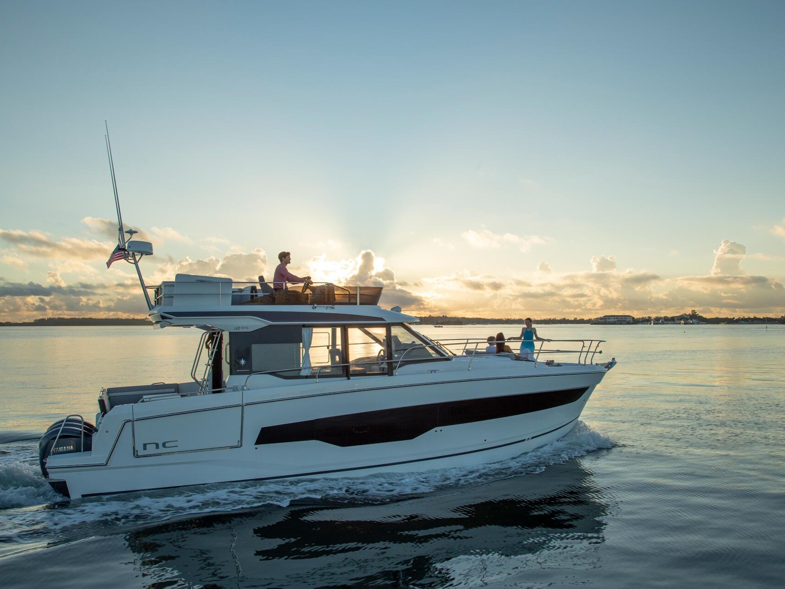 You'll fall in love with her contemporary, elegant lines, featuring new windows in the hull. This signature feature by Jeanneau lends an exclusive style to the flagship of this historic line, equipped with triple 300 HP engines.