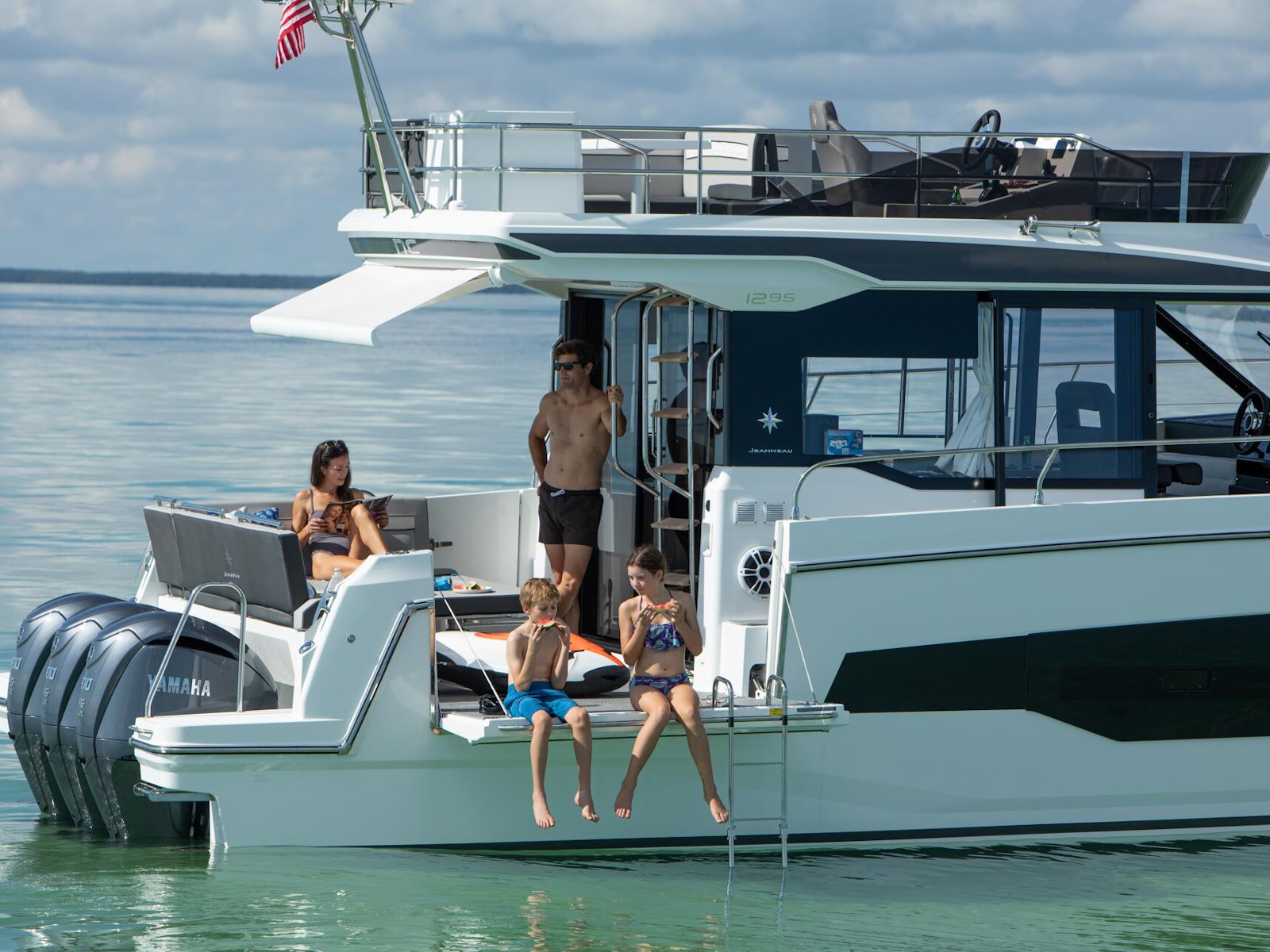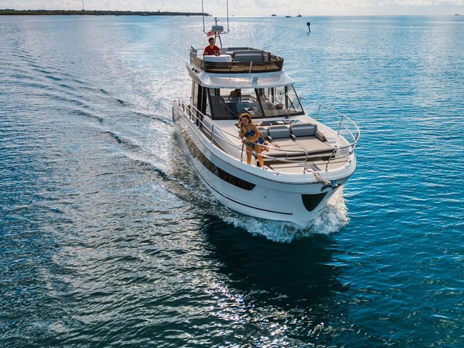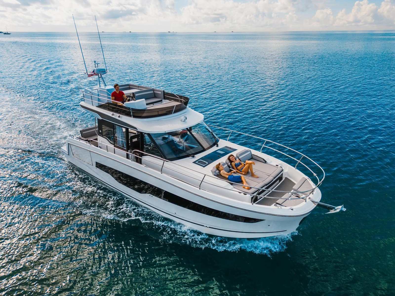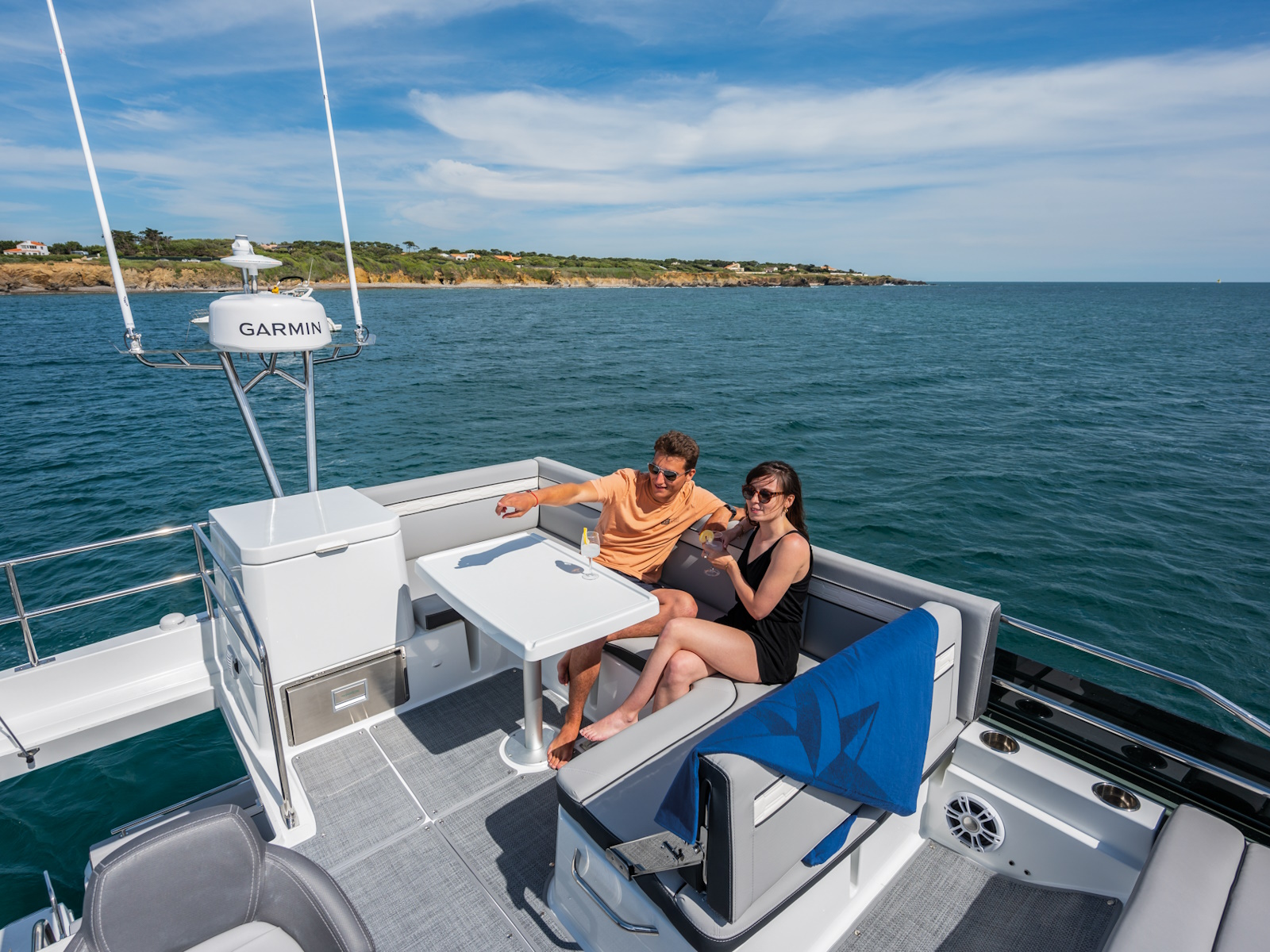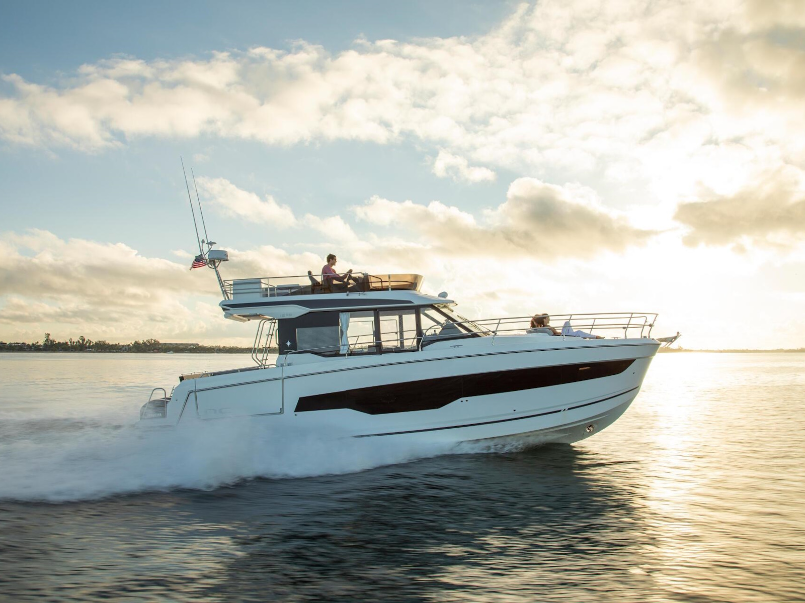 You'll fall in love with her contemporary, elegant lines, featuring new windows in the hull. This signature feature by Jeanneau lends an exclusive style to the flagship of this historic line, equipped with triple 300 HP engines.