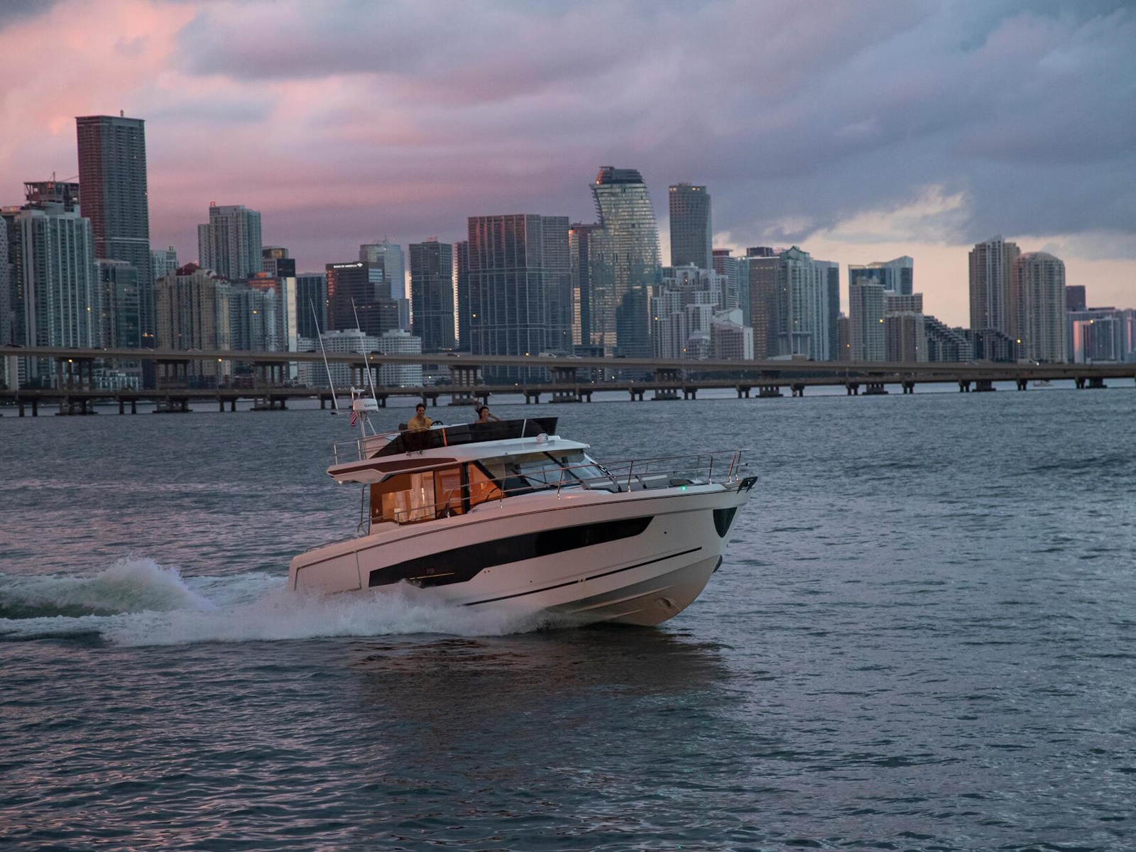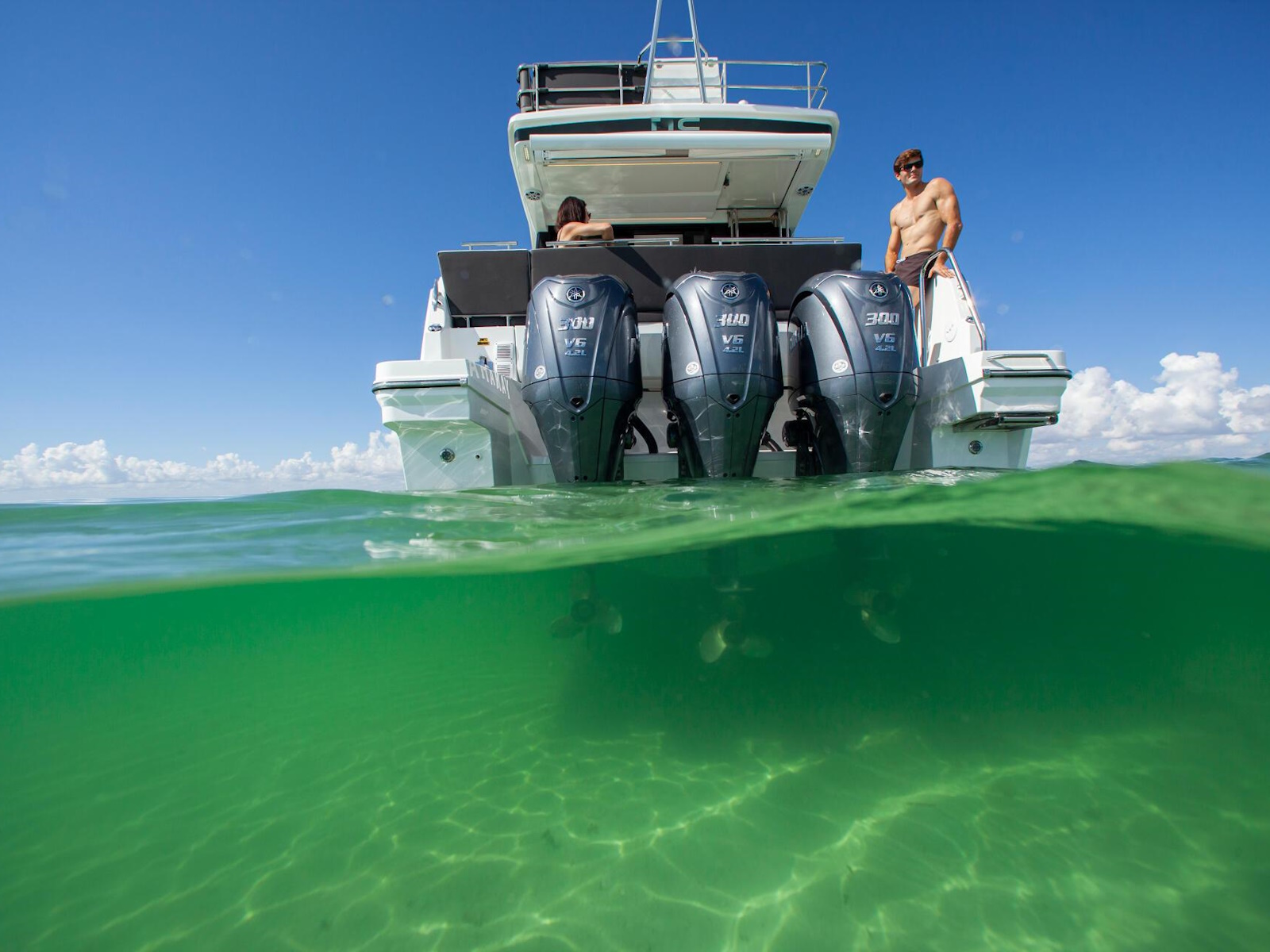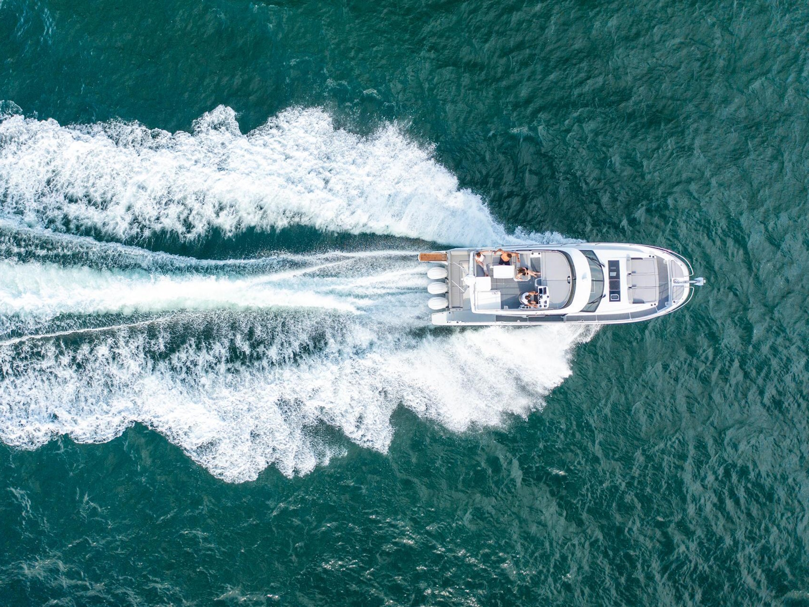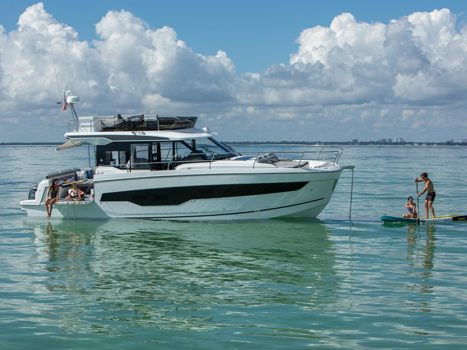 You'll fall in love with her contemporary, elegant lines, featuring new windows in the hull. This signature feature by Jeanneau lends an exclusive style to the flagship of this historic line, equipped with triple 300 HP engines.