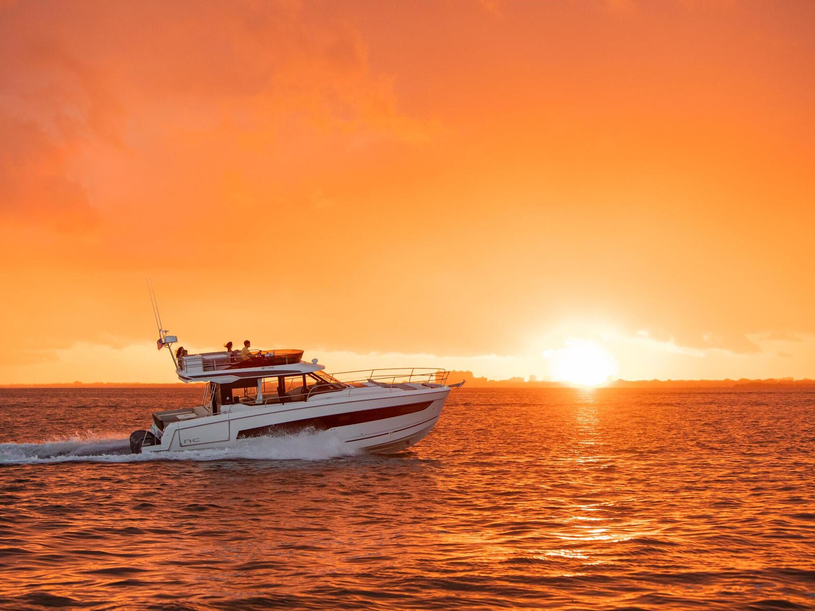 You'll fall in love with her contemporary, elegant lines, featuring new windows in the hull. This signature feature by Jeanneau lends an exclusive style to the flagship of this historic line, equipped with triple 300 HP engines.