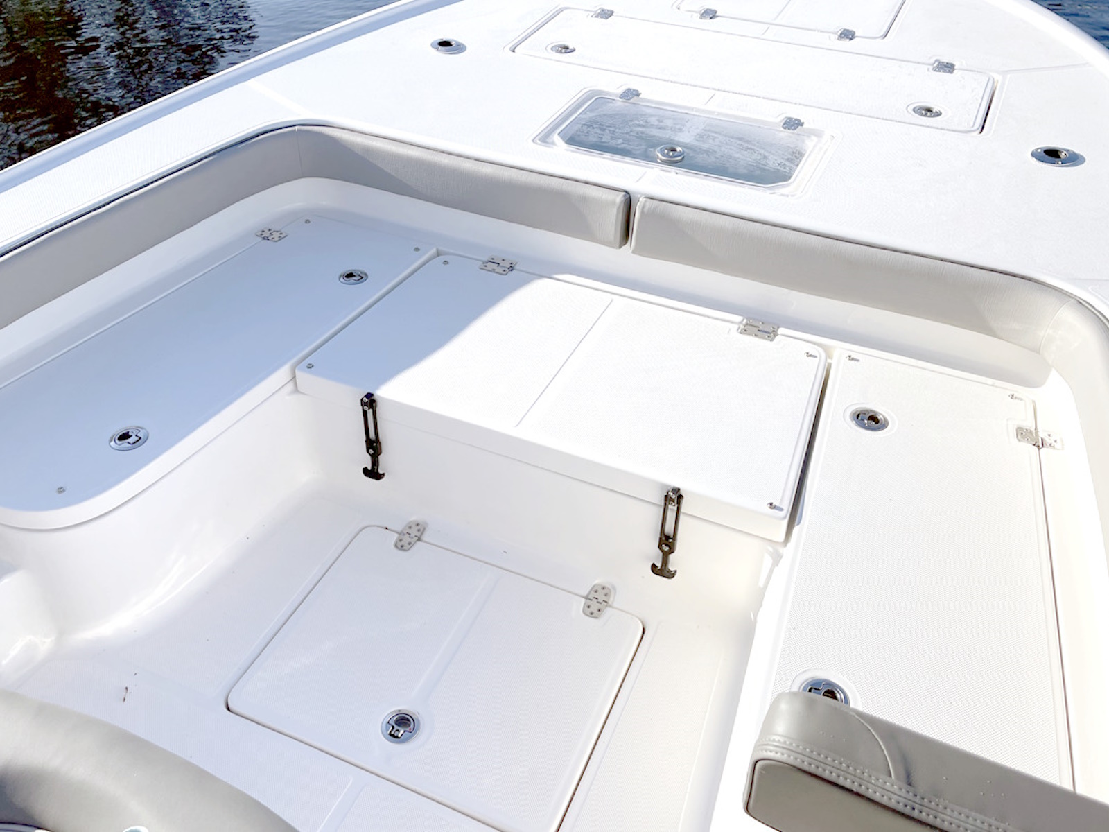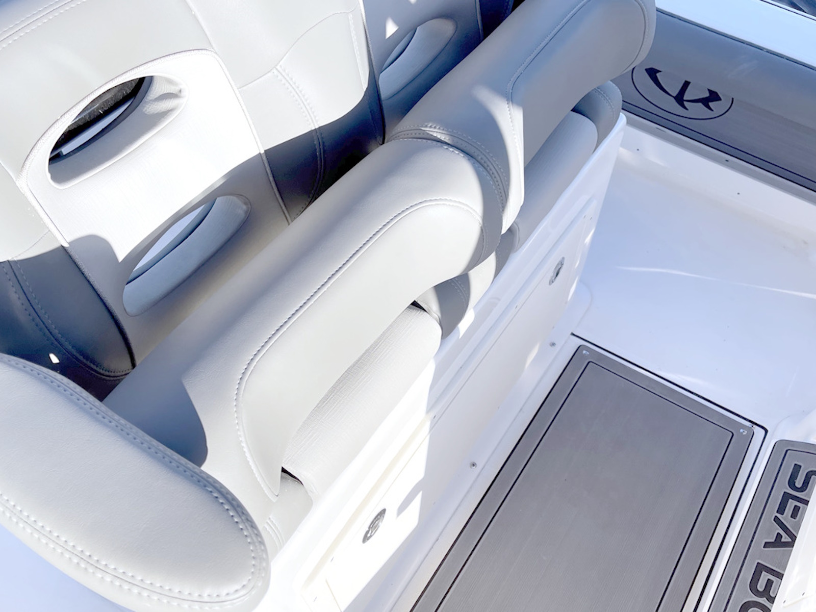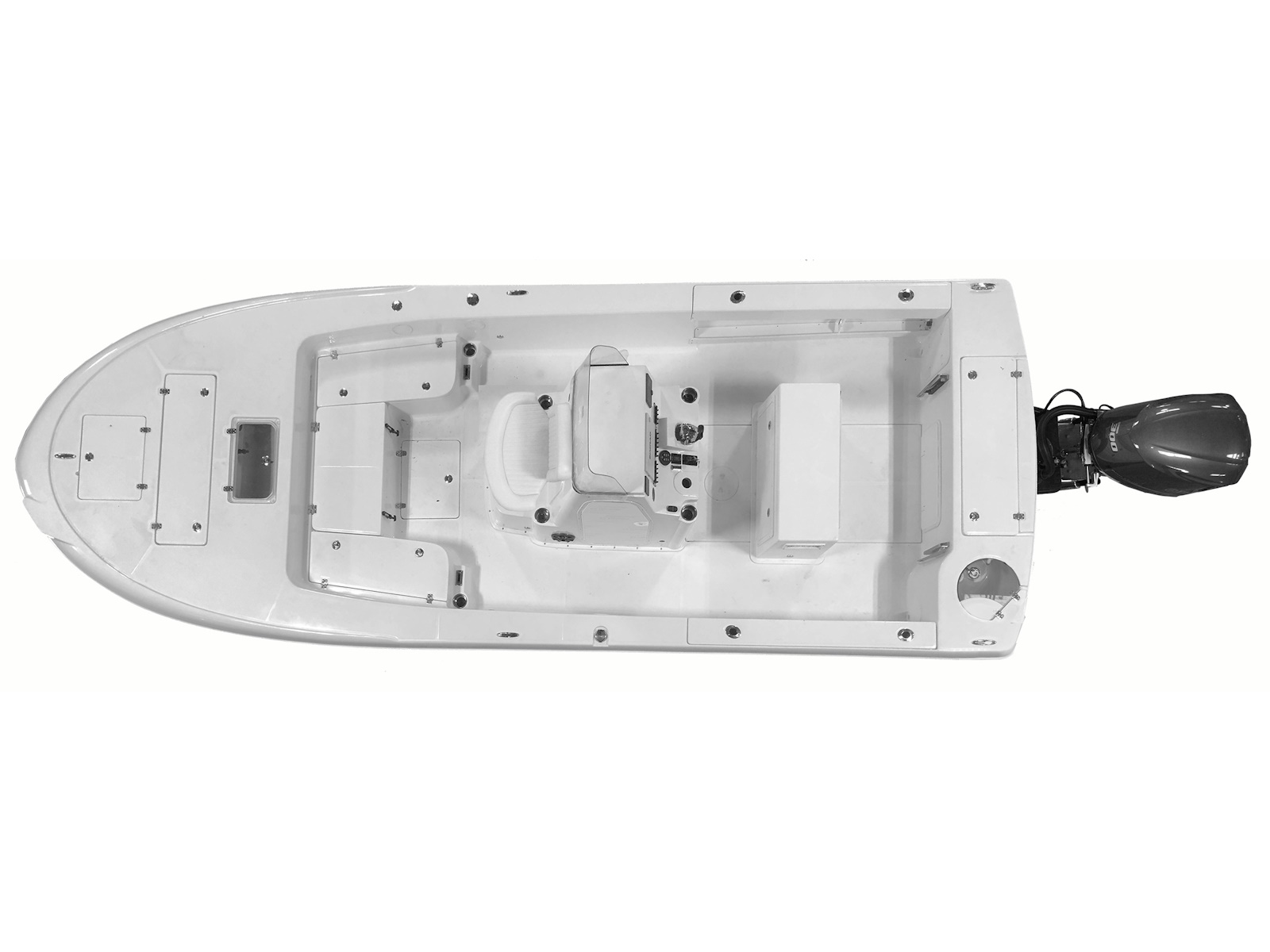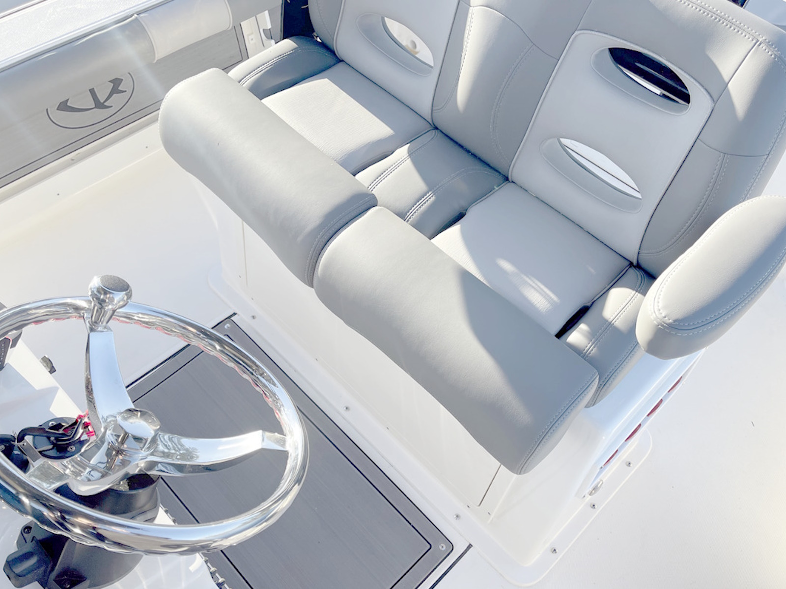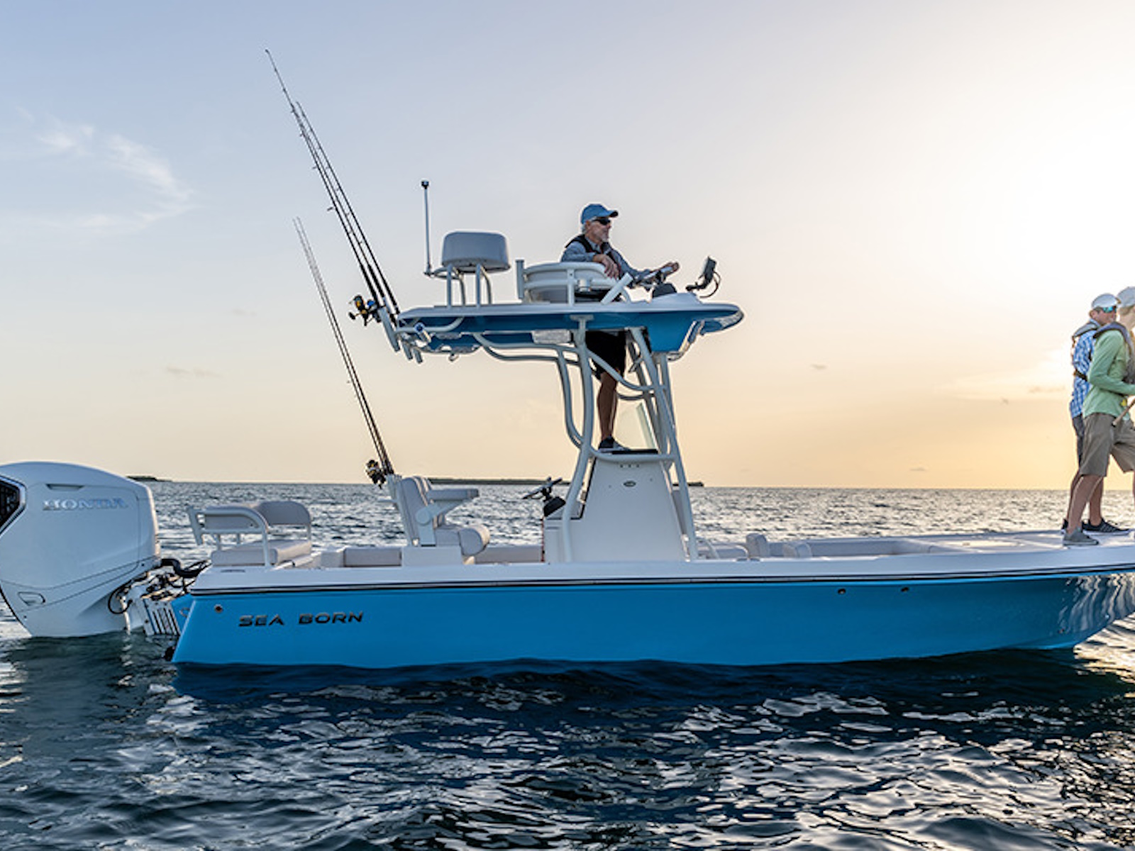 The flagship of the Sea Born bay boat lineup, the FX25 turns heads as one of our most sought-after models for the serious angler. Built on a stable 105″ beam with a single-step hull for improving performance, the FX25’s sportfish-style transom and large forward casting deck make it a true hybrid and dual threat for both inshore or offshore.