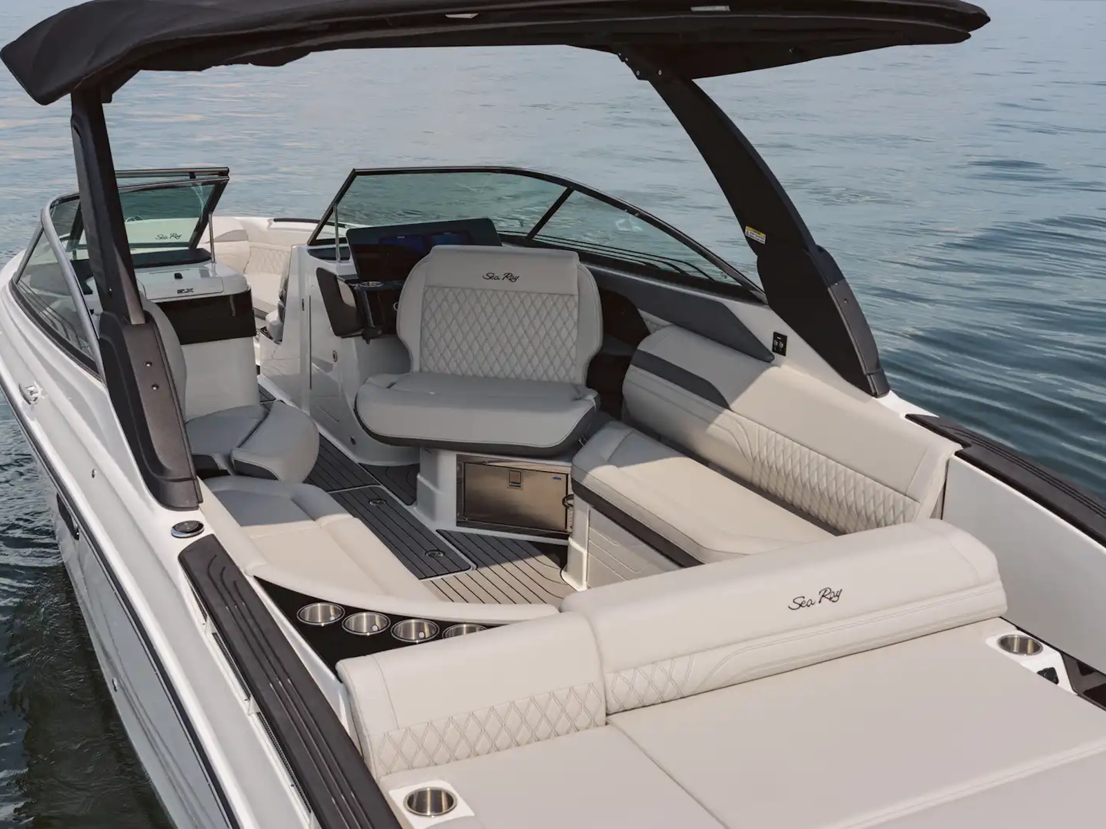 After dark, LED lights and courtesy lighting illuminate the SLX 280 from bow to stern for an extended day on the water. LED RGB-W color-changing lighting is available with the Lighting Bundle to add a playful pop of color or set the mood for nighttime cruises. For a feature that’s sure to impress guests, select both the Lighting Bundle and the Power Tower to enhance the cockpit with a projection light that shines the Sea Ray logo onto the floor.