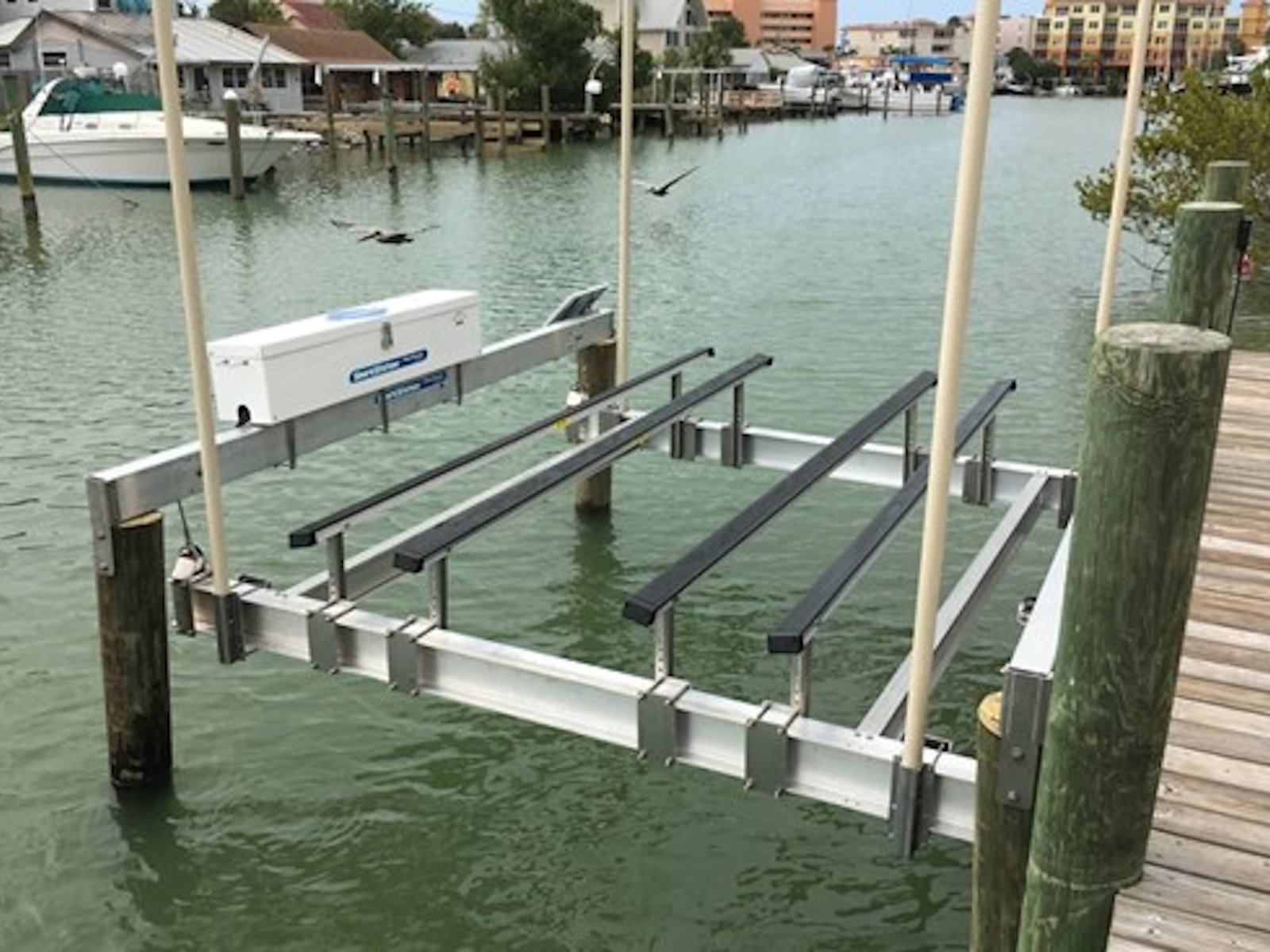 This lift design is a traditional approach. Install the lift tubes high for tidal fluctuation or deck-level for a low profile look that doesn’t interfere with accessing your boat.