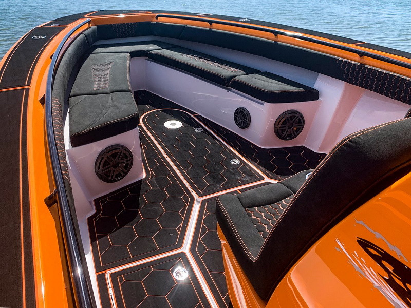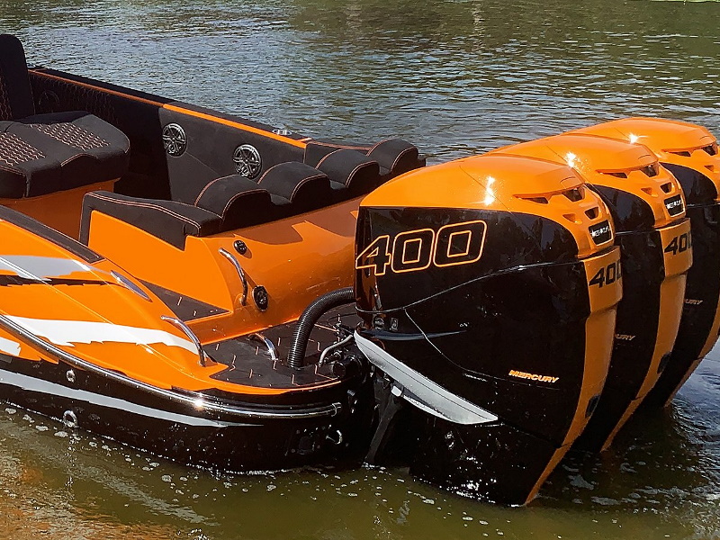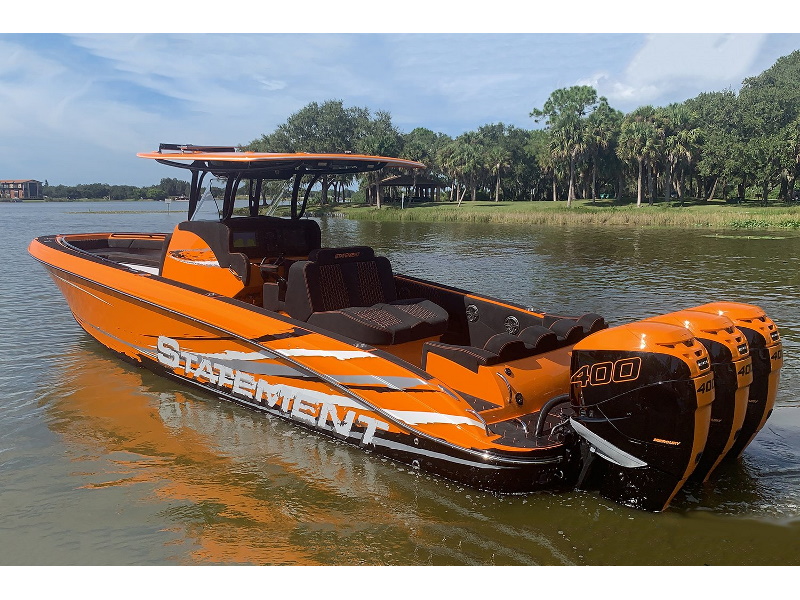 THE ULTIMATE IN CENTER CONSOLE PERFORMANCE The flagship of our center console line, the 380 Open represents the perfect combination of style and performance. Luxurious seating throughout can accommodate a dozen of your closest friends, while an advanced, twin-step hull design creates a soft, dry ride when the chop kicks up.Like all Statements, the 380 Open offers a tremendous range of design options, from custom hull and outboard paint, to high-end upholstery, to your choice of triple or quad Mercury power packages. How will you customize yours?. ADVANCED HELM STATION. With your choice of single or twin Garmin multi-function displays, fully digital switching and instrumentation, advanced Mercury controls, a black acrylic dash panel, and a 1/2” wraparound windshield, the 380 Open’s helm station is as clean as they come. Upholstered accents and a color-coordinated drop-down footrest provide additional security and comfort. HIGH-END COMES STANDARD. What some builders offer as costly add-ons, Statement builds in. Every 380 Open is equipped with high-end contoured seating throughout, next-generation digital switching, high-performance trim tabs, hydraulic steering, LED accent lighting, fully finished fiberglass hardtop and more. TWIN-STEPPED RUNNING SURFACE.The 380 Open and 350 Open employ a unique, twin-step hull design for exceptional speed, efficiency, and ride. The steps draw in air which creates a zone of aerated, low pressure water behind each step. This reduces drag for better fuel efficiency and increased speed while also improving dynamic stability for a flatter, more stable ride at speed. ADVANCED HELM STATION. With your choice of single or twin Garmin multi-function displays, fully digital switching and instrumentation, advanced Mercury controls, a black acrylic dash panel, and a 1/2” wraparound windshield, the 380 Open’s helm station is as clean as they come. Upholstered accents and a color-coordinated drop-down footrest provide additional security and comfort.
