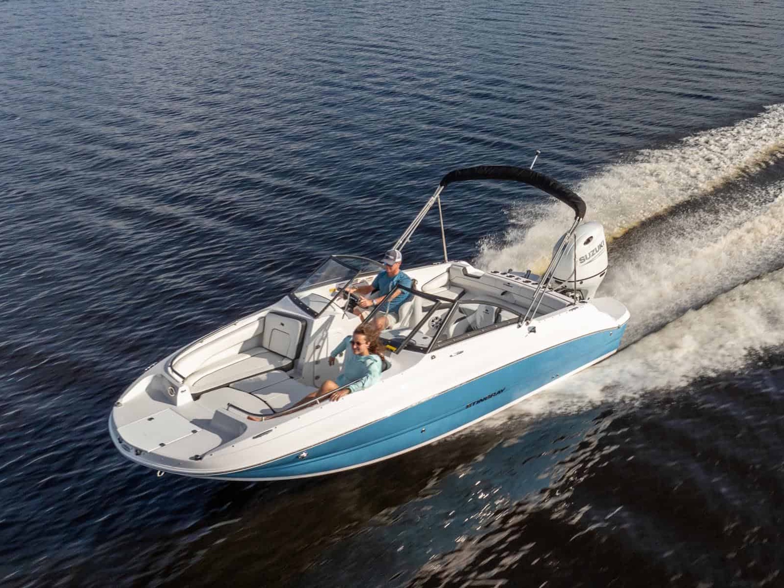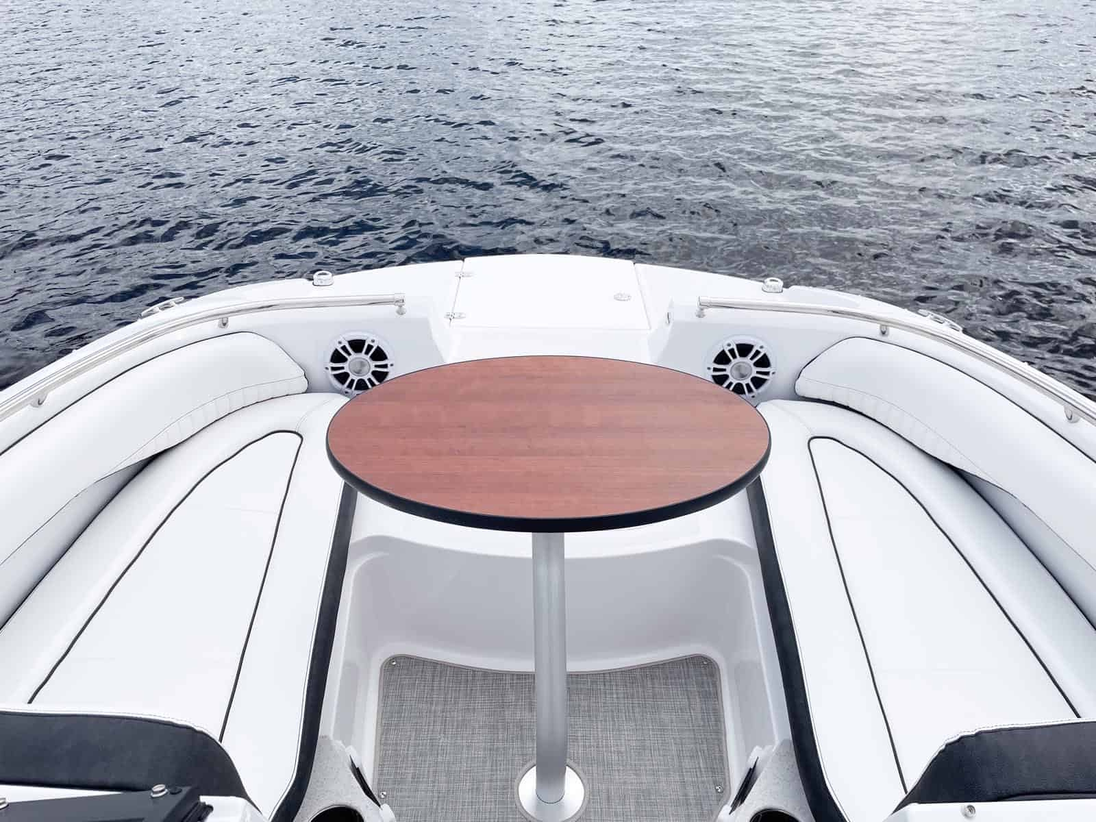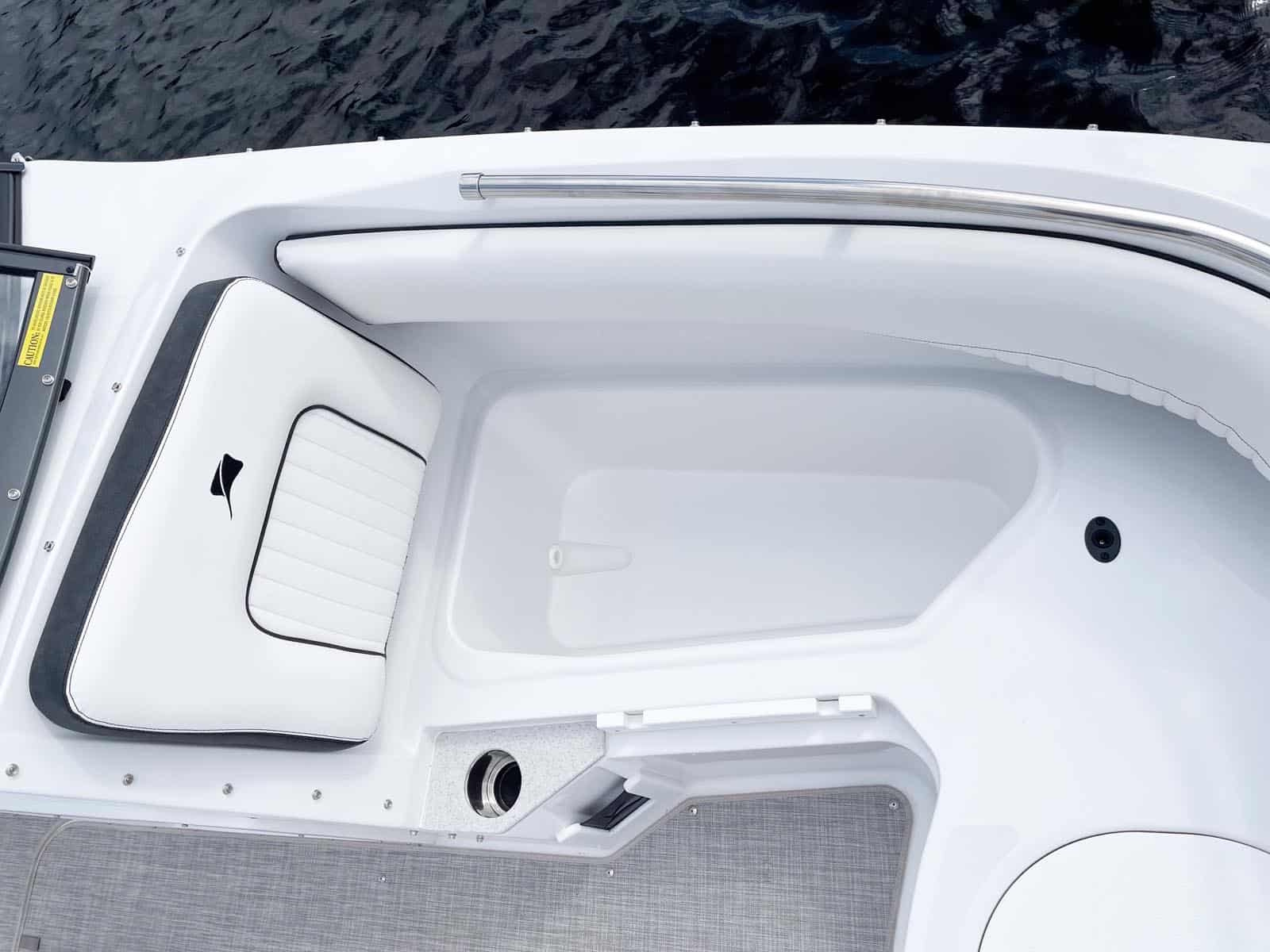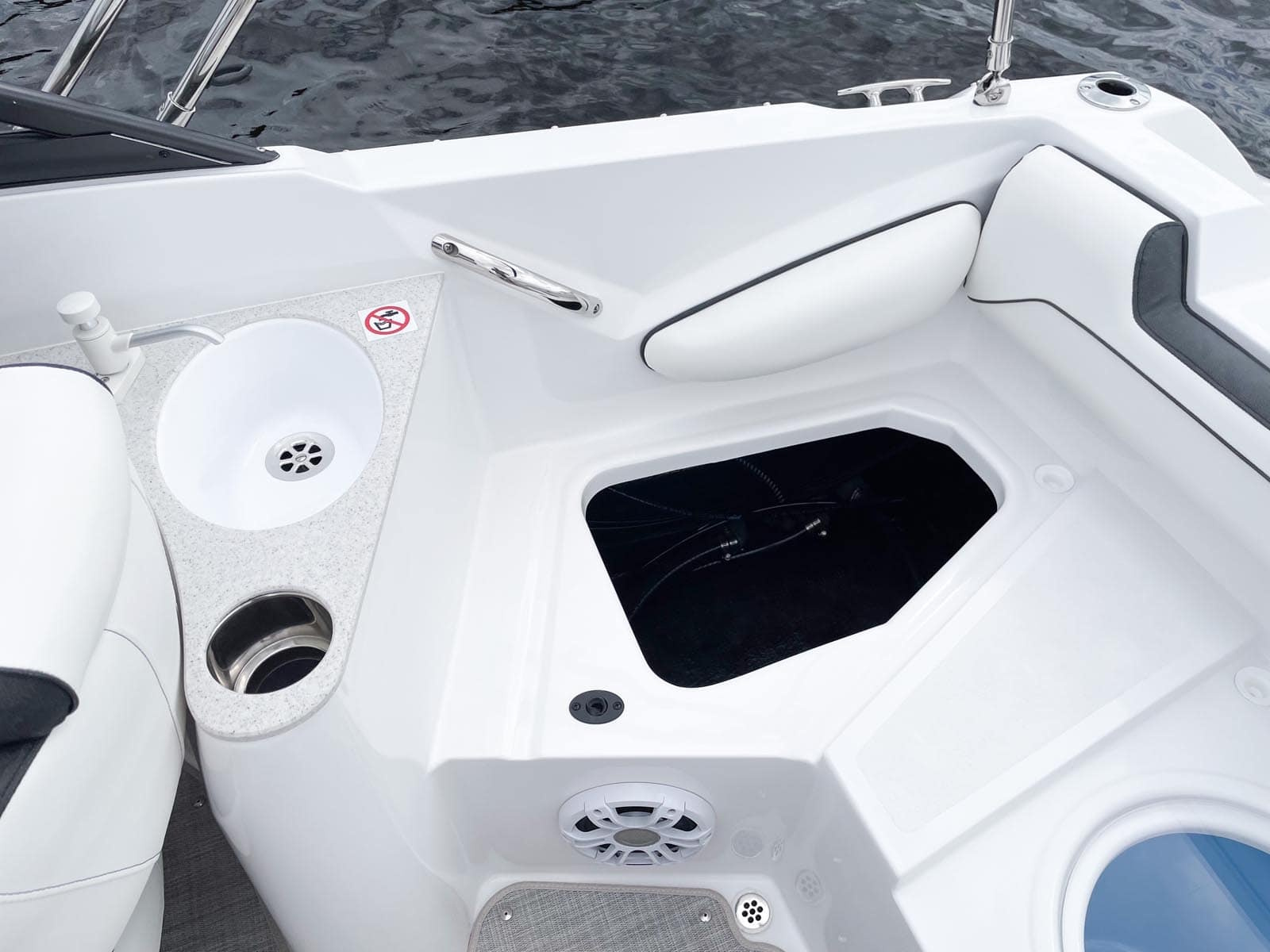 If you love the open feel of a deck boat, but like your boat to have a full windshield, you shouldn't have to choose. The 201DC Dual Console gives you all the interior room and storage space of our 192SC and the added full wrap-around windshield provides a nice shield from the wind while underway. This version gives you two sport bucket seats with bolsters. Deep cockpit and bow areas provide extra safety and security for your passengers. Behind the captain is a solid-surface countertop with a sink and faucet. A mix of dual console deck boat and traditional runabout seating works together to give you a roomy boat with seating for up to 10 passengers.