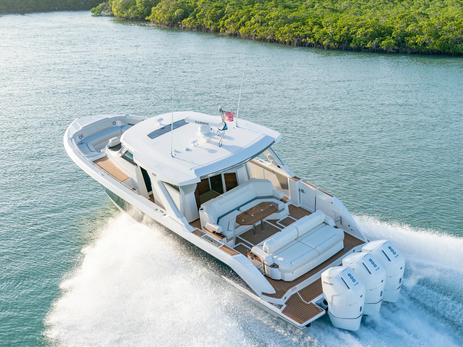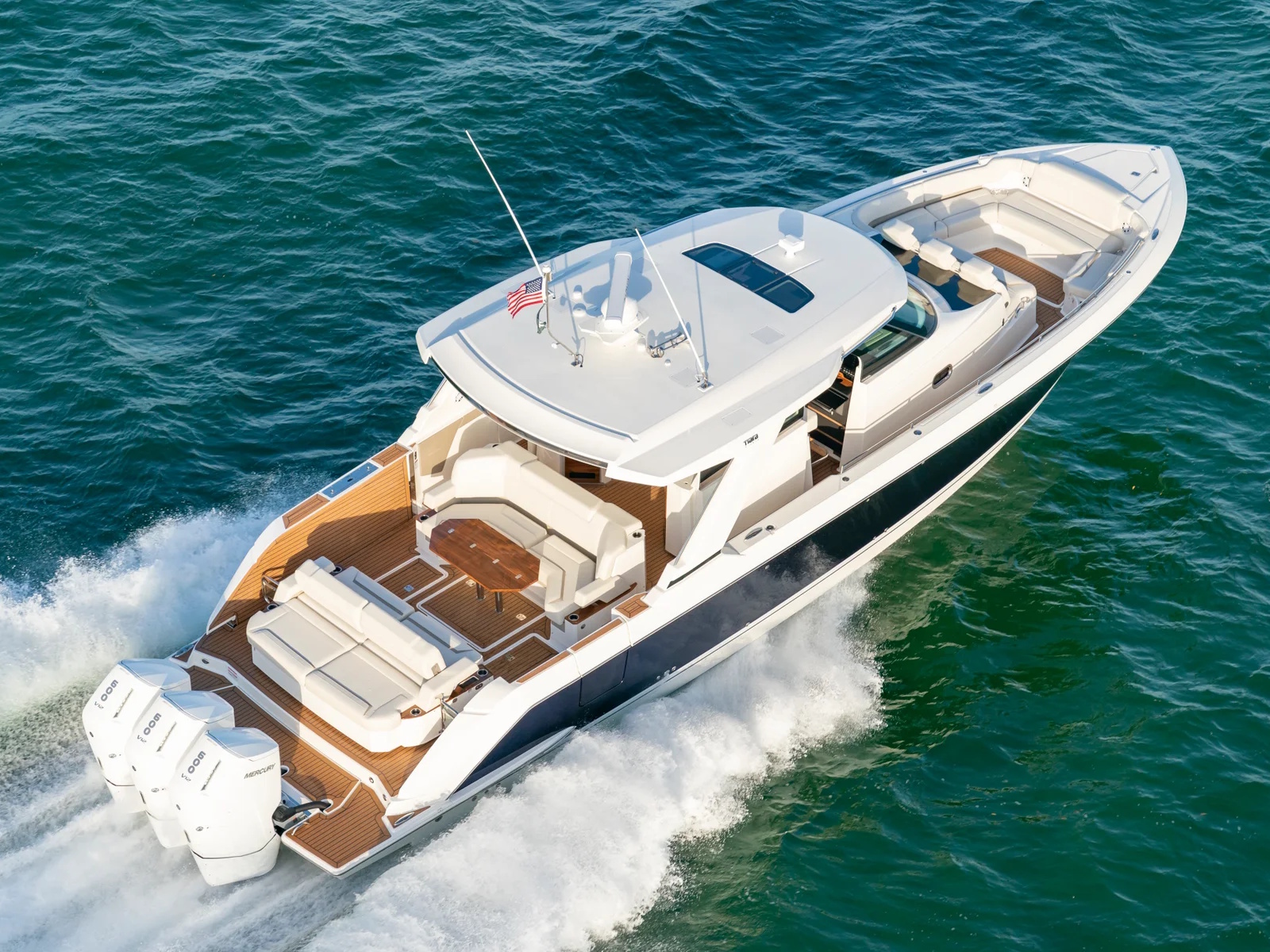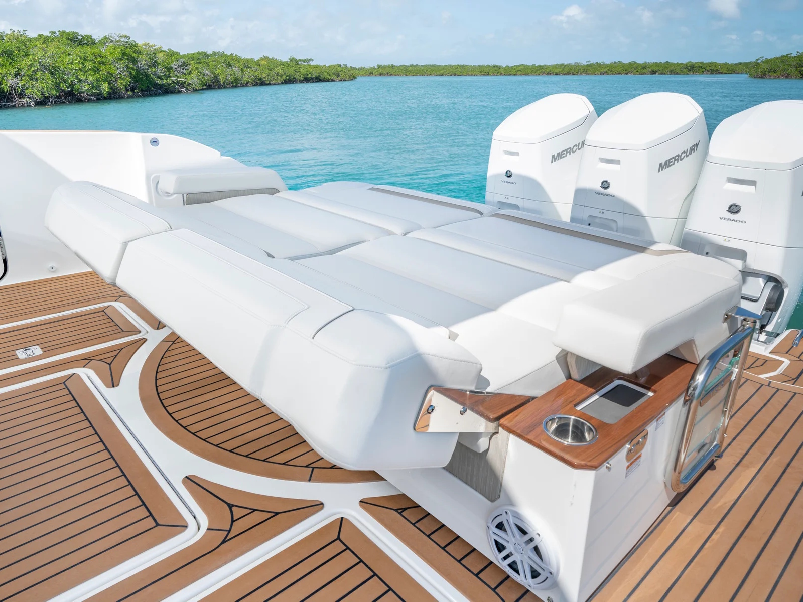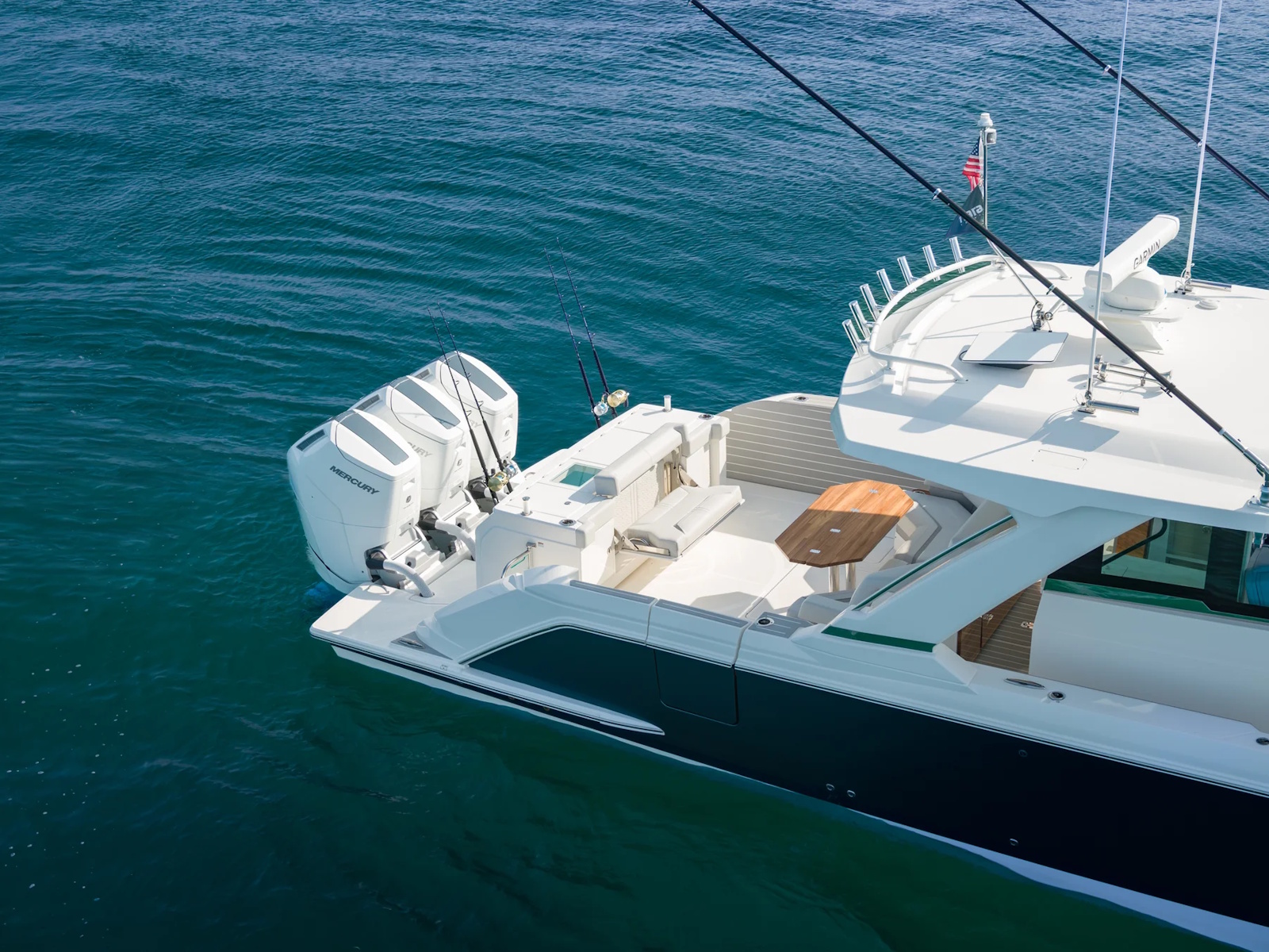 In partnership with Mercury, the 48 LS boasts the unwavering strength of the Verado® V12 600hp outboard engines. Combined with Tiara Yachts’ integrated electronics package and Garmin Marine navigation, the 600hp Verado® engines’ sophisticated, sound-dampening technology and innovative advancements in steering and control deliver the ultimate outboard-driving experience.