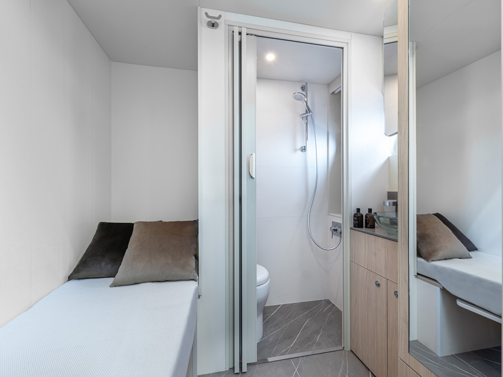 Beach Club by day and VIP cabin with an en-suite head by night: this alchemy is made possible thanks to the placing of the crew cabin—with 2 berths—directly accessible from the second starboard-side door.