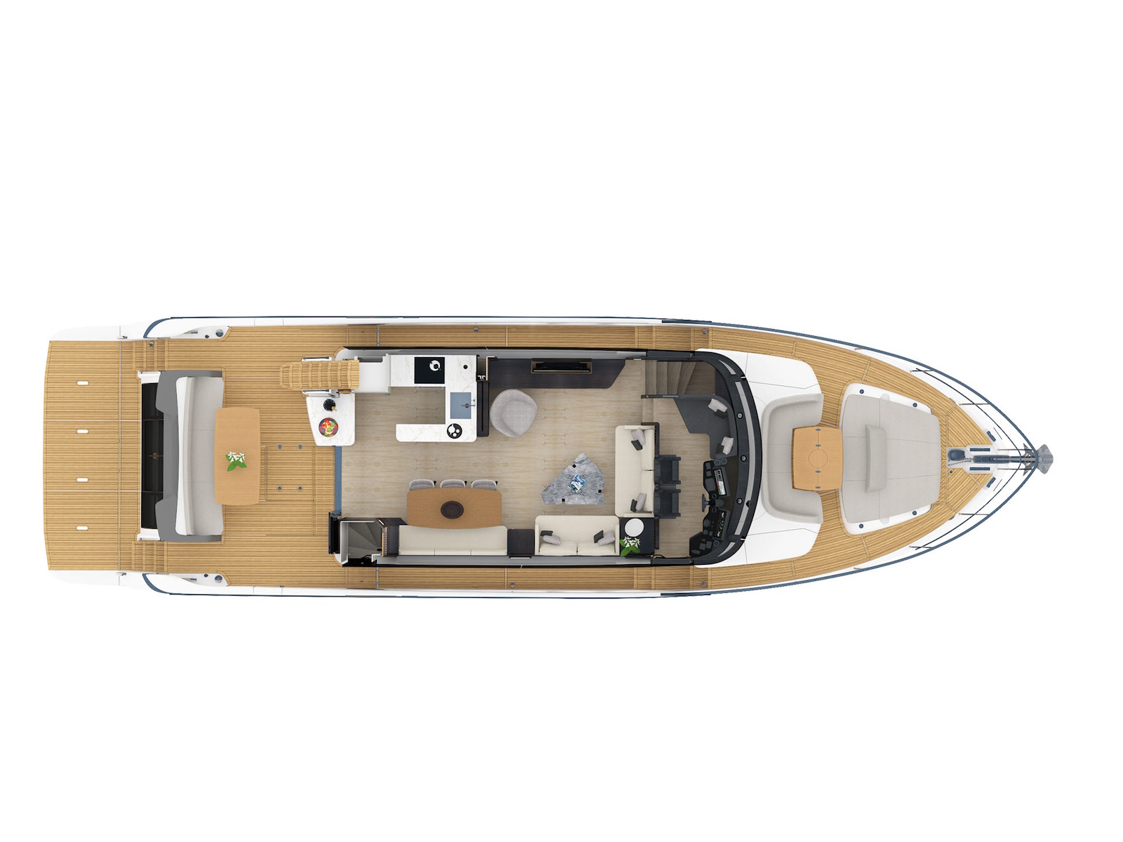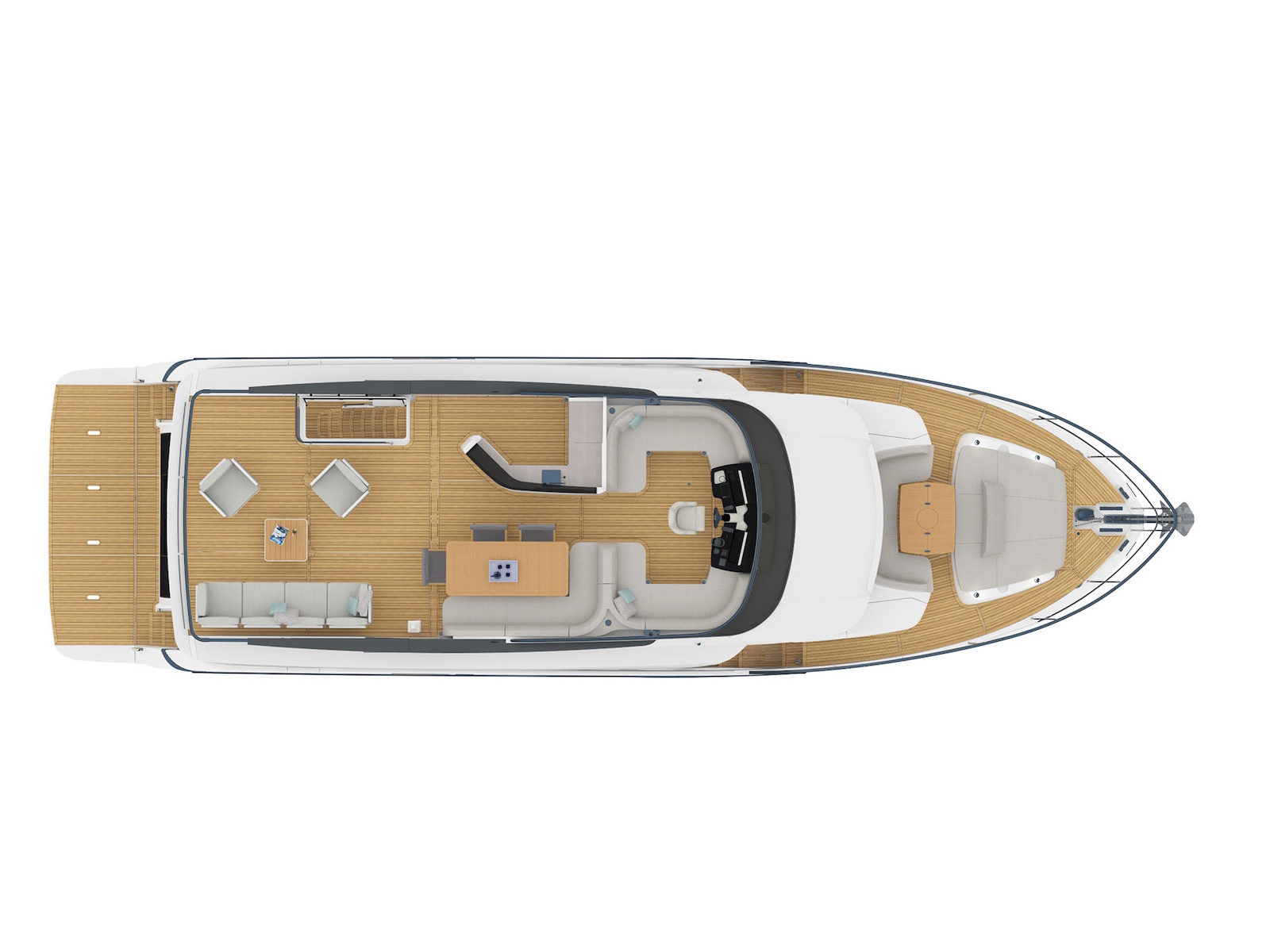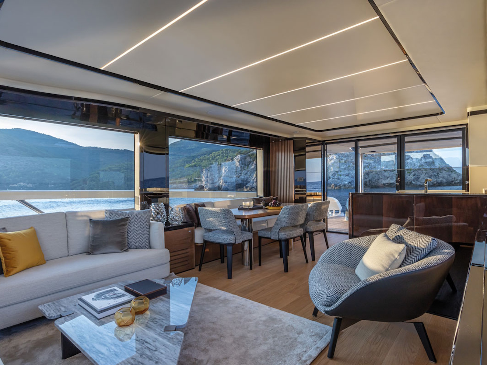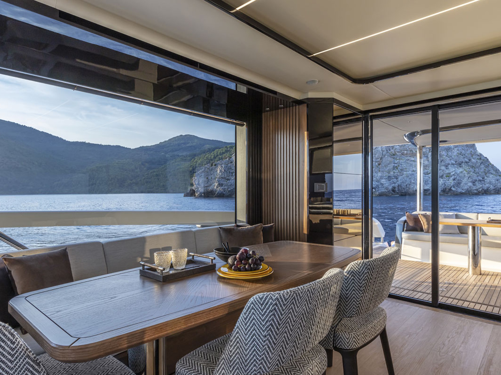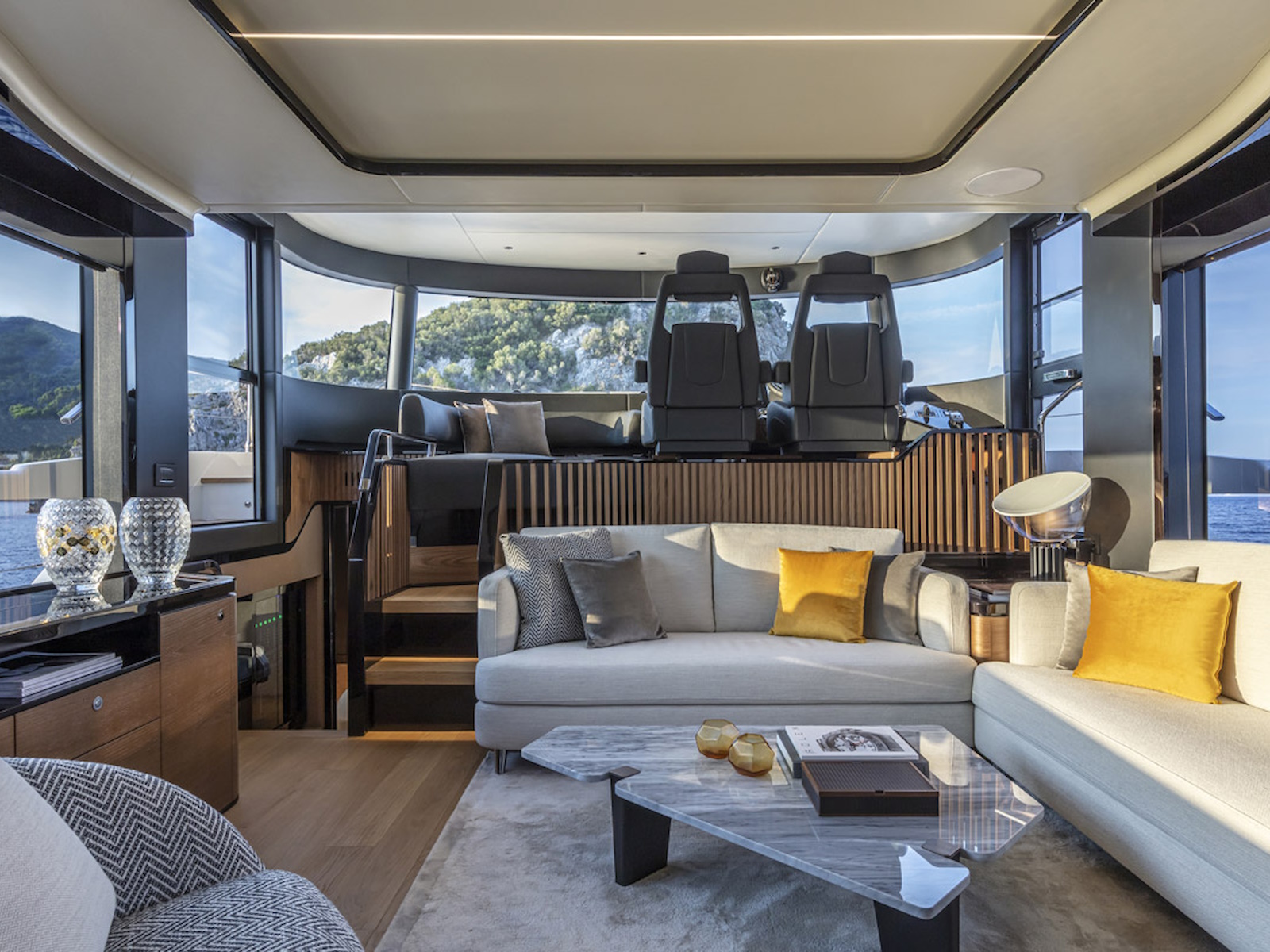 The flybridge has a far greater width than found on any other 64-foot yacht. On the main deck, the salon is surrounded by frameless glass windows, offering breathtaking panoramas. The comfortable sofas, the large table, the entertainment area, and the galley—easily connectable to the cockpit—top it all off. The entire main deck is overlooked by a raised helm and a massive windshield of over 10 feet, curved and frameless for absolute visibility.