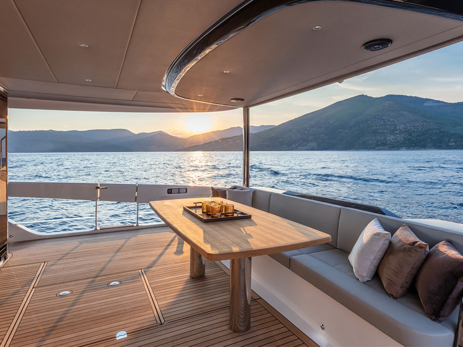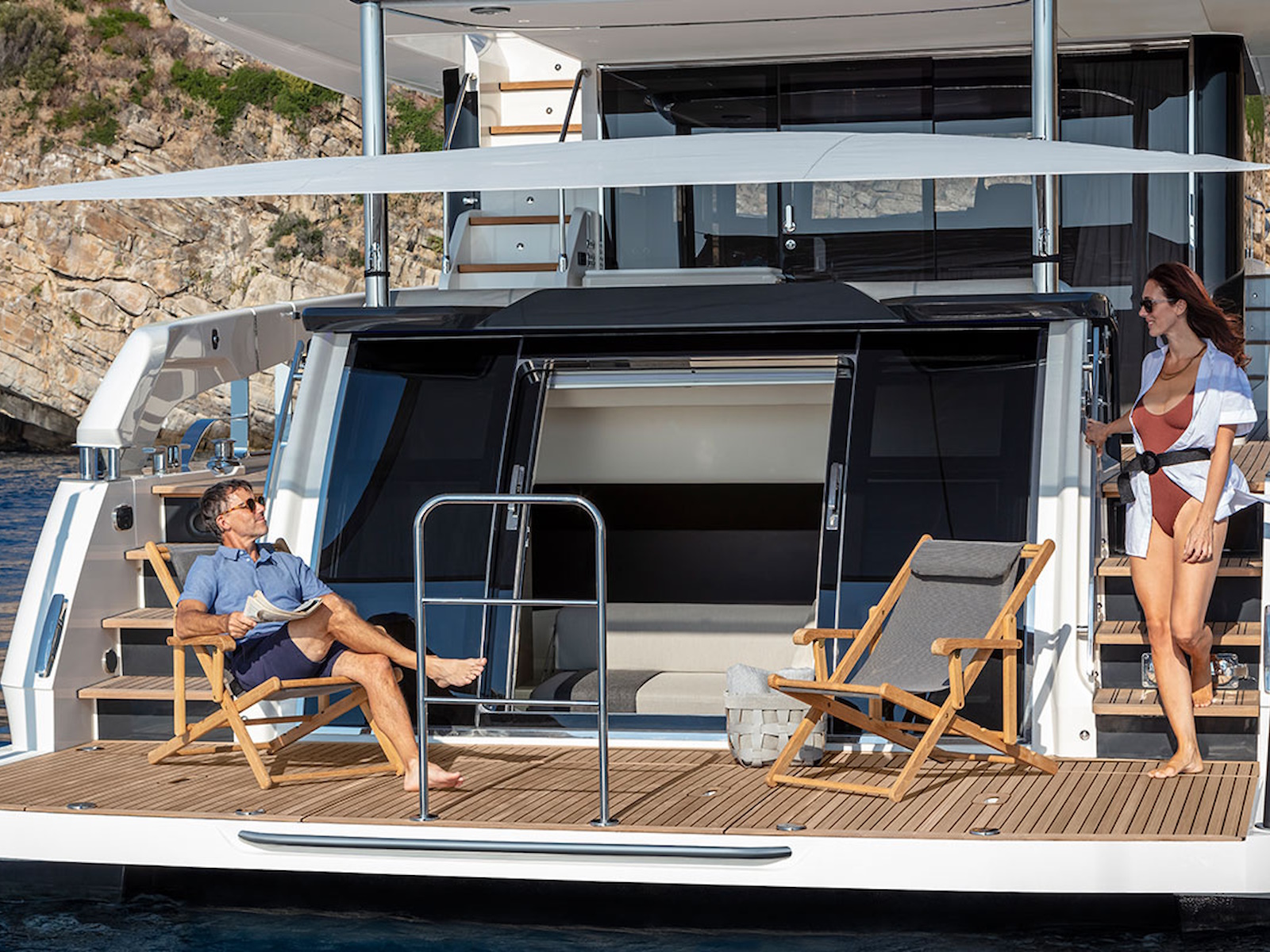 In the Beach Club version, the transom can be turned from a large storage space into an actual double cabin at the water’s surface sealed tight with a fully-glazed, certified watertight access door.