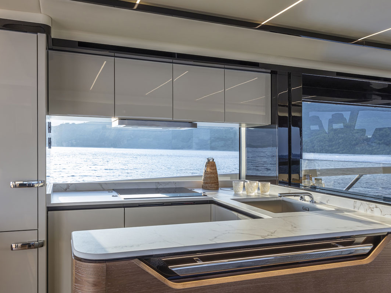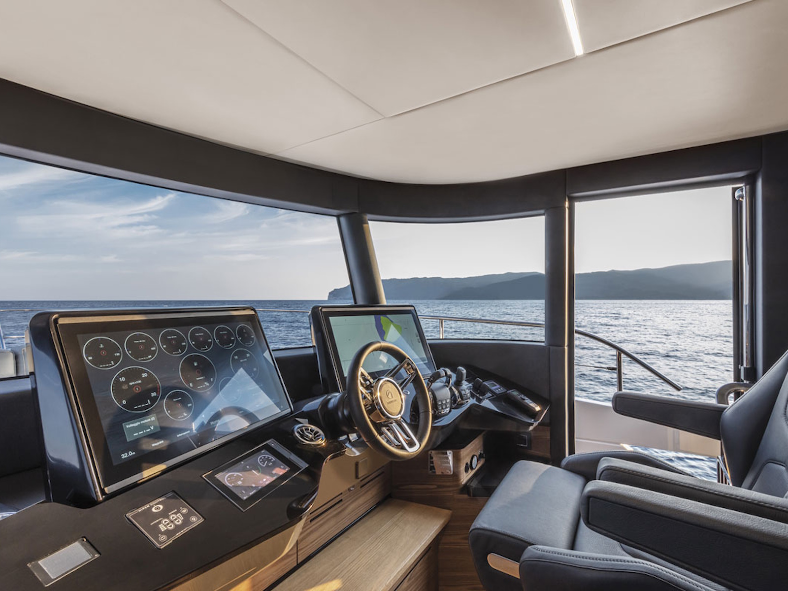 The wide and uninterrupted side-glass window, which runs from the aft mirror to the windshield, outlines her exterior shapes. These are characterized by the significant enlargement of the bow windows and the opening of the side gunwales in the cockpit.