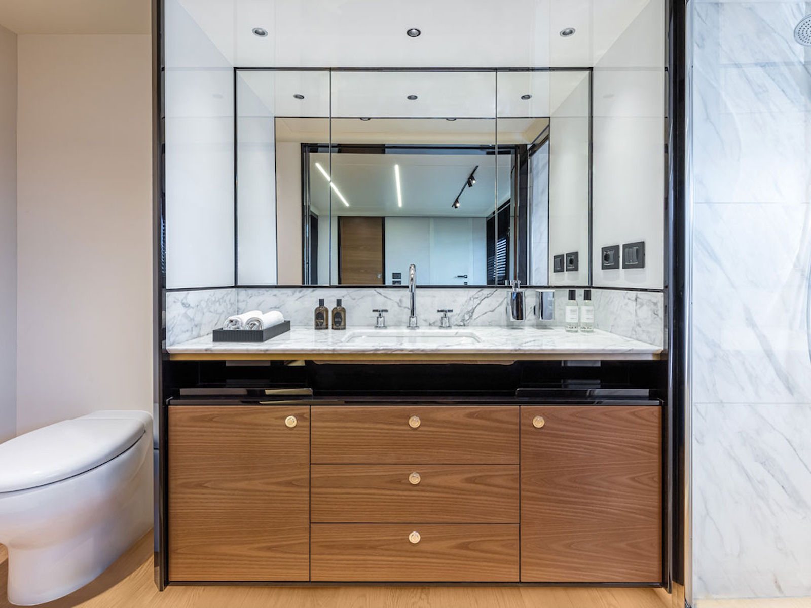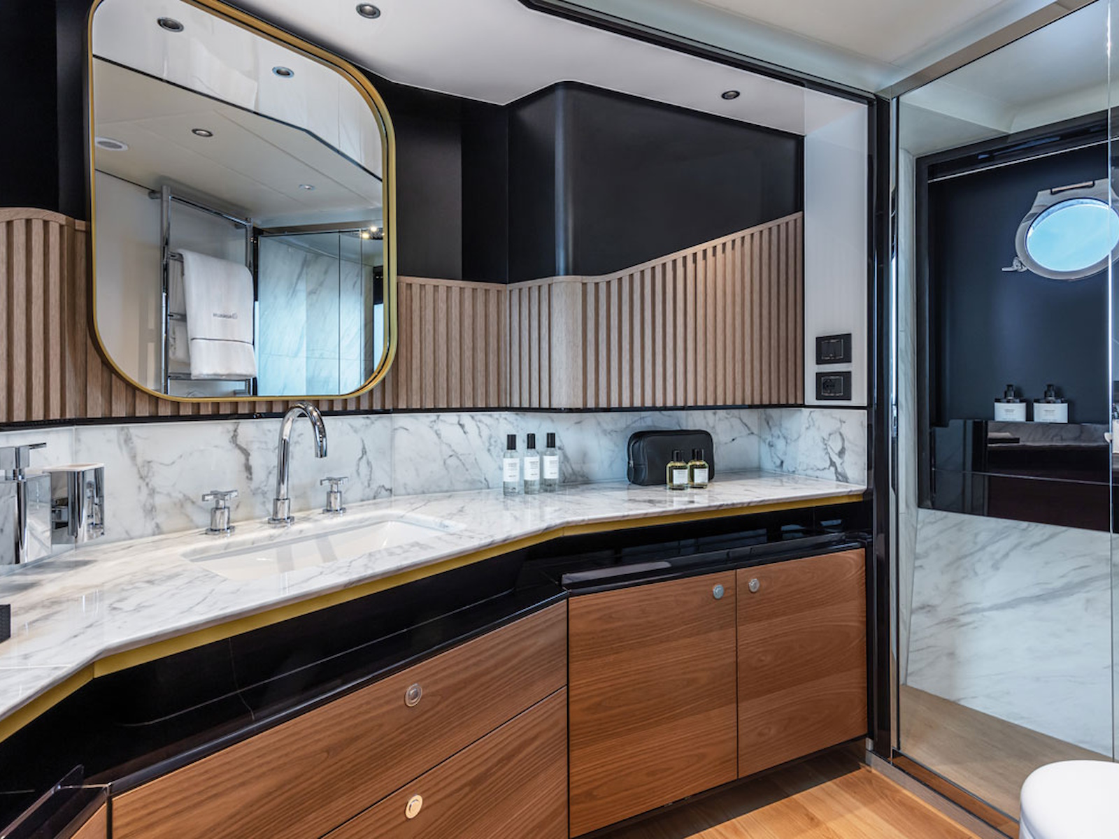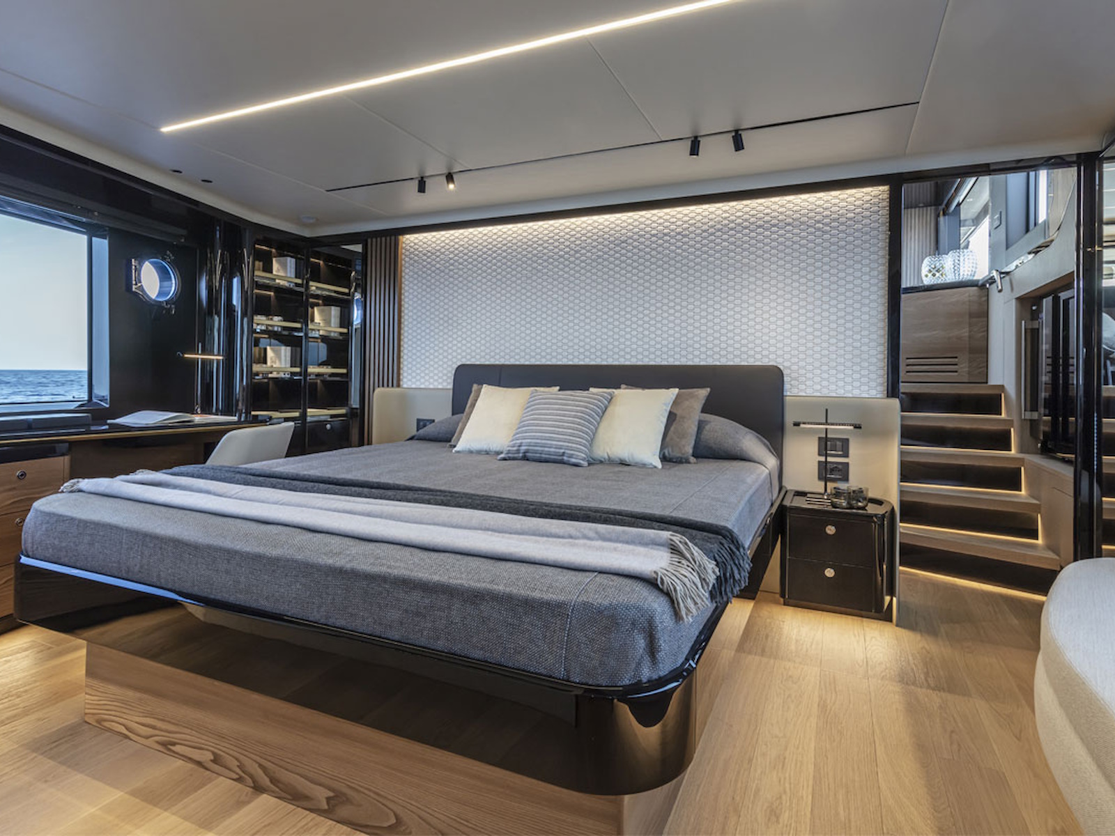 Aboard the Navetta 64, all spaces are designed to offer the maximum enjoyment of each cabin —always panoramic and bright, thanks to unprecedented-sized windows. In addition, the spaces are furnished and refined with everything you need to feel just like at home, without any sacrifices.