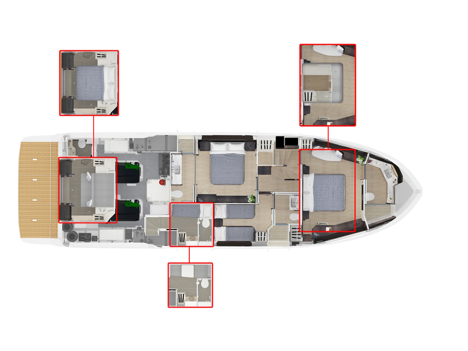 Below the deck, the master cabin is placed in the bow with a king-size berth, large side windows, and a full-beam head. The VIP suite really stands out: its livability is astounding and the materials selected are simply exquisite. Furthermore, the third cabin is a double stateroom with single beds. Finally, all cabins have en-suite heads.