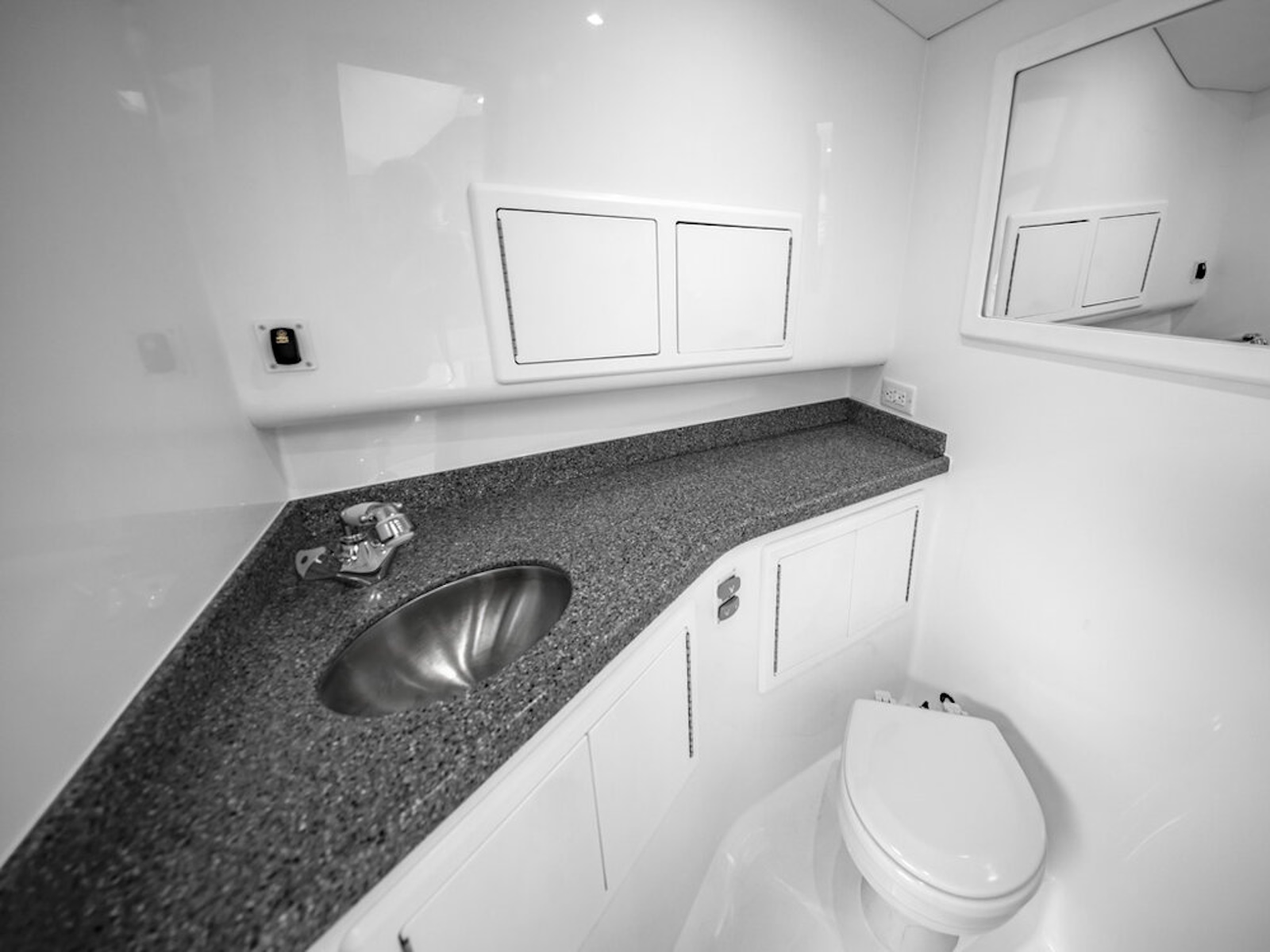 - Separate Head Compartment with Solid Surface Countertop and Sink
