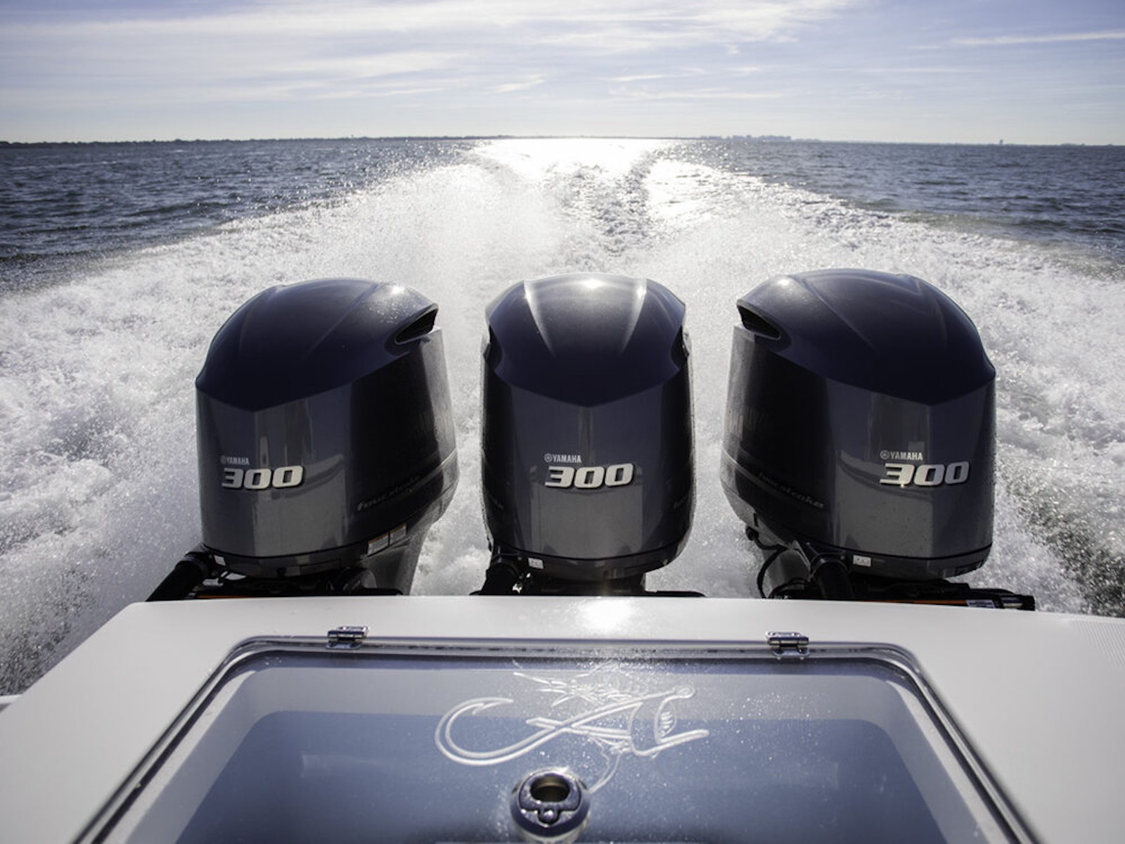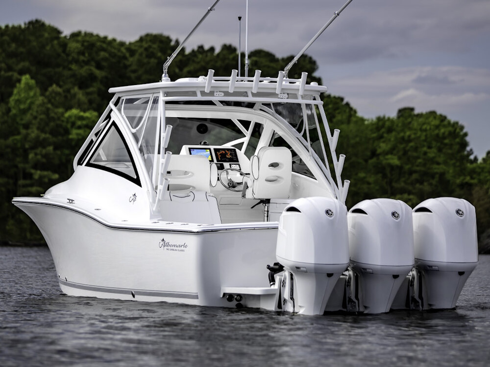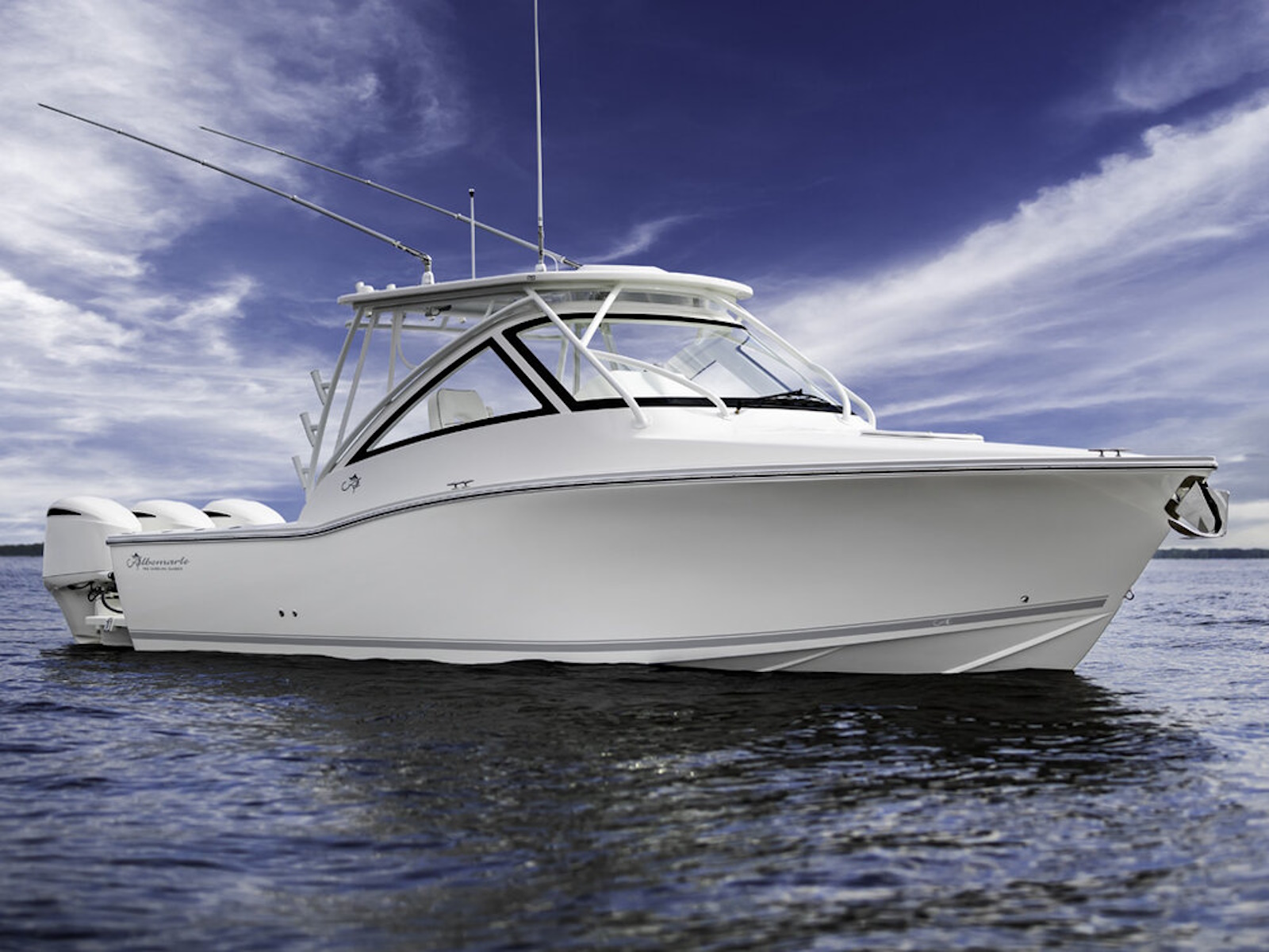 This new model will have a custom Carolina look and unsurpassed visibility from the helm with a standard rigid acrylic enclosure. She will have a standard anchor windlass system with through-stem roller and polished stainless-steel anchor. Every boat will be Seakeeper 2 ready with stringer beds in place. A triple 300 HP Yamaha option will provide the low-end torque needed to maintain slower cruise speeds on those sloppy days and make her the fastest Albemarle ever built. The hull is designed to bust through head seas, land softly in the troughs and keep the enclosure dry.