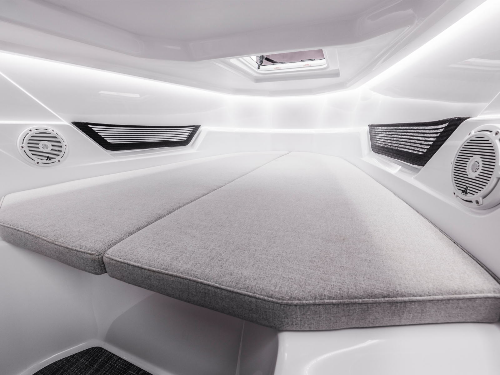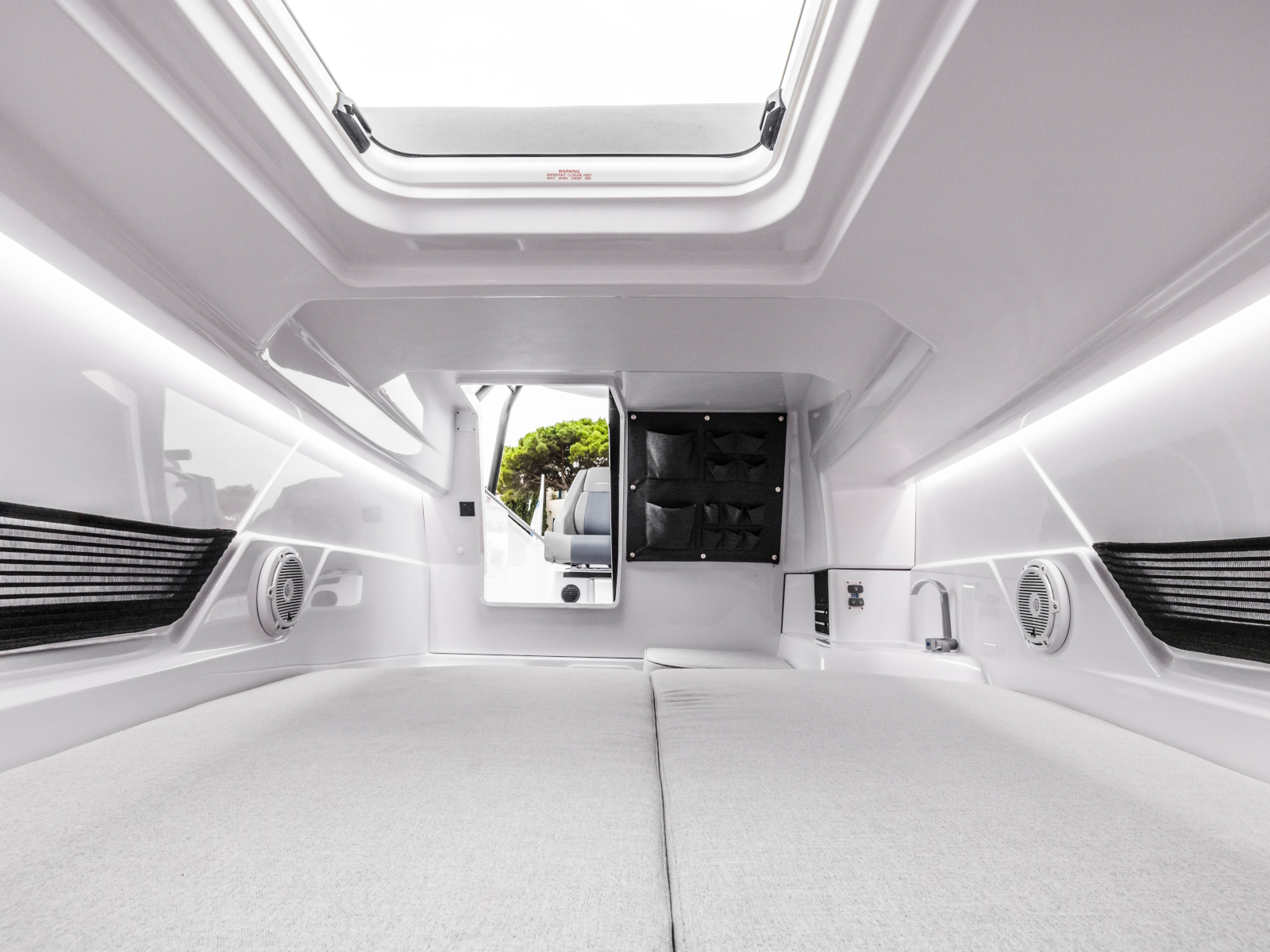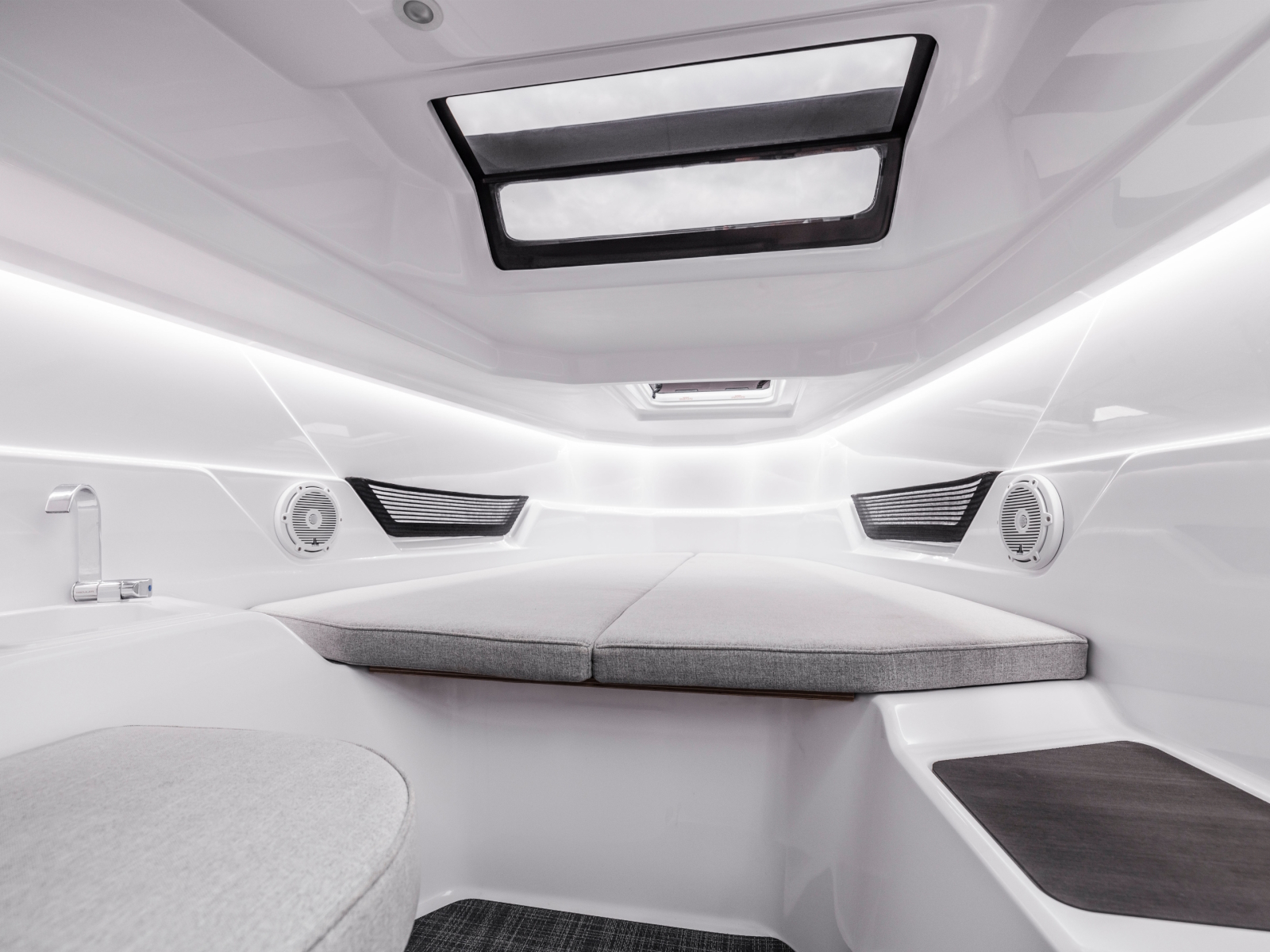 The ultra-cool looking Axopar 25 Cross Top has a raised ‘cuddy cabin’ sleeping accommodation, where the cabin defines the character of this remarkable new boat. A full width cushioned sundeck is positioned atop the cabin roof, with a sloping backrest that follows the rake of the front screen. The wide helm console and front screen offer a helm seating area with more space and room for a step through entrance to the front cabin, in a style used by other larger Axopar models.