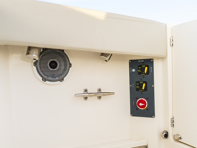 - JL Audio waterproof speakers (exterior, 7.7" aft cockpit (2), 7.7" coax and helm deck (4), Tweeter in hardtop at helm, 7.7" coax at bow (2), 10" sub-woofer at helm deck (1), 8" sub-woofer at bow (1), with JL Audio amplifiers)