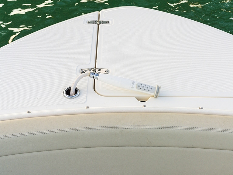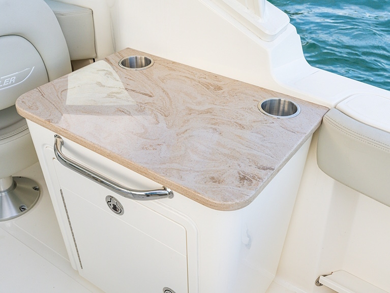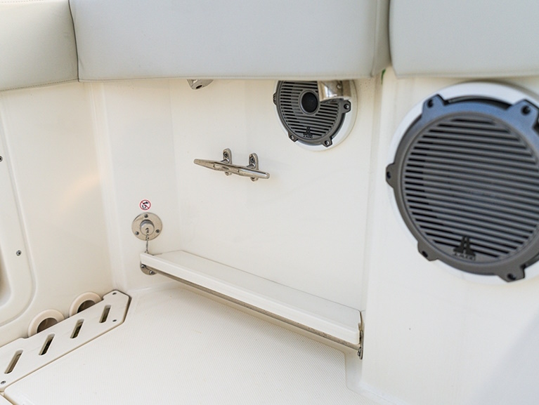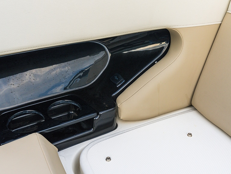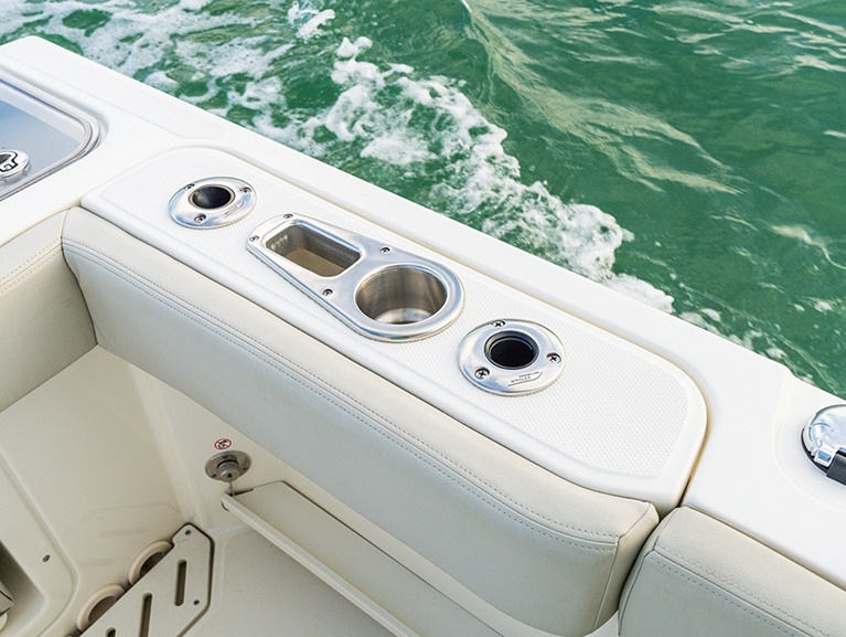 - Drink holders (stainless steel) - bow (9), helm (4), prep station (3), second row seating (3), forward console lounge (3), cockpit gunnel boards (2)
