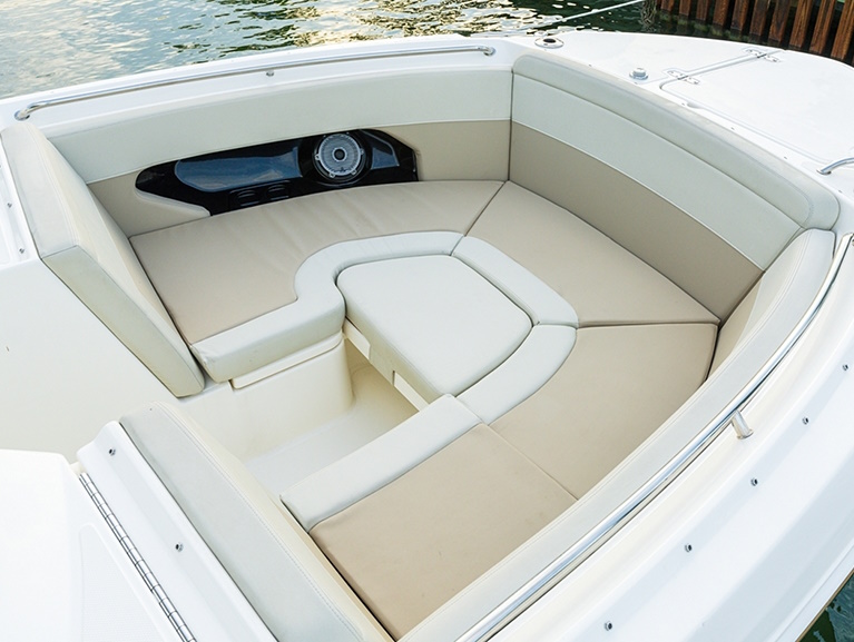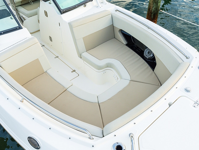- Bow wrap-around seating with drink holders (4), full height forward bolster and removable cushions