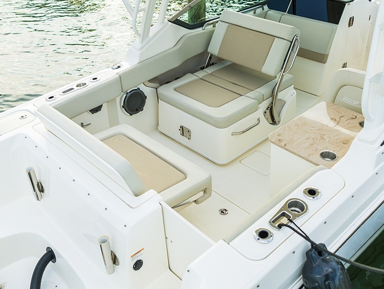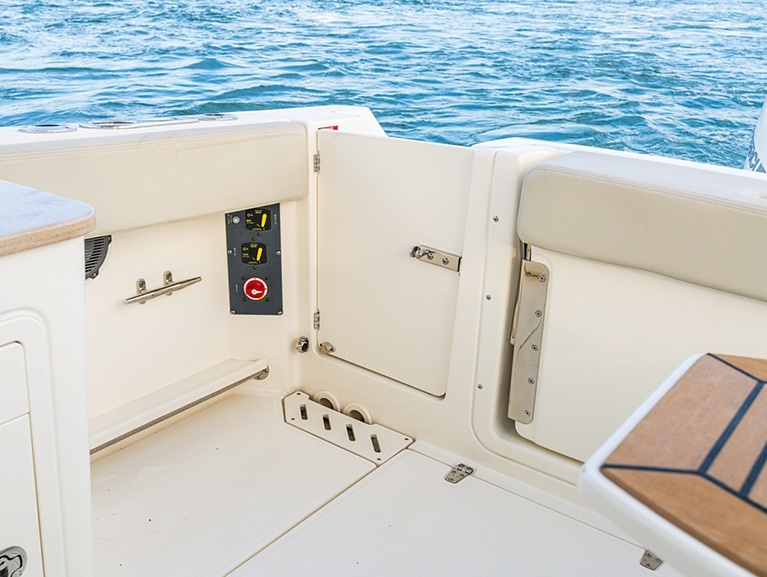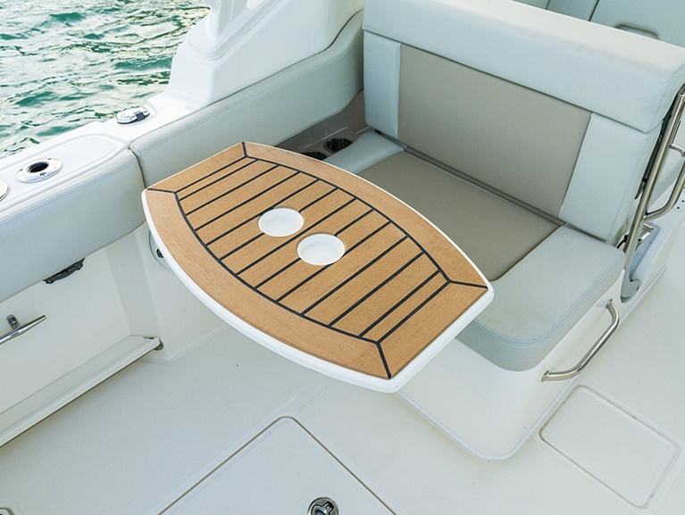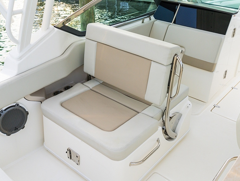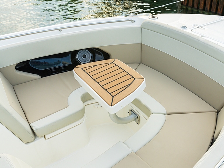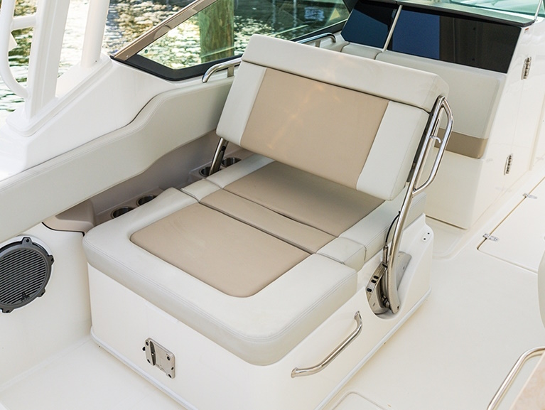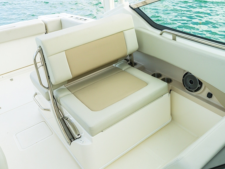 - Deluxe swivel 2-person helm seat with armrests (adjustable electric slide and 180-degree rotation creating an apposed seating conversation and dining area)