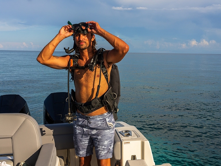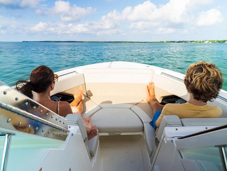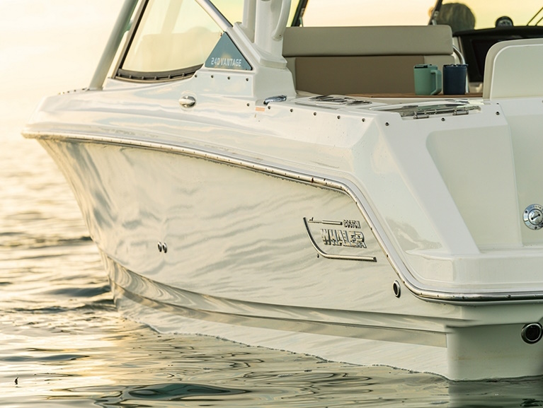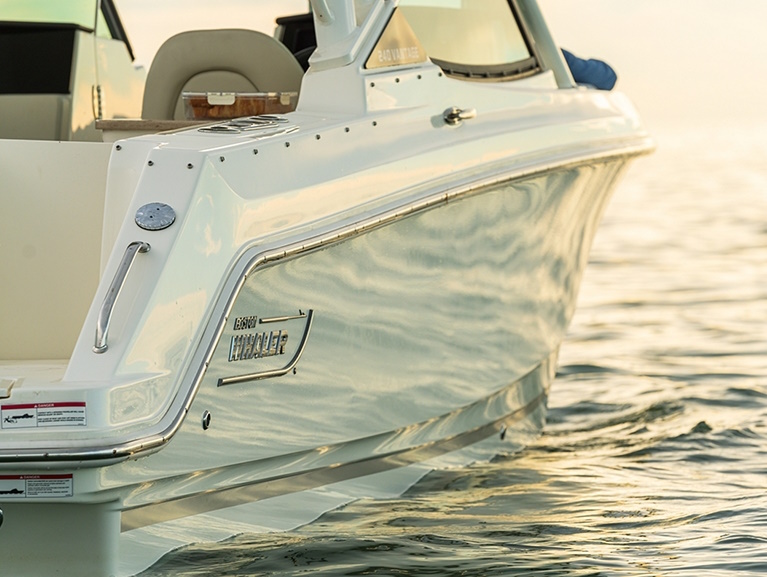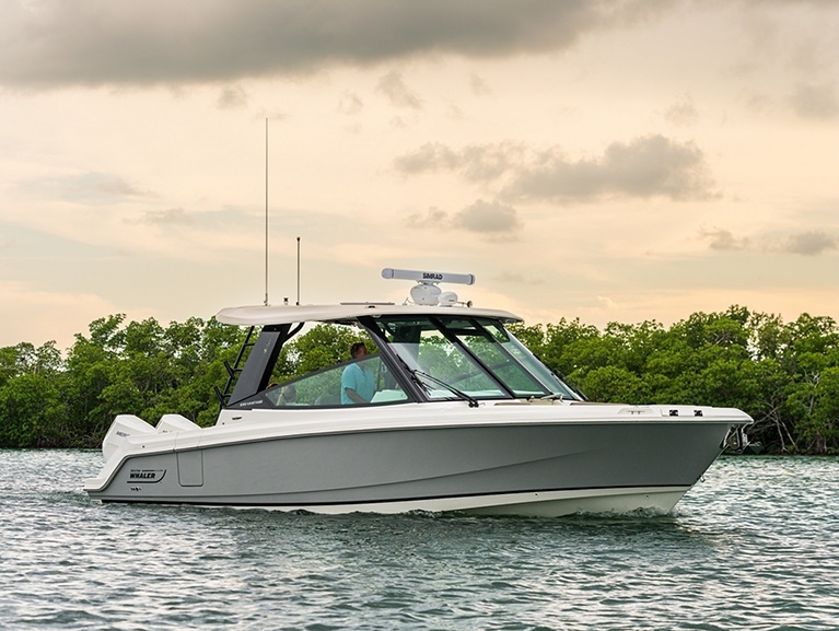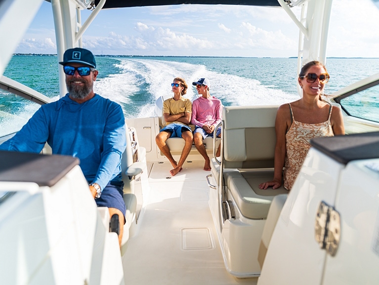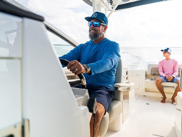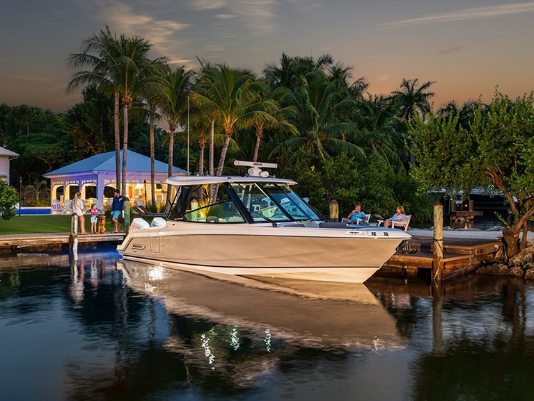 At nearly 40 feet and with a maximum 1,600 horsepower, the 380 Realm express cabin cruiser is a sleek and powerful offshore boat that synthesizes sumptuous comfort amenities, advanced power and performance, and a peerless fishing experience. The commanding center console layout provides seamless Simrad® integration with all navigation and power functions, and the customizable aft deck is ideal for angling or entertaining. Below deck, you’ll find a stunningly appointed cabin with refined and relaxing features that make short or long stays on the water transformative. Explore the many benefits of this 38-ft. express cruiser boat today, and finally make your grandest boating dreams real.