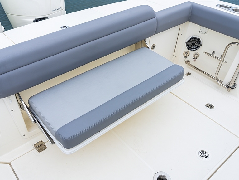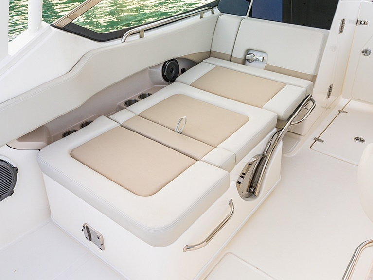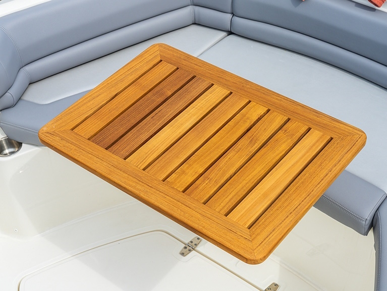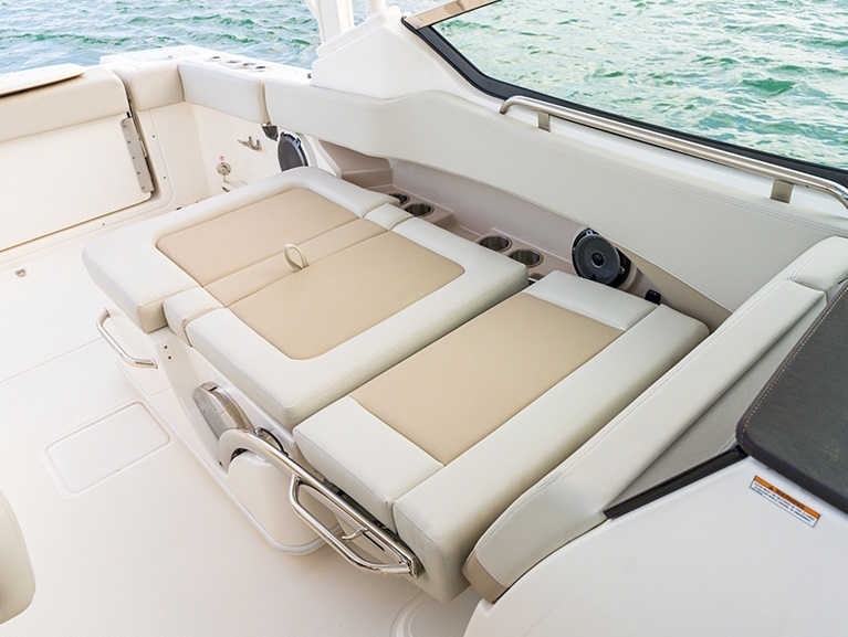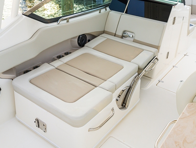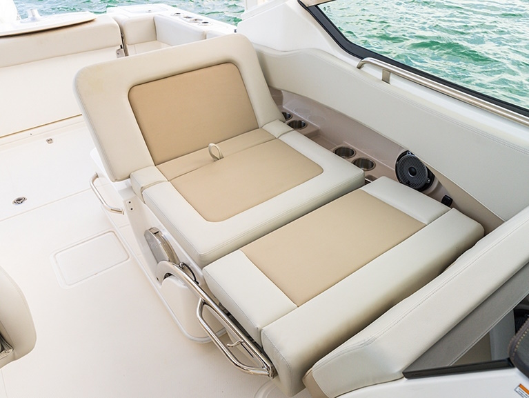 - Helm deck second row with 2-person seat with a conversation seatback transforming to an aft facing seat with flip-down teak foot rests